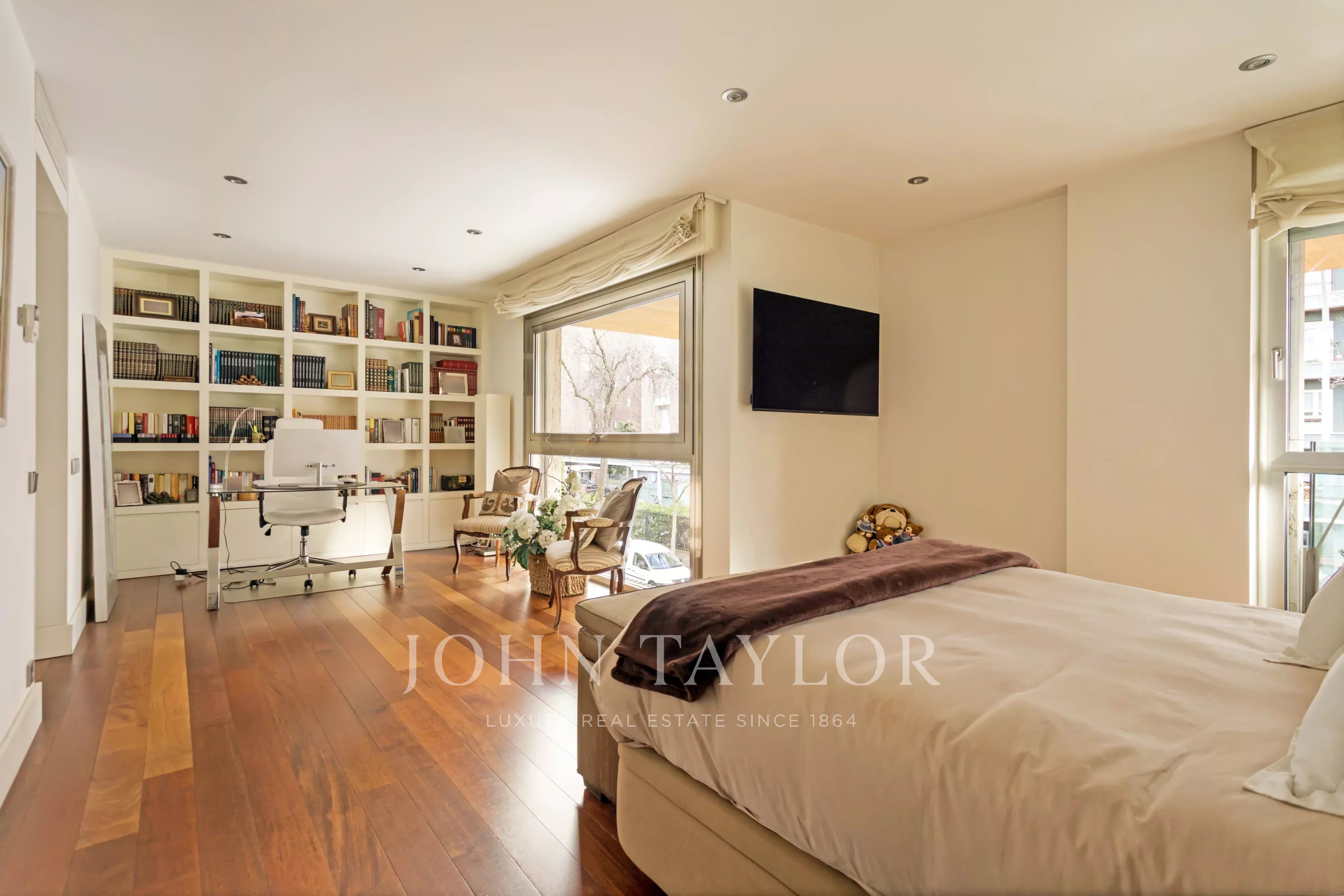 Der Schlafbereich besteht aus drei geräumigen Schlafzimmern, alle mit eigenem Bad. Eines der Schlafzimmer hat einen direkten Zugang zur Terrasse. Das Hauptschlafzimmer bietet zwei verschiedene Umgebungen, Lesebereich und / oder Büro und Schlafbereich mit Ankleideraum, hat vom Boden bis zur Decke reichende Fenster, ungehinderten Blick und Südlage.