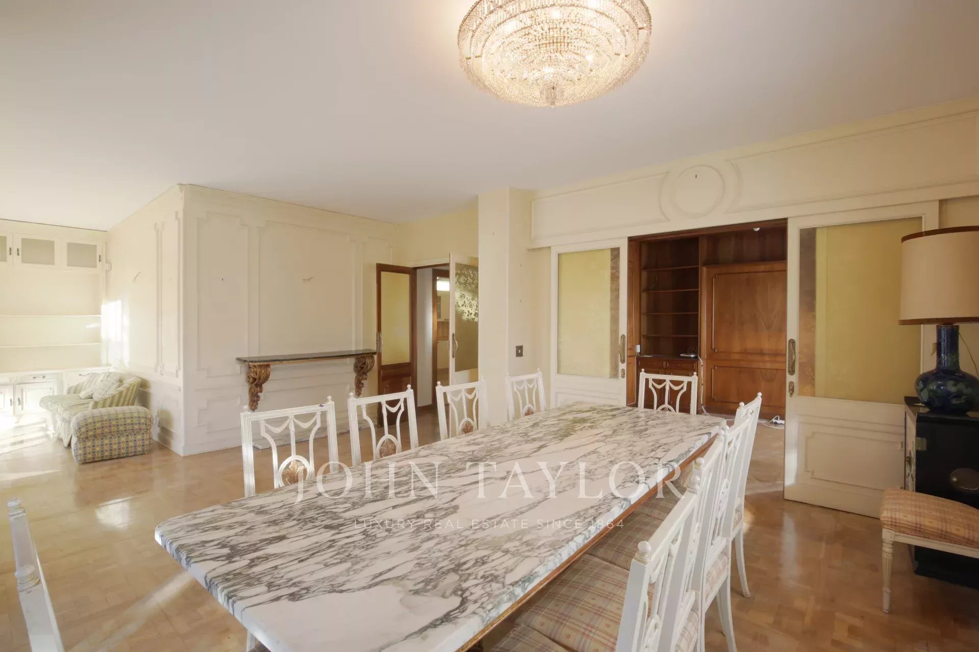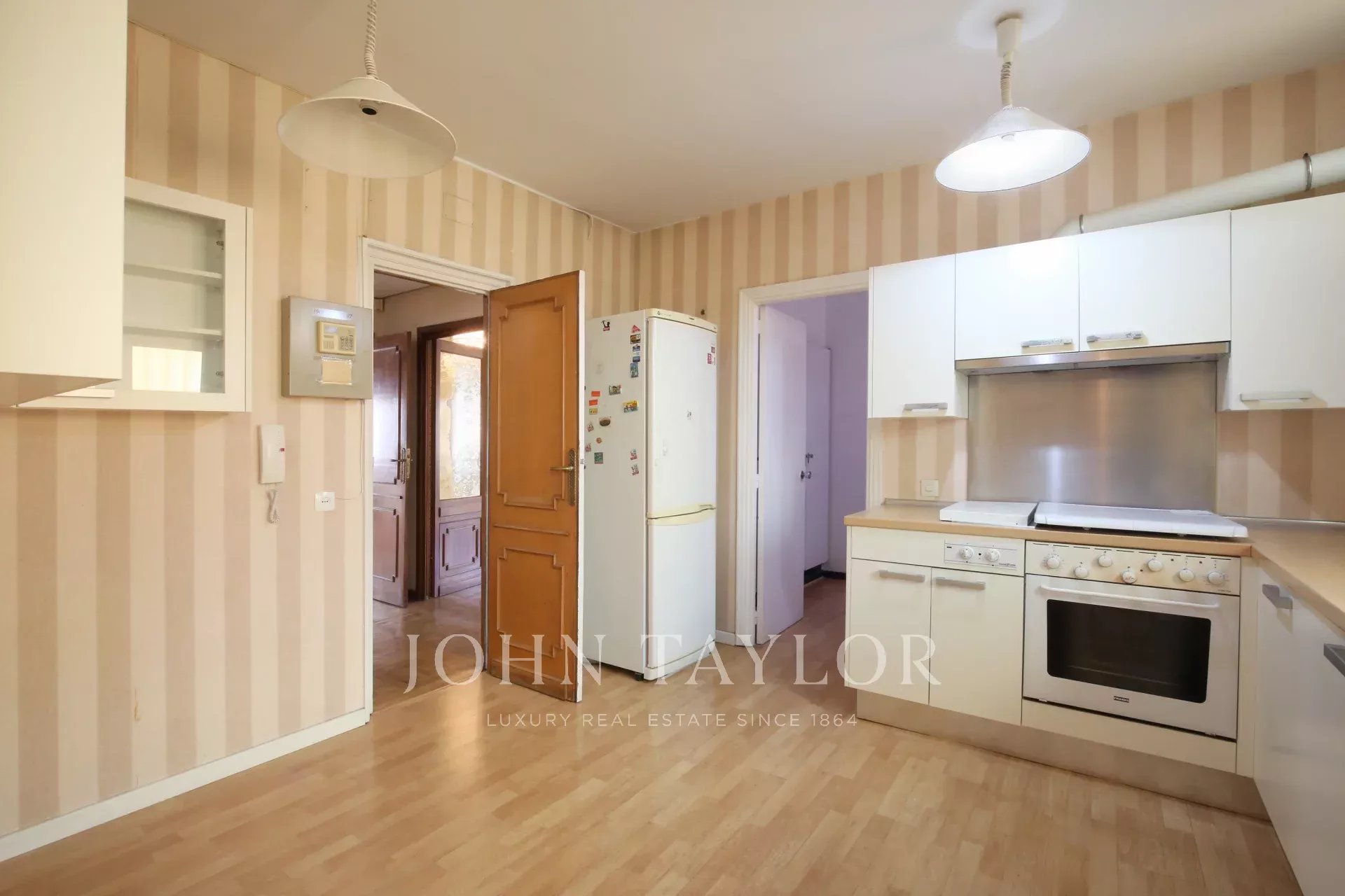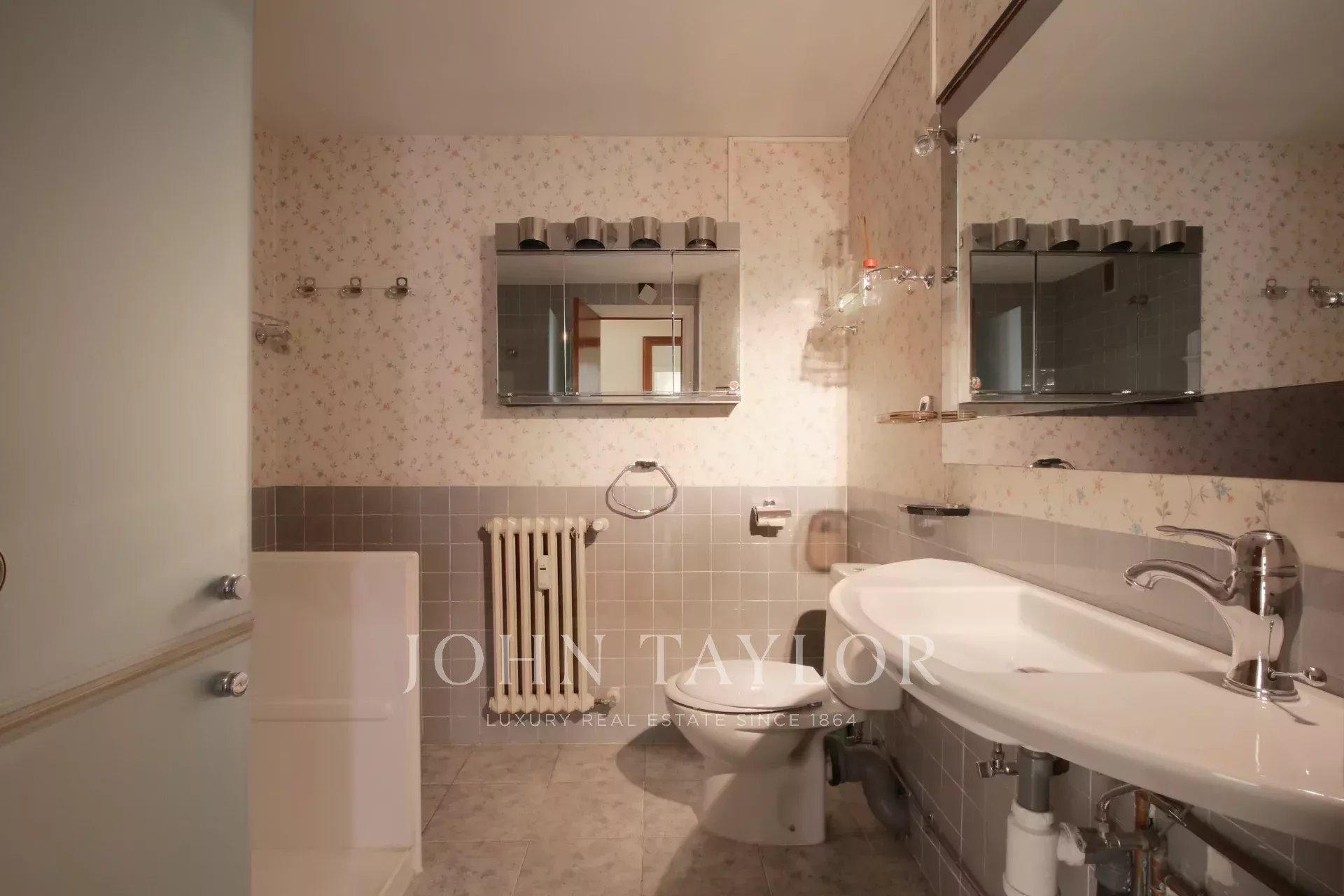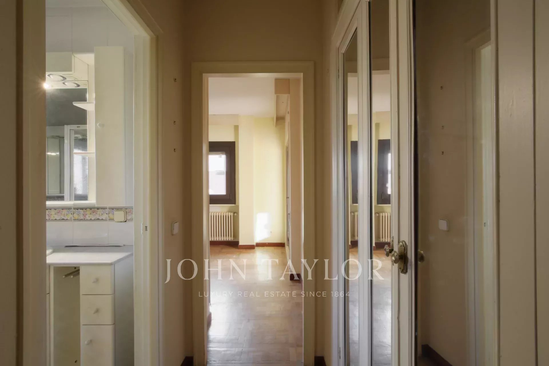 Das 1970 erbaute Gebäude verfügt über eine Zentralheizung, einen Aufzug und einen Pförtnerdienst, die Komfort und Sicherheit garantieren. Obwohl die Immobilie renovierungsbedürftig ist, ermöglichen ihre Geräumigkeit und Struktur die Gestaltung einer modernen und individuellen Wohnung, die auch den anspruchsvollsten Bedürfnissen gerecht wird.