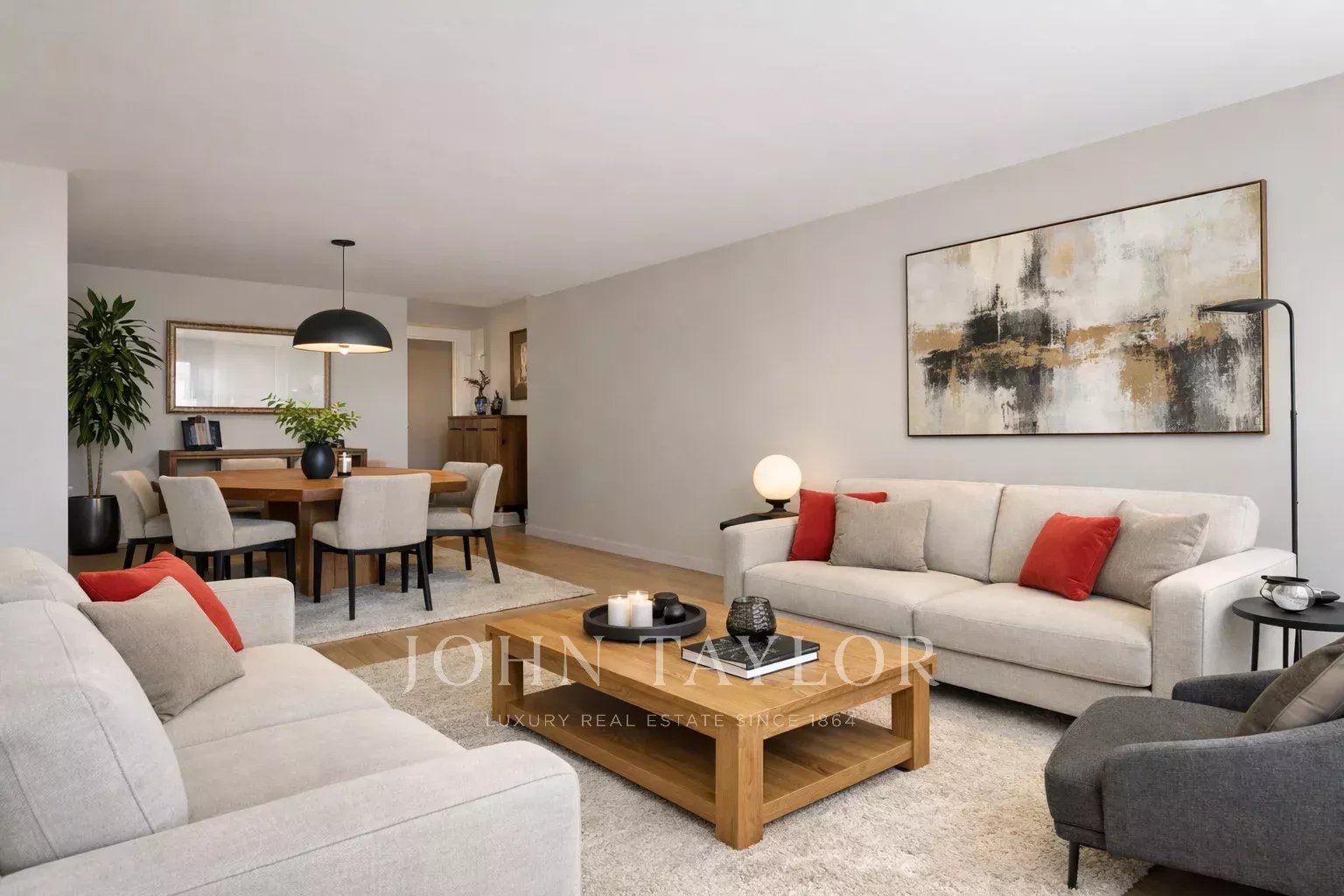 Der soziale Bereich besteht aus einem Wohn- und Esszimmer, das sich durch großzügige, nach Osten ausgerichtete Fenster nach außen hin öffnet und so eine außergewöhnliche Helligkeit und einen direkten Zugang zu einer privaten Terrasse garantiert.