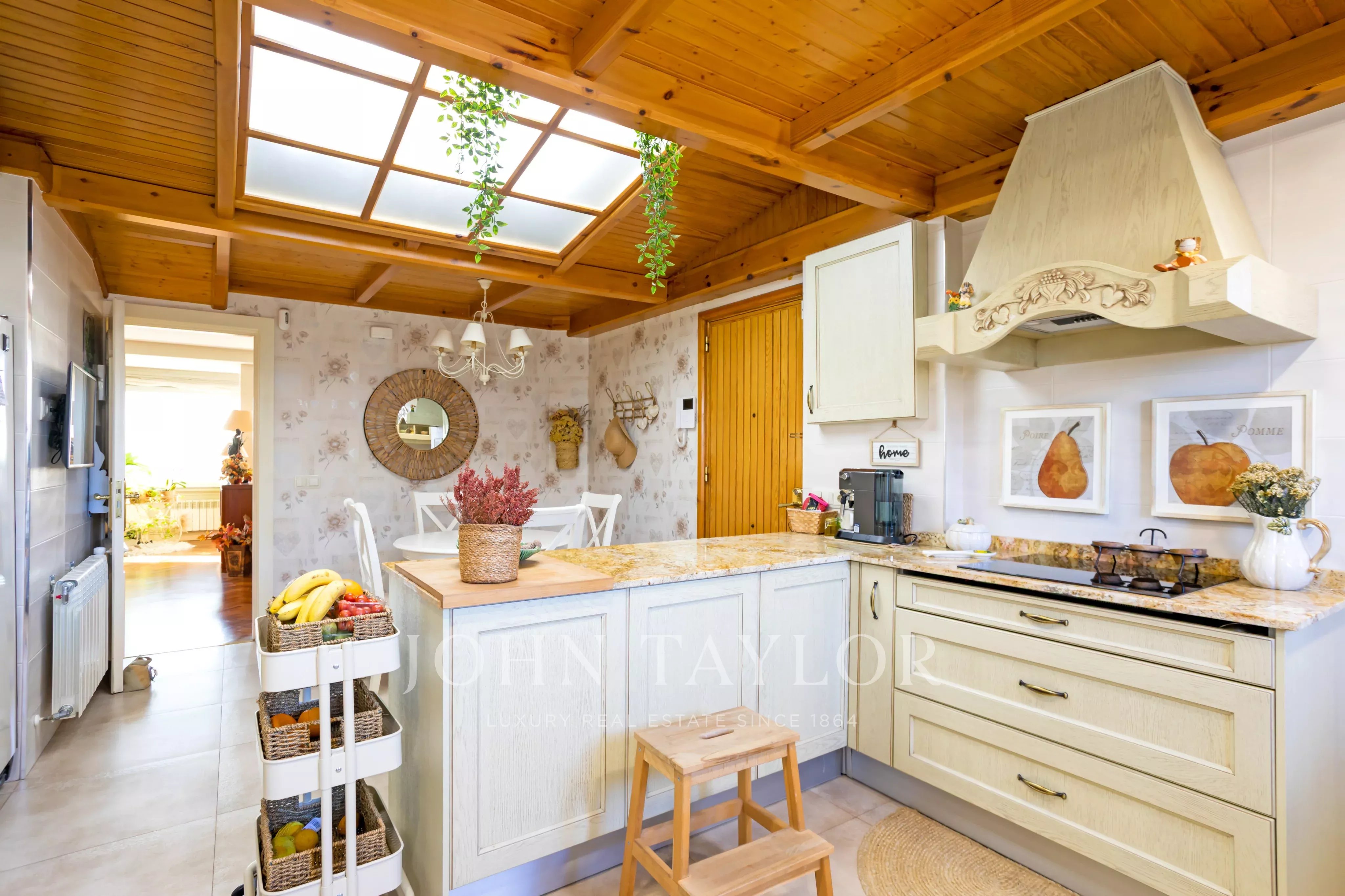 Der Sozialbereich besteht aus einem geräumigen Wohn-Esszimmer von ca. 50 m² mit Südausrichtung und großen Fenstern, die einen herrlichen Einfall von natürlichem Licht garantieren. Die großzügige Küche verfügt über einen Bürobereich und einen separaten Trockenraum.
