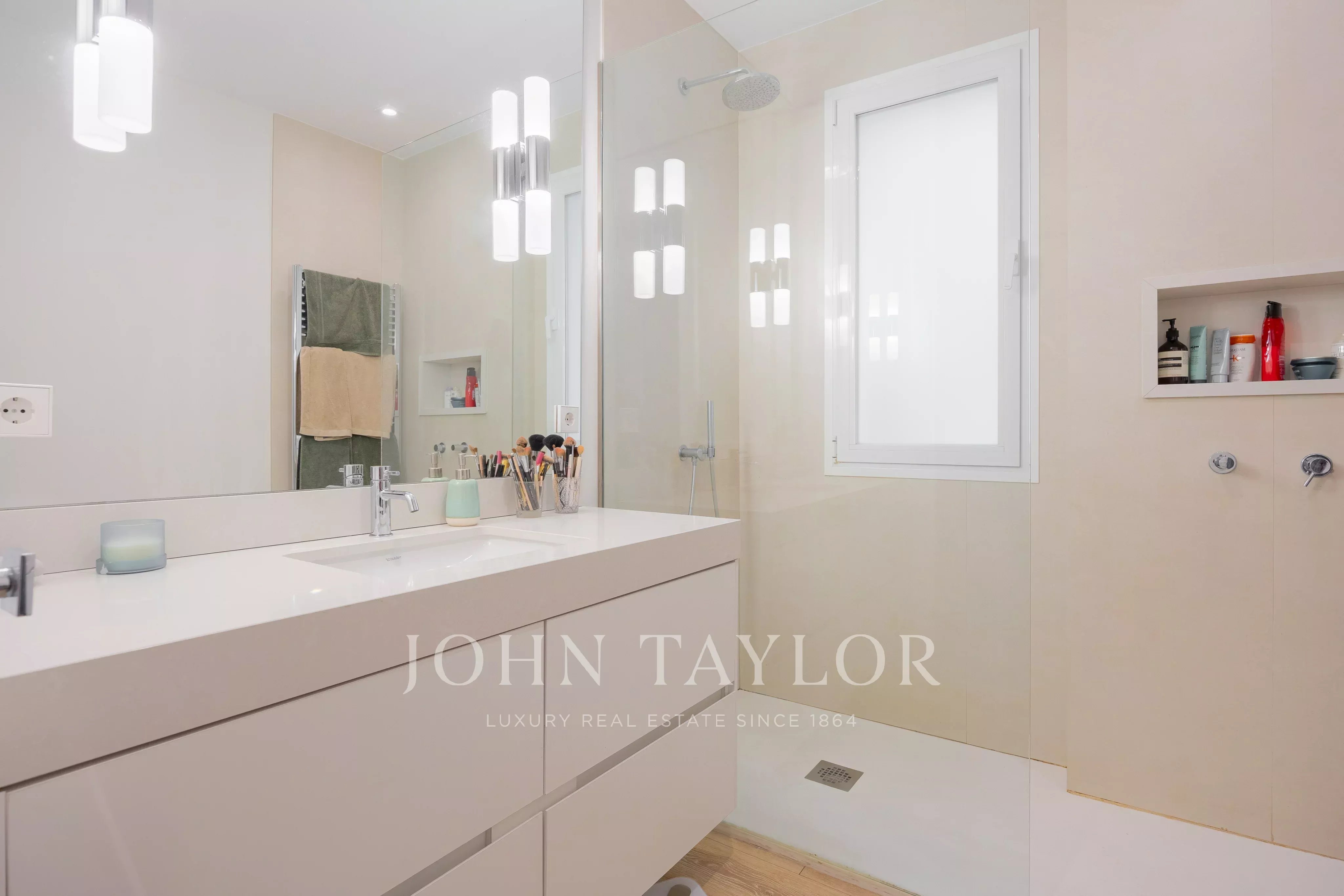 Die Immobilie bietet zwei geräumige Schlafzimmer und zwei angenehme Wohnzimmer, die vielseitige Räume schaffen, die sich natürlich an das Stadtleben anpassen. Die großzügigen Fenster mit Schiebetüren durchfluten jeden Raum mit natürlichem Licht, was die Raumgröße und das Wohlbefinden betont.