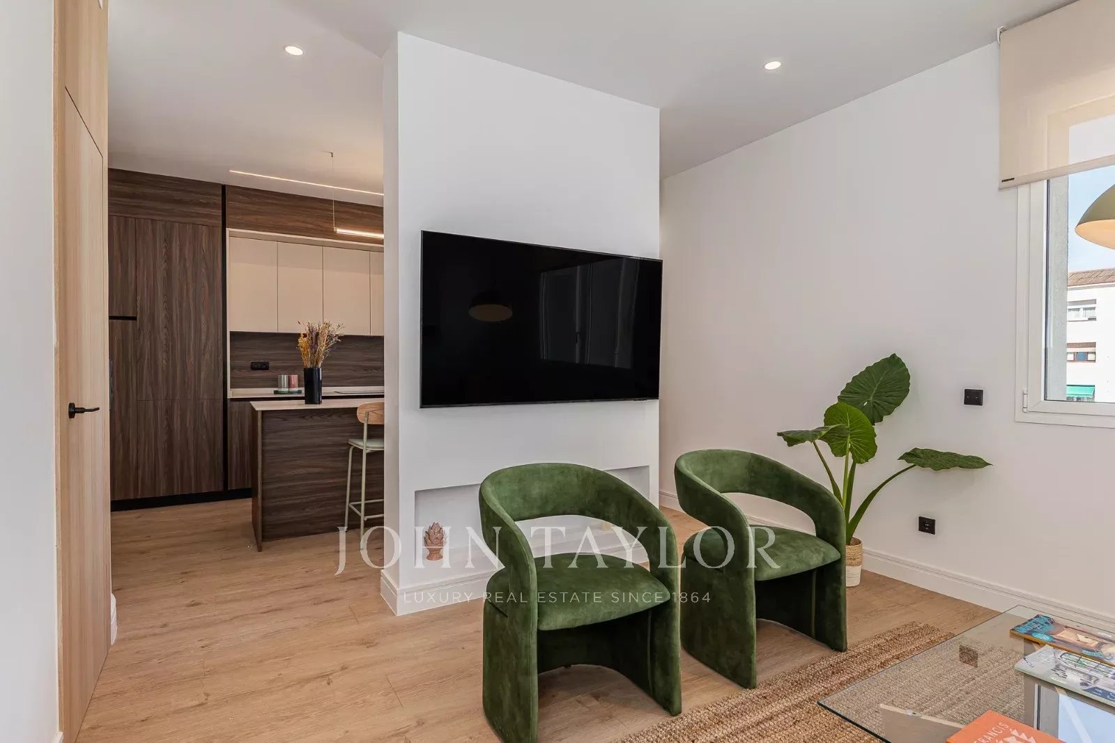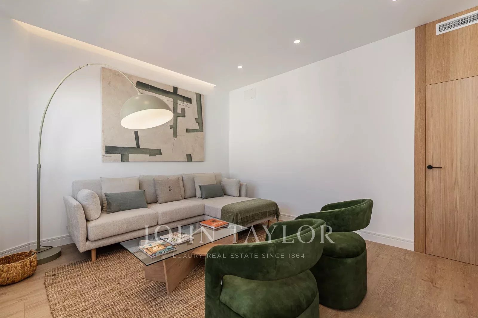 Diese stilvolle und komplett möblierte Wohnung befindet sich im begehrten Stadtteil Retiro Ibiza in Madrid. Die 120 m² große Immobilie bietet großzügige und helle Räume, die ein modernes und komfortables Wohnambiente schaffen. Das Wohnzimmer überzeugt mit eleganter Einrichtung, geschmackvollen Deko-Elementen und großen Fenstern, die viel Tageslicht hereinlassen.