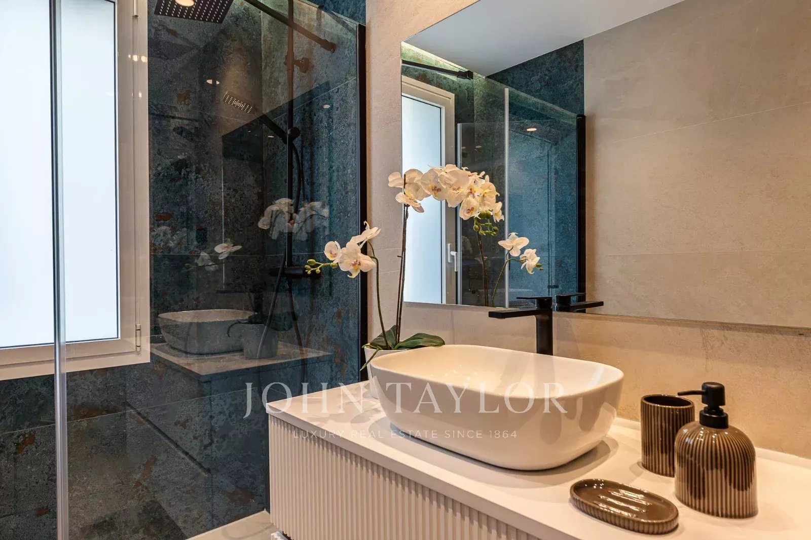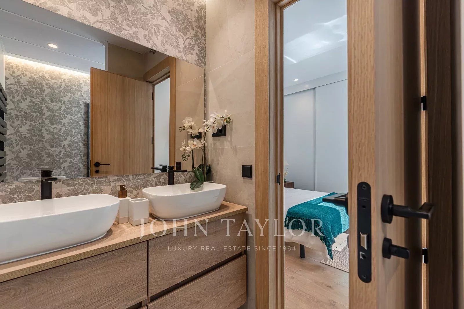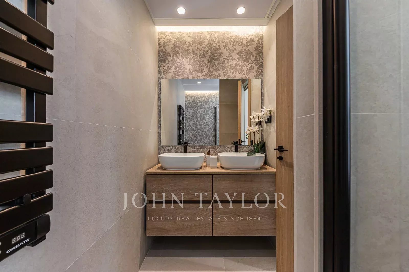 Das Apartment verfügt über insgesamt drei Schlafzimmer, eine hochwertige Klimaanlage, Außenbeleuchtung sowie einen Aufzug für maximalen Komfort. Die offene Küche ist mit modernen Geräten ausgestattet und der Wohnbereich lädt zum Entspannen oder zum Empfang von Gästen ein. Die hochwertige Möblierung unterstreicht das exklusive Wohngefühl.