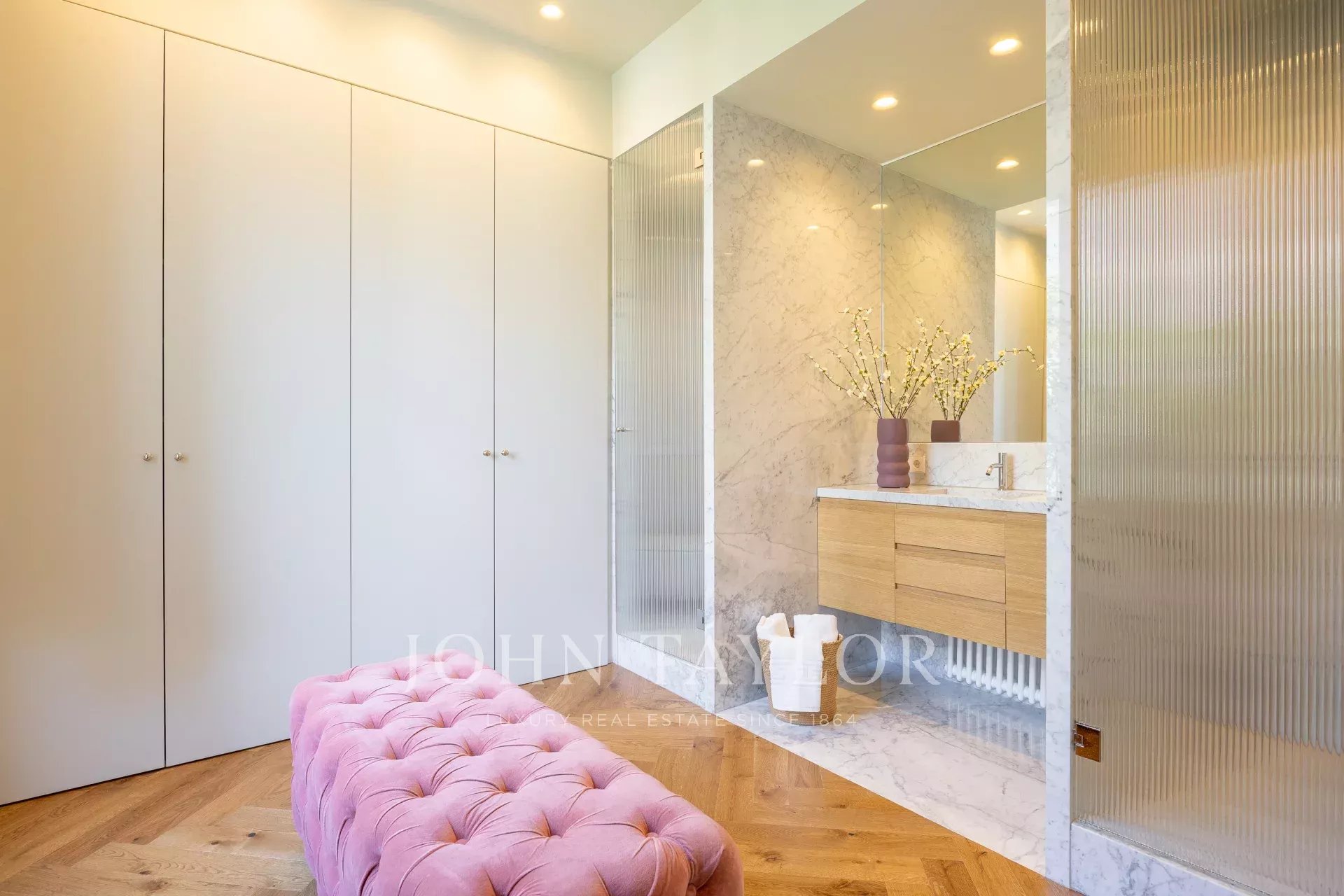 Der Schlafbereich besteht aus vier Schlafzimmern und vier Bädern: Die Master-Suite verfügt über vier Balkone, die das Schlafzimmer und das Bad in Licht tauchen. Eine zweite Suite mit eigenem Bad und Ankleidezimmer und zwei weitere Schlafzimmer teilen sich ein Familienbad. Eine Gästetoilette, ein großer Servicebereich mit Schlafzimmer und Bad für das Hauspersonal sowie ein großer Waschraum vervollständigen den Komplex. Außerdem gibt es eine herrliche Küche mit einer zentralen Insel und direktem Zugang zum Esszimmer.