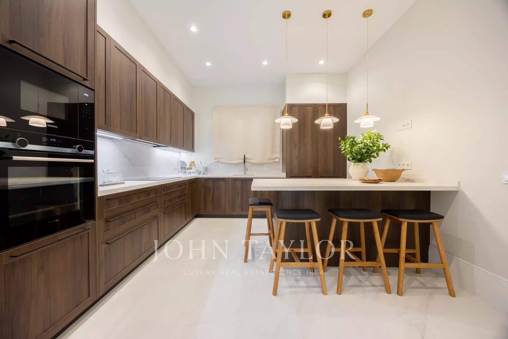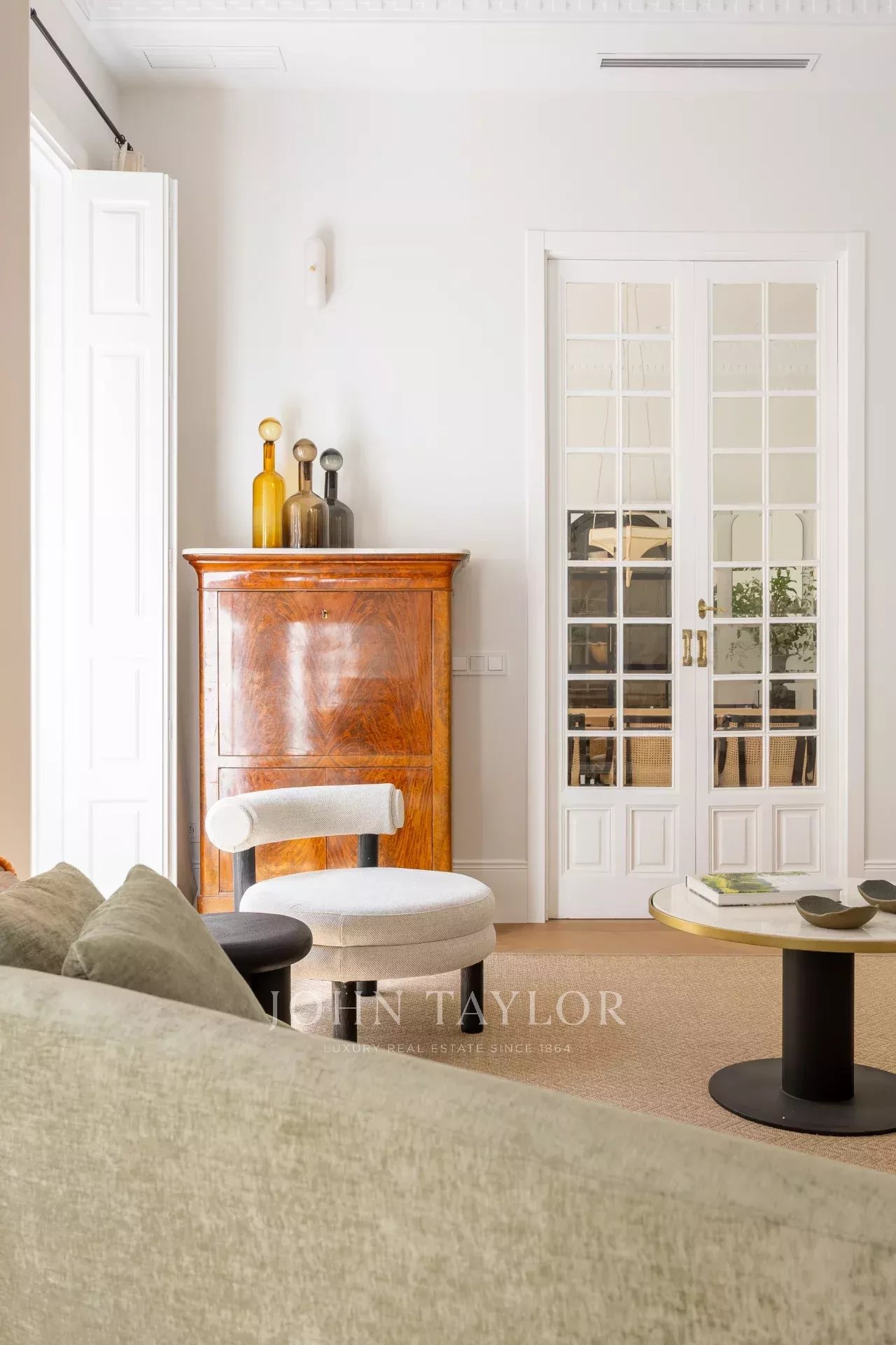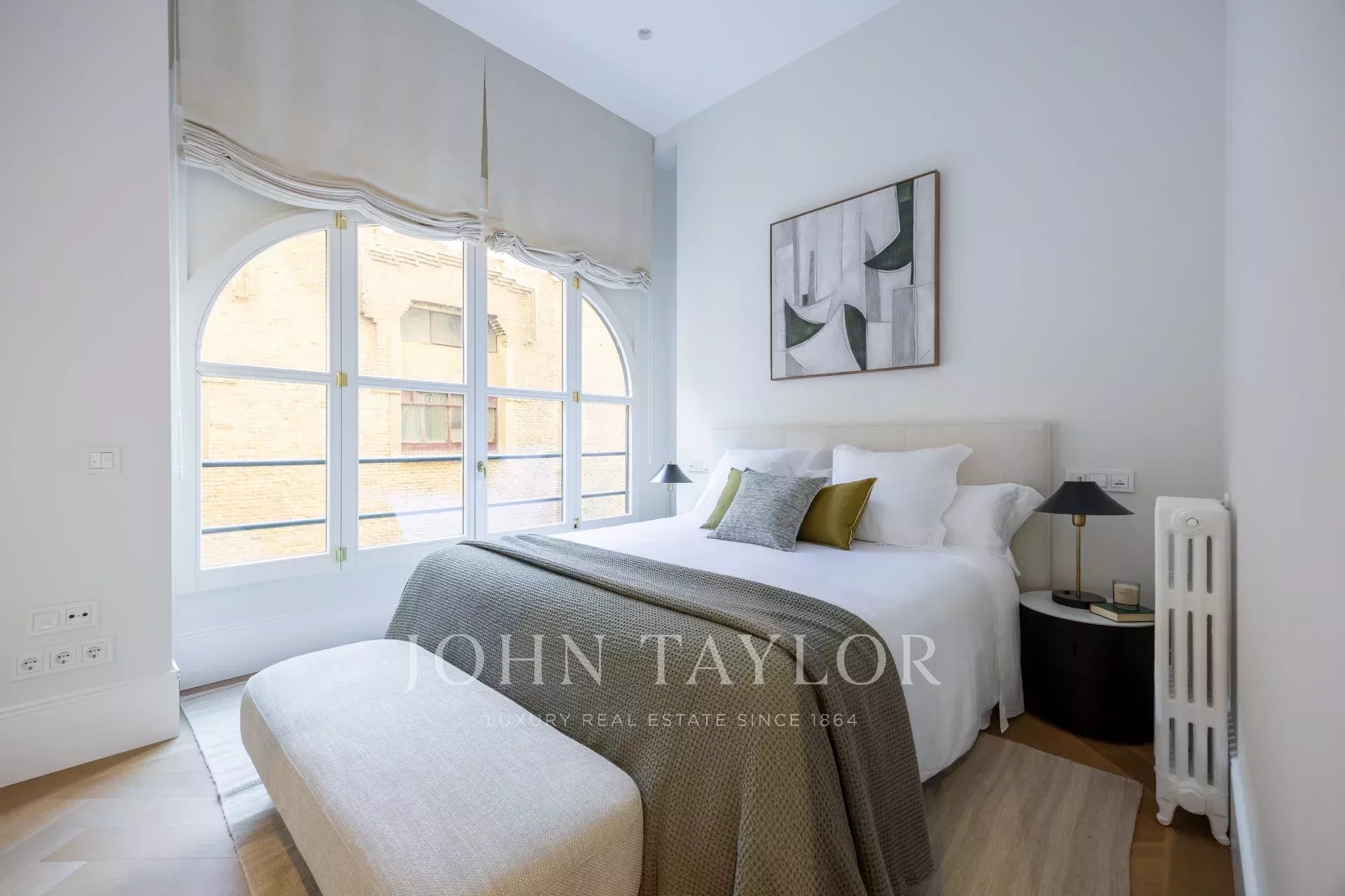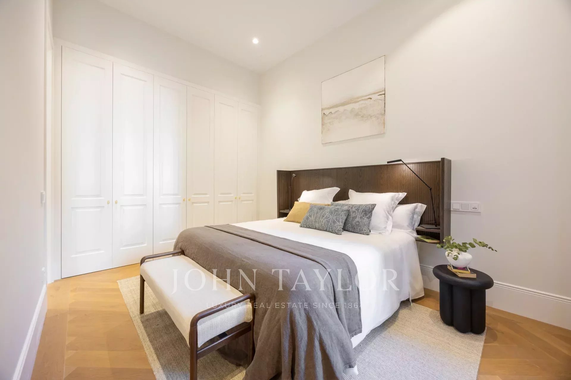 Der private Bereich umfasst fünf Schlafzimmer, alle mit eigenem Bad. Das Hauptschlafzimmer, das zur Straße hin liegt, besticht durch seine beeindruckende Größe.