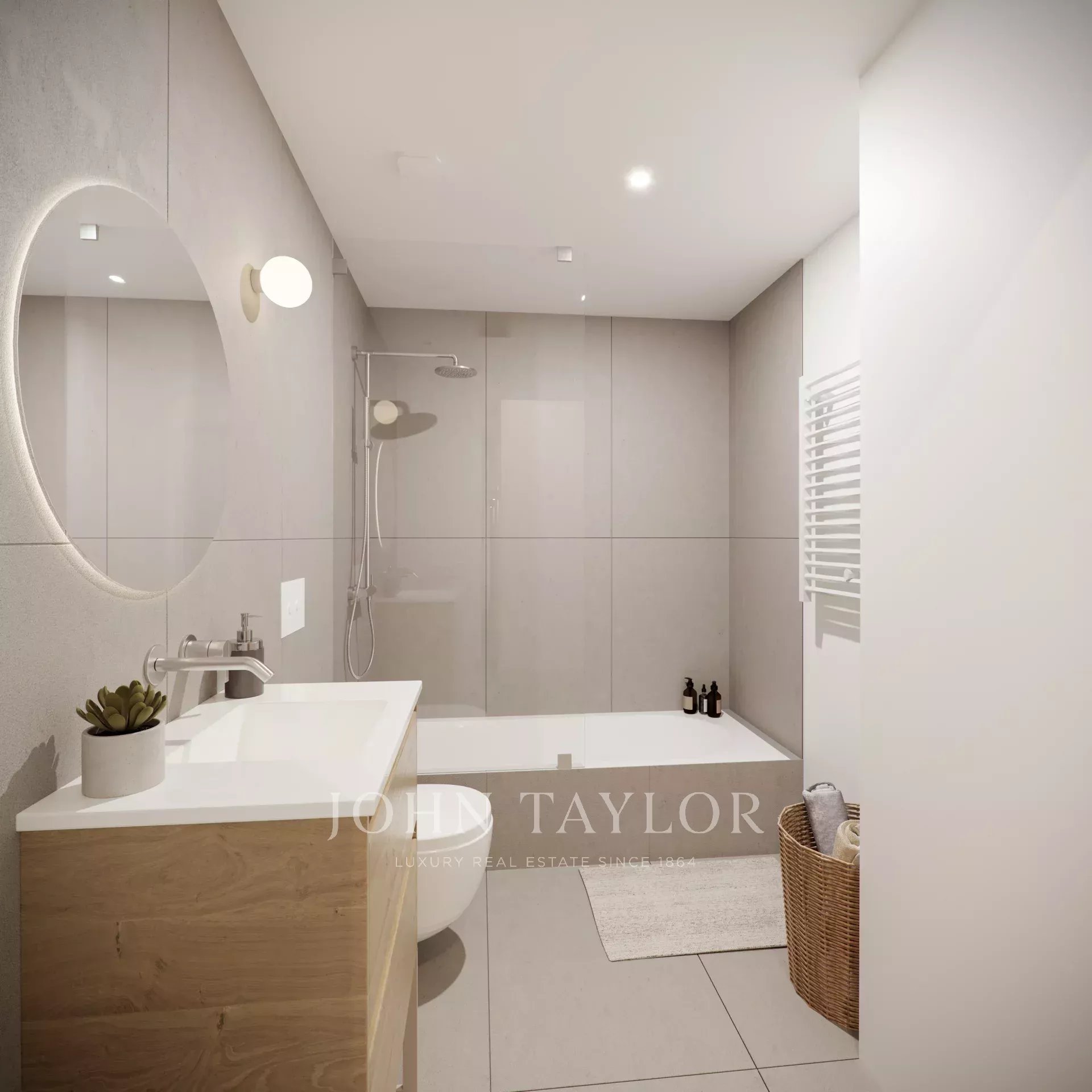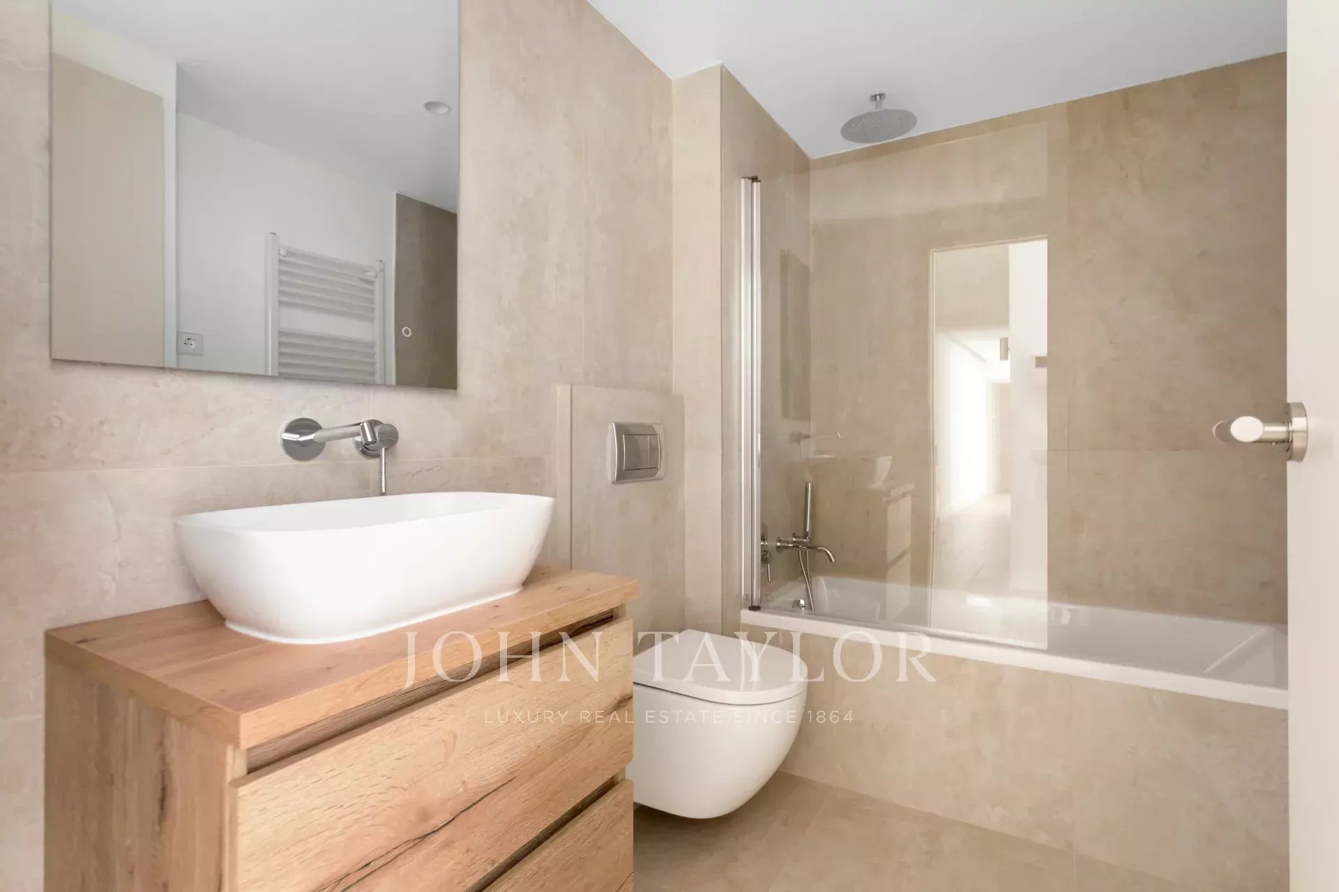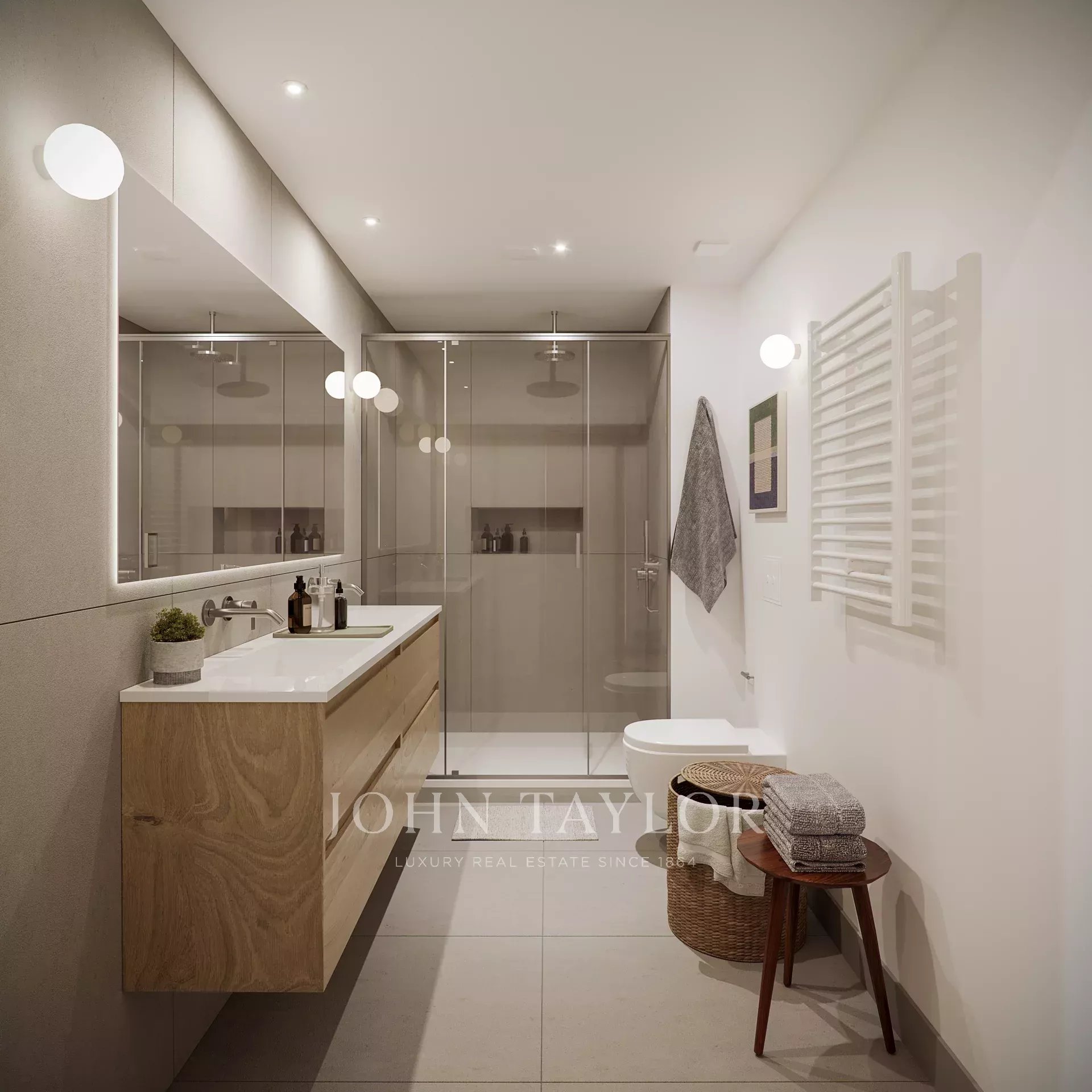 Der Schlafbereich besteht aus zwei Schlafzimmern, beide mit eigenem Bad und Einbauschränken, die Unabhängigkeit und Komfort bieten. Es besteht auch die Möglichkeit, ein drittes Schlafzimmer einzurichten, ideal als Büro oder zusätzliches Schlafzimmer. Ein drittes komplettes Badezimmer vervollständigt den Tagesbereich und bietet eine praktische Lösung für Gäste.