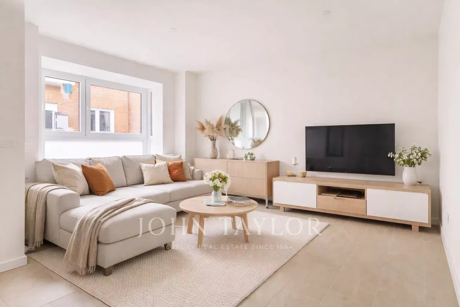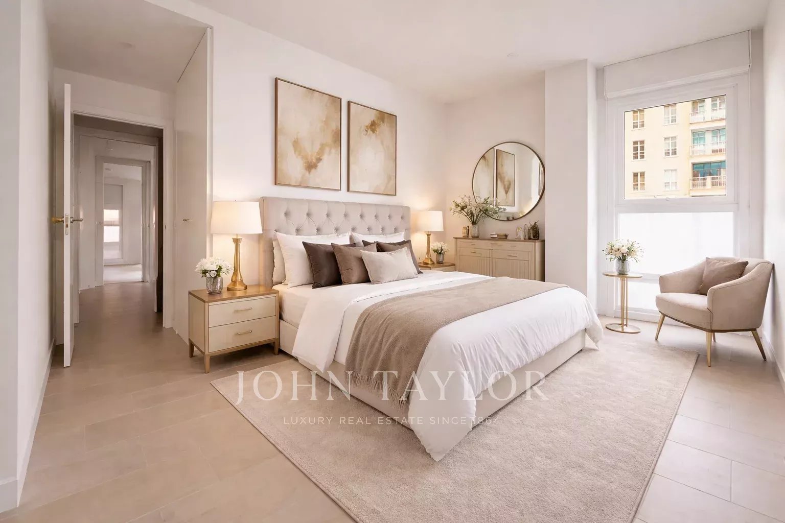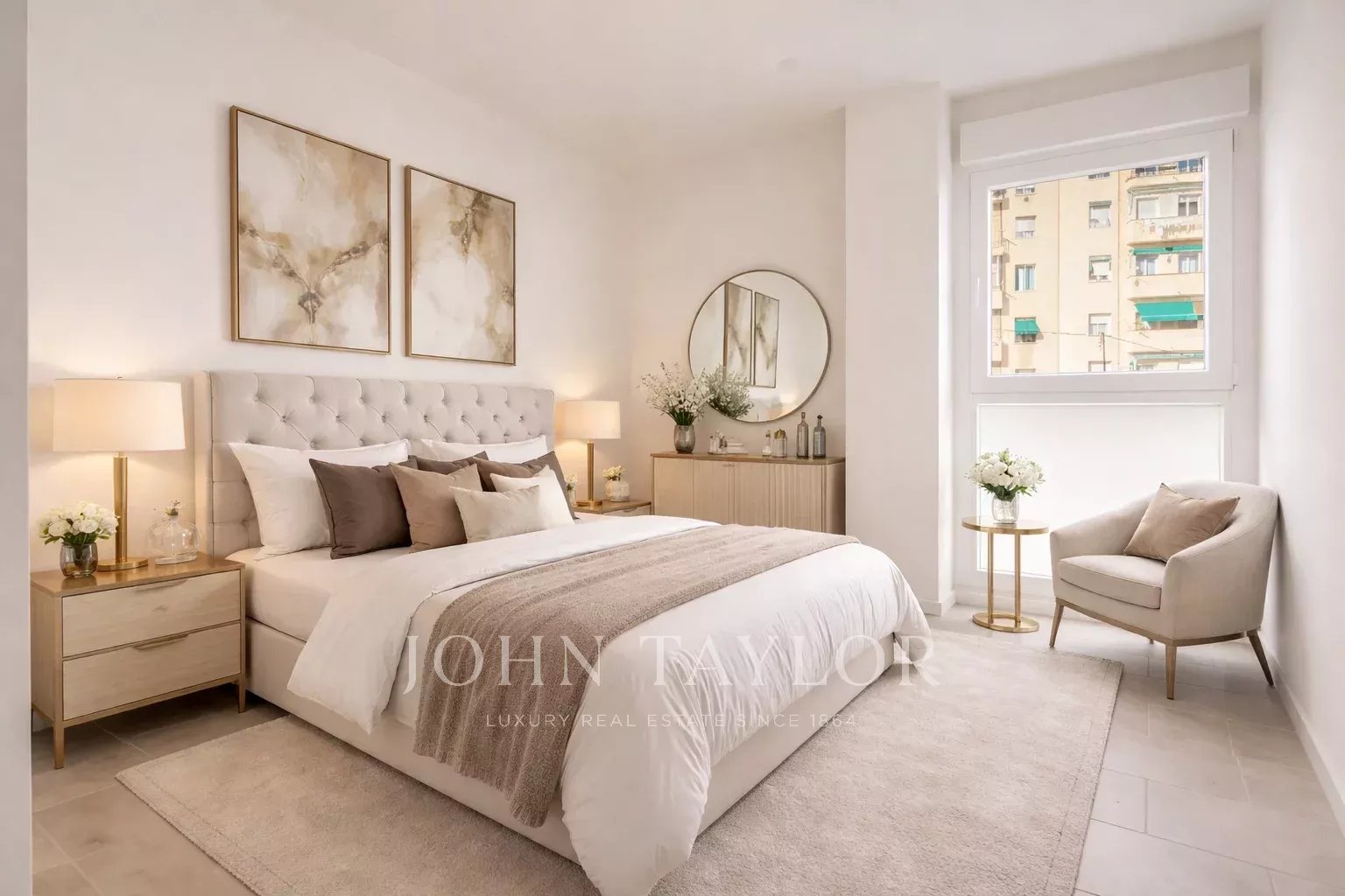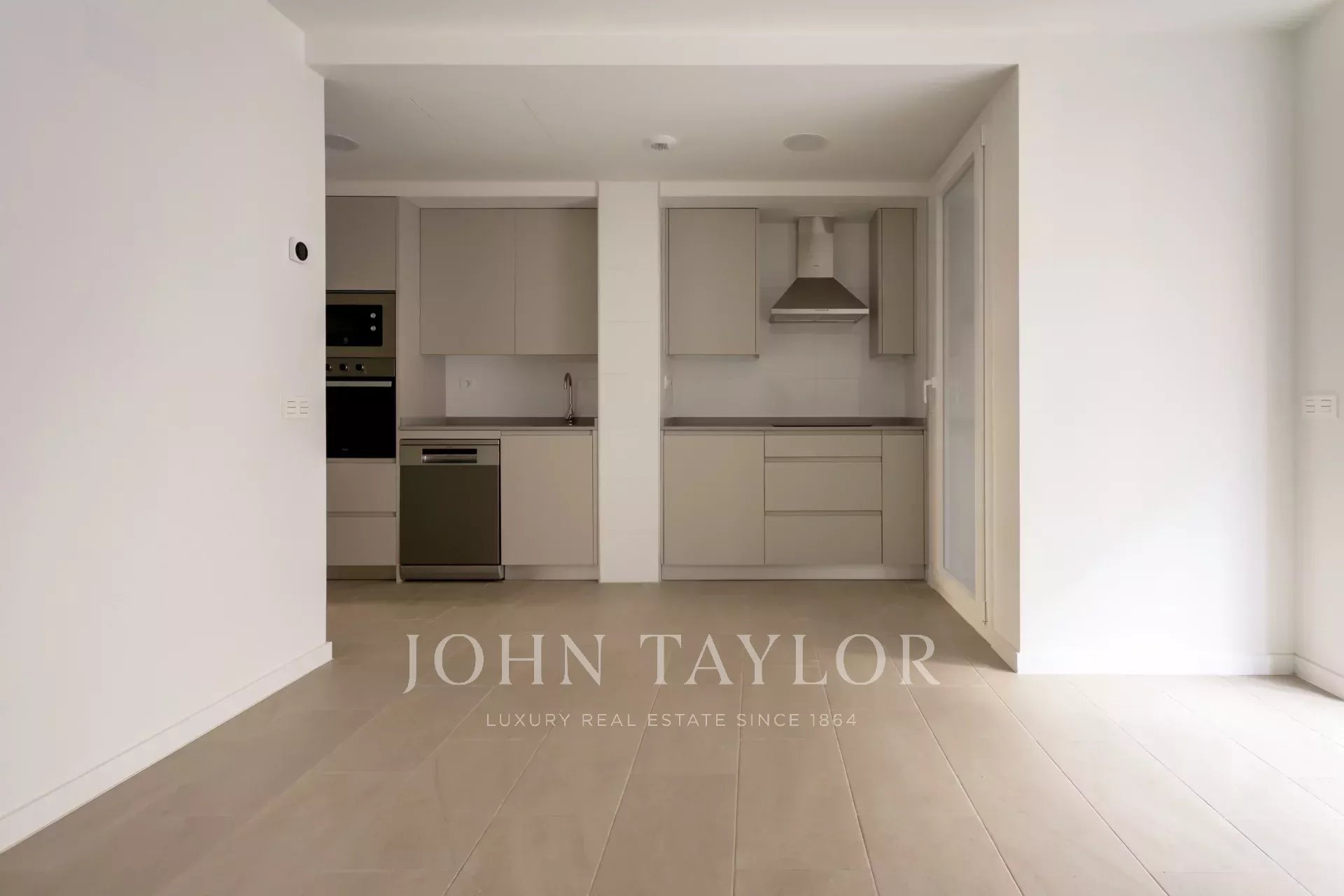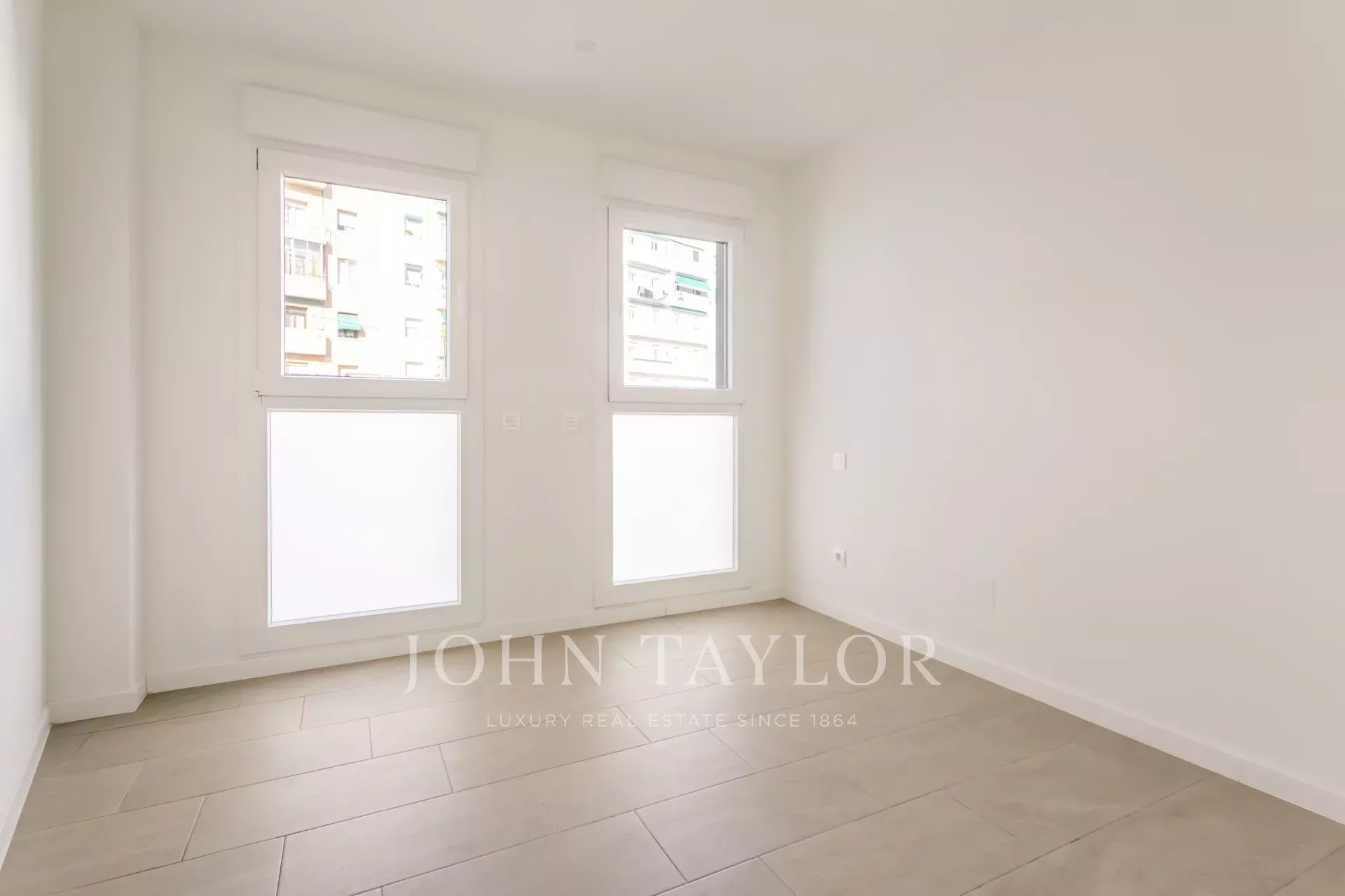 Die Wohnung befindet sich im ersten Stock und verfügt über 82 m² hervorragend verteilte Privatfläche, 105 m² einschließlich der Gemeinschaftsbereiche des Gebäudes. Sie verfügt über einen eleganten Flur mit Einbauschränken, der zu einer voll ausgestatteten Küche führt, die in das Wohnzimmer integriert ist, sowie über einen praktischen separaten Waschraum. Das helle Wohn-Esszimmer ist mit dem Ruhebereich verbunden, der aus zwei Schlafzimmern besteht, das Hauptschlafzimmer mit Ankleideraum und eigenem Bad, während ein zweites komplettes Bad das zweite Schlafzimmer und die Besucher bedient. Die gesamte Immobilie ist außenliegend, mit Ausnahme der Bäder, was einen herrlichen Lichteinfall und ein angenehmes Raumgefühl garantiert.