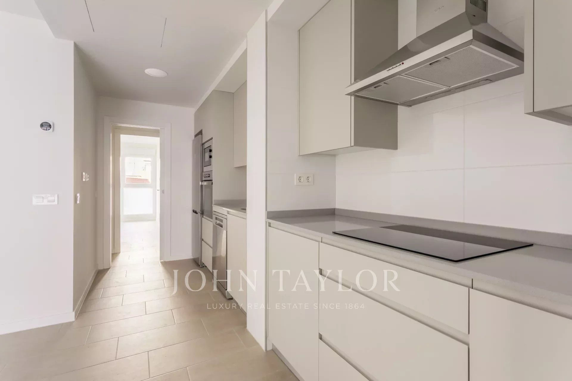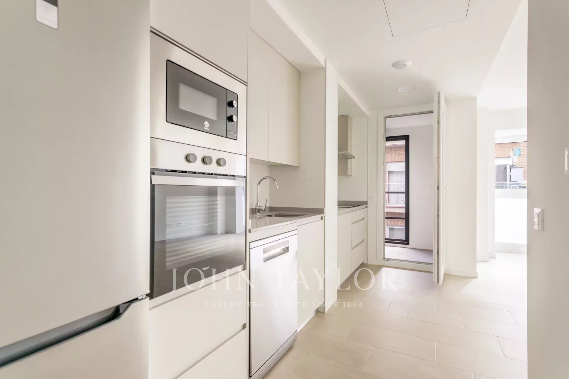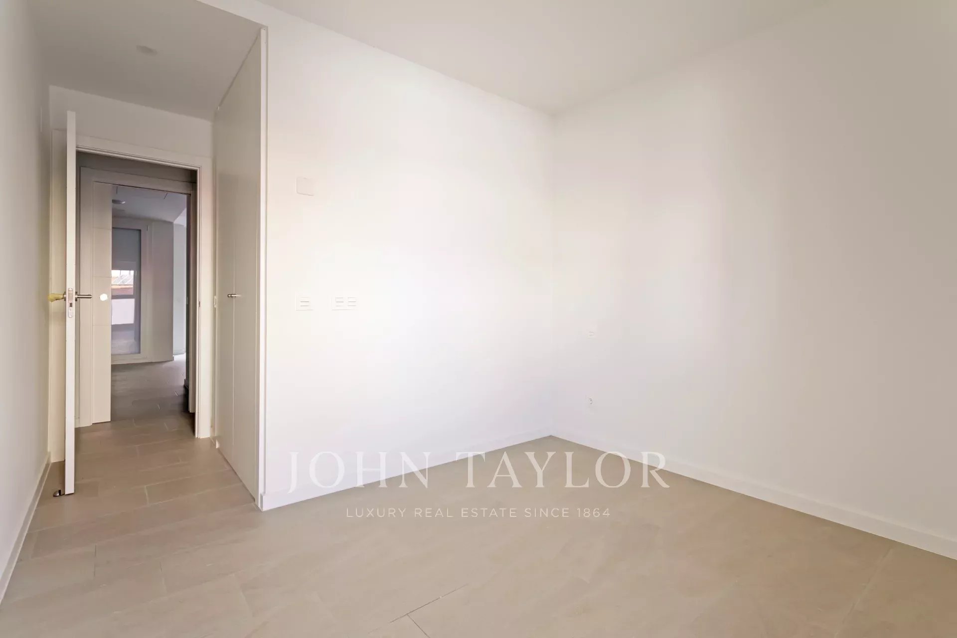 Die Wohnung befindet sich im ersten Stock und verfügt über 82 m² hervorragend verteilte Privatfläche, 105 m² einschließlich der Gemeinschaftsbereiche des Gebäudes. Sie verfügt über einen eleganten Flur mit Einbauschränken, der zu einer voll ausgestatteten Küche führt, die in das Wohnzimmer integriert ist, sowie über einen praktischen separaten Waschraum. Das helle Wohn-Esszimmer ist mit dem Ruhebereich verbunden, der aus zwei Schlafzimmern besteht, das Hauptschlafzimmer mit Ankleideraum und eigenem Bad, während ein zweites komplettes Bad das zweite Schlafzimmer und die Besucher bedient. Die gesamte Immobilie ist außenliegend, mit Ausnahme der Bäder, was einen herrlichen Lichteinfall und ein angenehmes Raumgefühl garantiert.