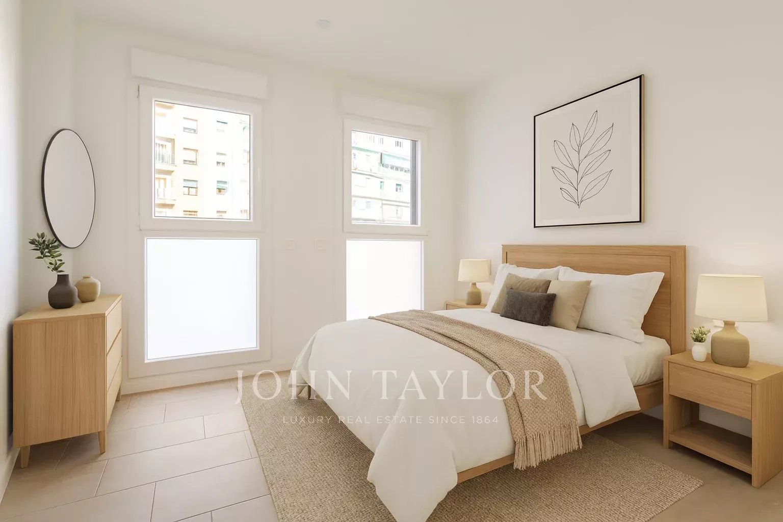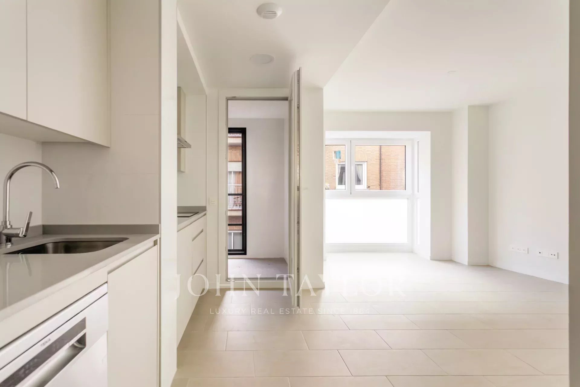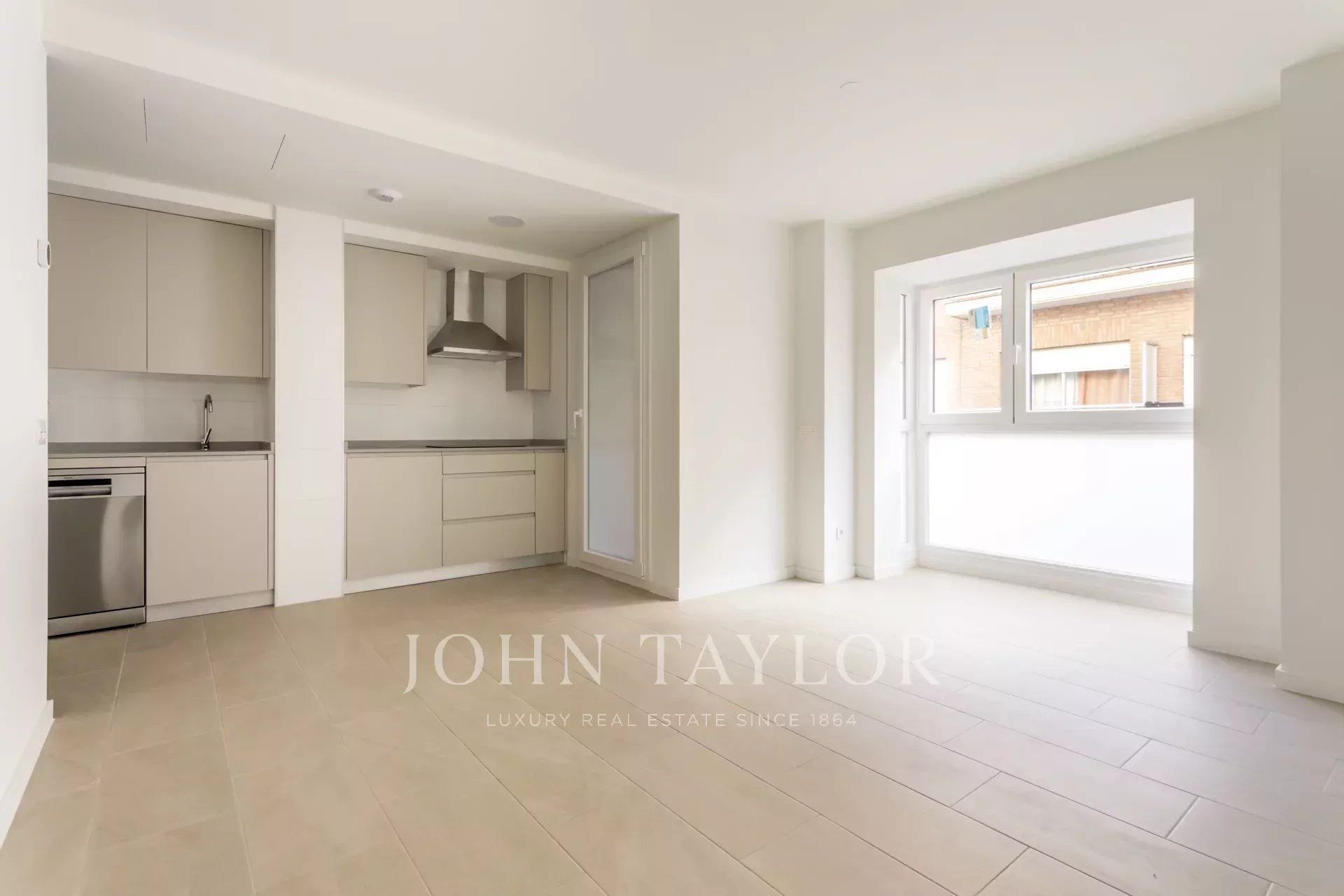 Die Wohnung befindet sich im ersten Stock und verfügt über 82 m² hervorragend verteilte Privatfläche, 105 m² einschließlich der Gemeinschaftsbereiche des Gebäudes. Sie verfügt über einen eleganten Flur mit Einbauschränken, der zu einer voll ausgestatteten Küche führt, die in das Wohnzimmer integriert ist, sowie über einen praktischen separaten Waschraum. Das helle Wohn-Esszimmer ist mit dem Ruhebereich verbunden, der aus zwei Schlafzimmern besteht, das Hauptschlafzimmer mit Ankleideraum und eigenem Bad, während ein zweites komplettes Bad das zweite Schlafzimmer und die Besucher bedient. Die gesamte Immobilie ist außenliegend, mit Ausnahme der Bäder, was einen herrlichen Lichteinfall und ein angenehmes Raumgefühl garantiert.