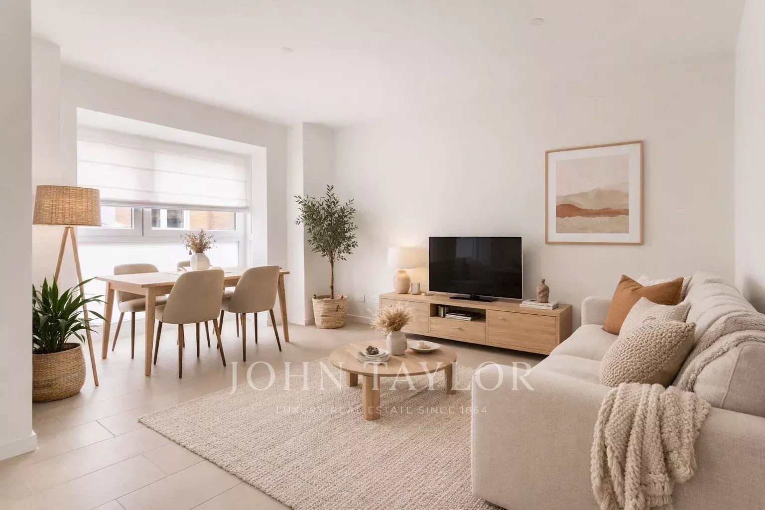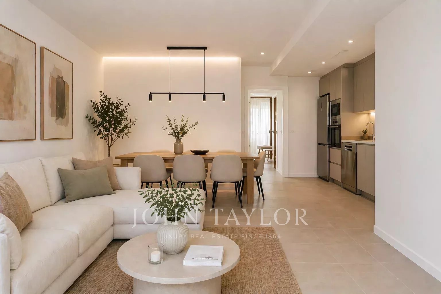 Die Wohnung im zweiten Stock verfügt über 82 m² Nutzfläche, die ausgezeichnet verteilt sind, insgesamt 105 Quadratmeter inklusive der Gemeinschaftsflächen des Gebäudes. Sie bietet einen eleganten Flur mit Garderobenschränken, der zu einer Küche führt, die in den Salon integriert ist und komplett ausgestattet ist, sowie einen praktischen separaten Waschbereich. Das lichtdurchflutete Wohnzimmer verbindet sich mit dem Ruhebereich, bestehend aus zwei Schlafzimmern, wobei das Hauptschlafzimmer mit Ankleidezimmer und Badezimmer en suite hervorsticht, während ein zweites Bad das zweite Schlafzimmer und Besucher bedient. Die gesamte Wohnung ist außen gelegen, mit Ausnahme der Bäder, was eine hervorragende Tageslichtzufuhr und ein angenehmes Raumgefühl garantiert.