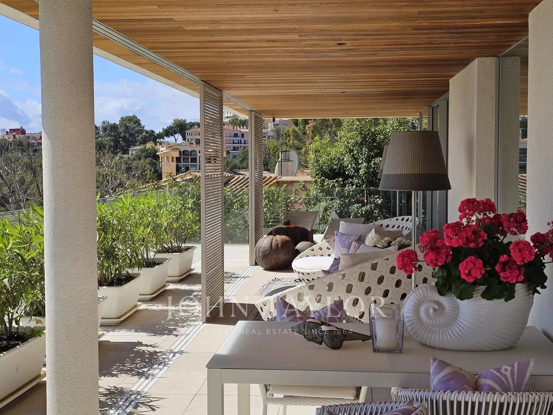 Diese große Luxus-Wohnung ist Teil einer kleinen und exklusiven Gemeinschaft von nur ein paar Nachbarn in der renommierten Gegend von Cas Catalá, sehr begehrt für seine Kombination aus Ruhe und Nähe zu Palma und alle Arten von Dienstleistungen. Zu einer kleinen Sandbucht sind es sogar nur 5 Minuten zu Fuß. Die Immobilie nimmt eine ganze Etage des Gebäudes ein und ist von Terrassen umgeben. Es hat auch einen eigenen privaten Pool. Der Wohnbereich besteht aus einem großen Wohn-Esszimmer und einer voll ausgestatteten offenen Küche. Die Kommunikation mit den Außenbereichen ist ausgezeichnet. Vom Wohnzimmer aus gelangt man auf eine überdachte Terrasse mit schönem Meerblick. Auf der Rückseite gibt es einen Zugang zu einer großen offenen Terrasse neben dem Schwimmbad, das zu jeder Tageszeit zum Sonnenbaden und Schwimmen einlädt. Die Aufteilung der Immobilie wurde beim Bau an die Wünsche der heutigen Eigentümer angepasst. Es gibt eine beeindruckende Master-Suite mit einem Ankleidezimmer und einem sehr großzügigen Badezimmer. Von diesem Schlafzimmer aus gibt es auch einen direkten Zugang zur Terrasse und vom Bett aus kann man den Meerblick genießen. Es gibt ein Gästeschlafzimmer mit eigenem Bad. 2 Garagenplätze und ein großer Abstellraum vervollständigen diese wunderbare Immobilie, ideal für ein Paar oder eine kleine Familie, die viel Platz, eine gute Aussicht und ein elegantes und komfortables Zuhause schätzen.