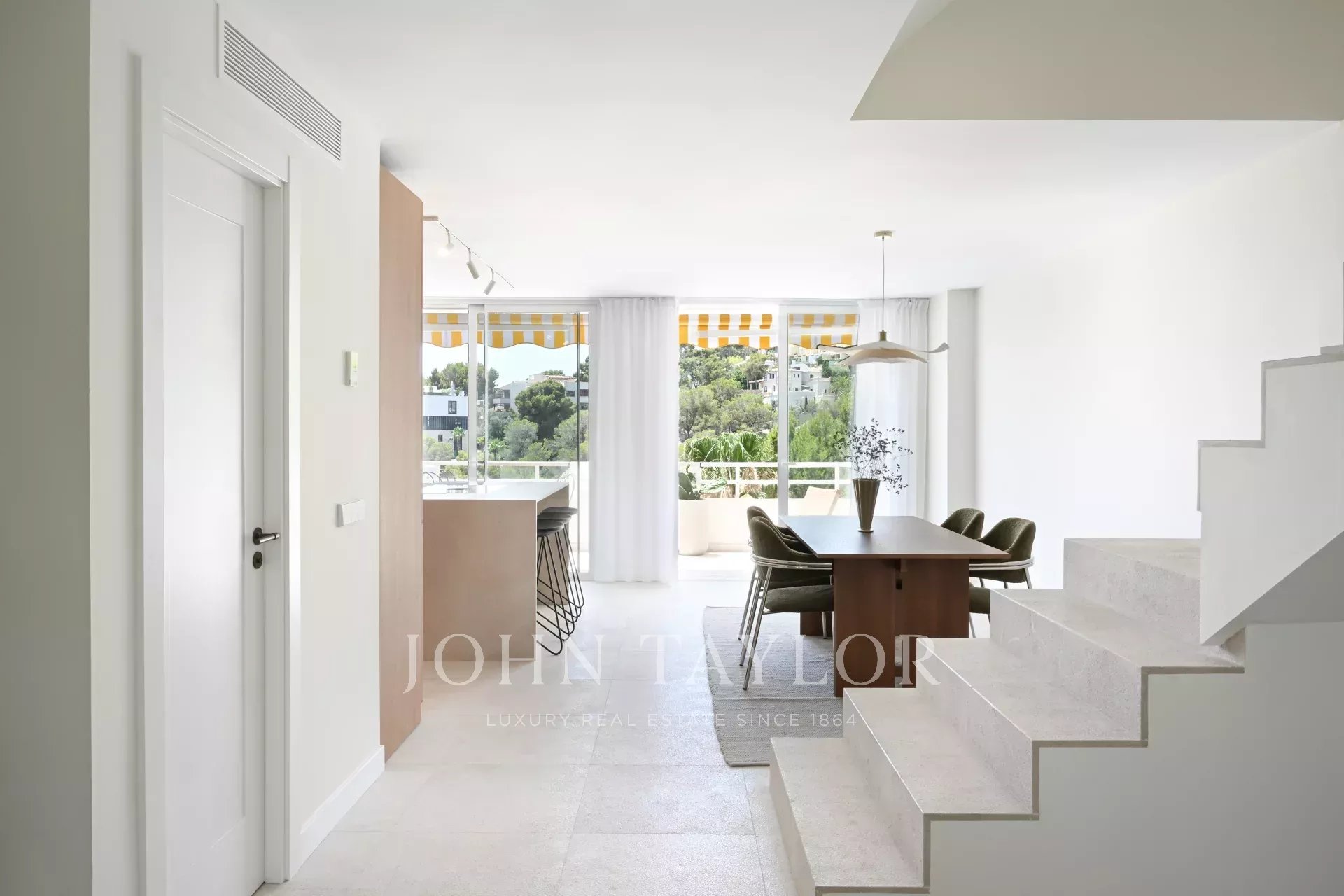 In einer der exklusivsten Gegenden Mallorcas steht dieses spektakuläre 170 m² große Triplex-Penthouse, das Eleganz, modernes Design und einen atemberaubenden Blick auf das Mittelmeer vereint. Verteilt auf drei Etagen, bietet es ein helles Wohnzimmer mit Terrasse zum Meer, eine Designerküche mit Gaggenau Geräten, drei Schlafzimmer und ein oberes mittelgrosses Wohnzimmer, das auf eine herrliche 40 m² große Dachterrasse mit Außenküche, Essbereich und unvergesslichem Panoramablick führt. Die Immobilie verfügt über eine hochwertige Ausstattung, eine integrierte Klimaanlage, ein Sonos-System, Fußbodenheizung in den Bädern sowie einen Parkplatz für zwei kleine Autos und einen großen privaten Abstellraum. Ein einzigartiges Haus, das Exklusivität, Stil und eine privilegierte Lage in sich vereint und sich sowohl als Hauptwohnsitz als auch als Urlaubsdomizil eignet. Entdecken Sie das Privileg, das Mittelmeer vom höchsten Punkt aus zu erleben.