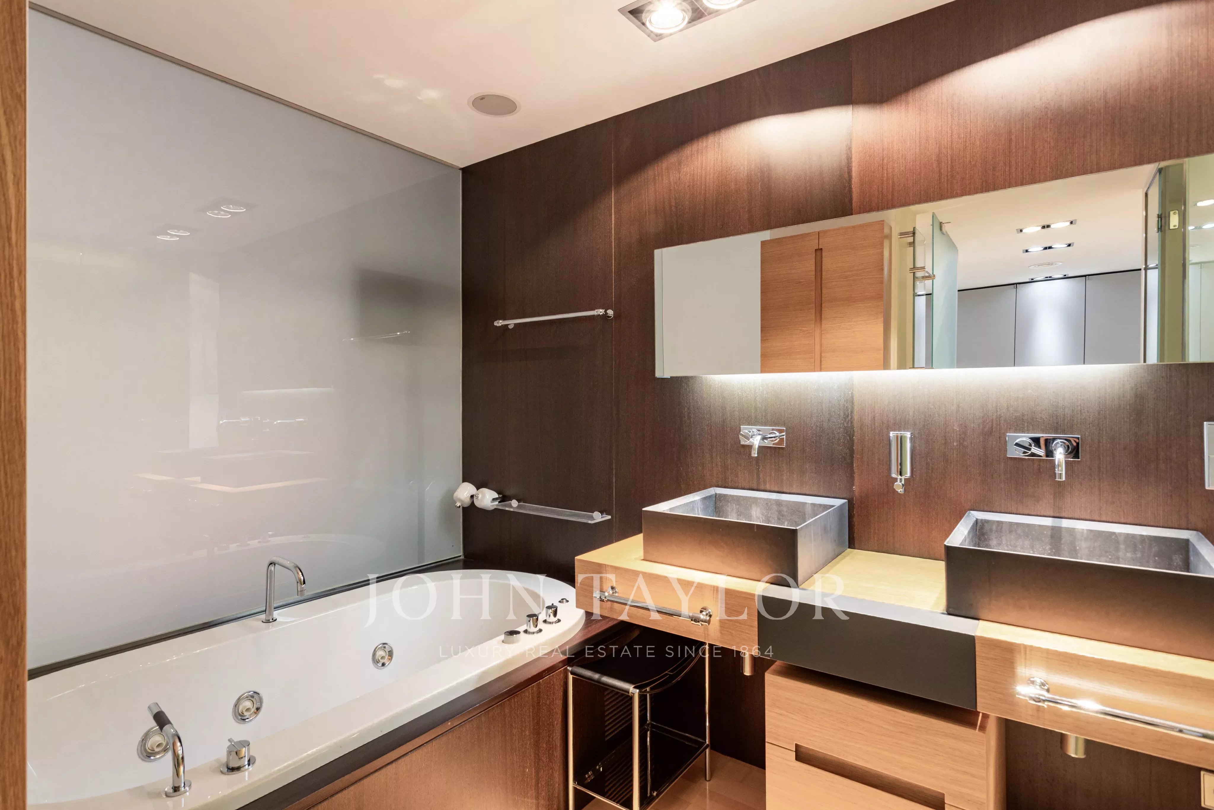 Sie verfügt über drei Schlafzimmer en suite, einen hellen Wohn- und Essbereich sowie eine voll ausgestattete Küche. Parkettböden und hochwertige Ausstattungen aus der Renovierung 2003 verleihen Eleganz und Wärme. Die Wohnung ist unbewohnt und in hervorragendem Zustand.