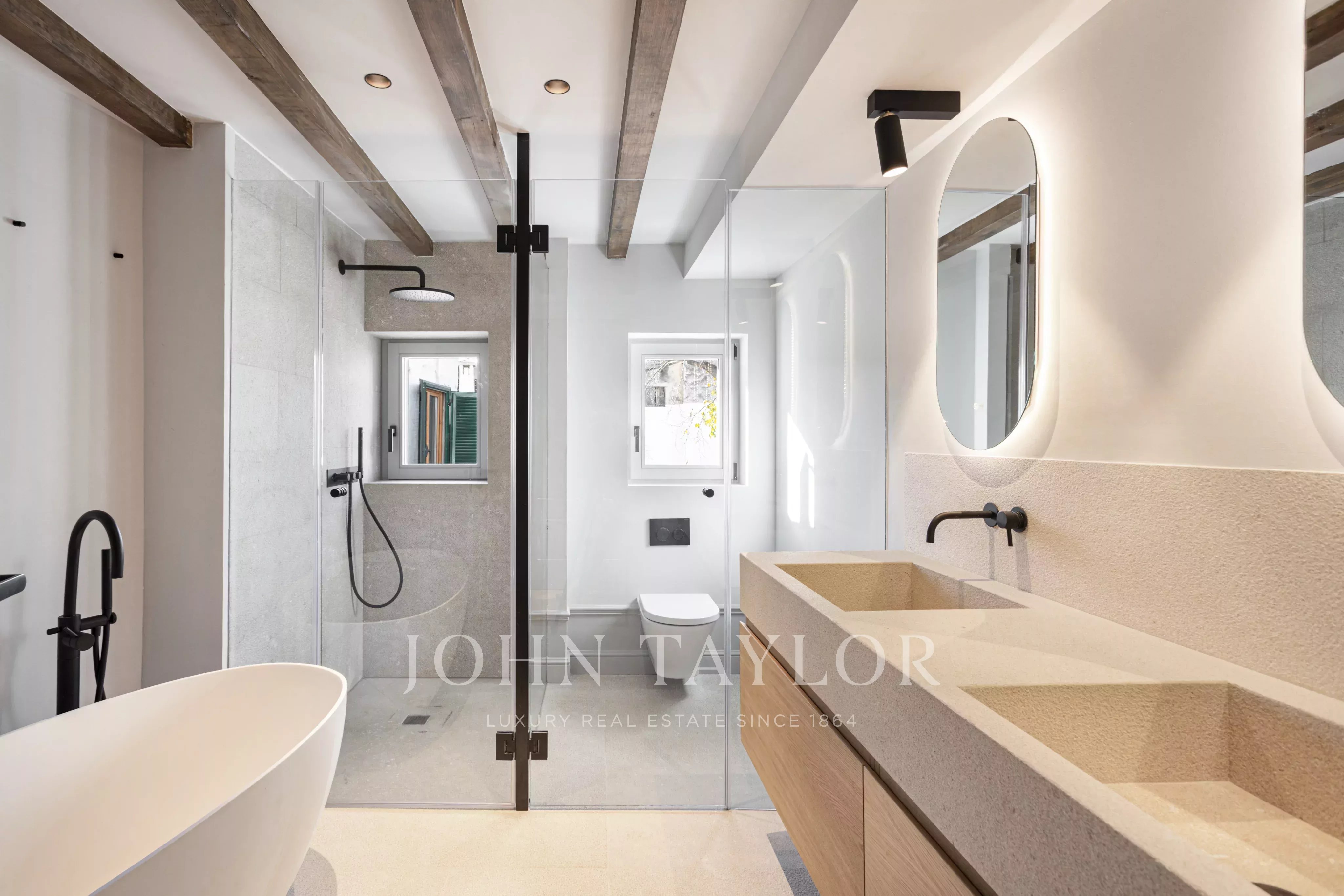 Die Hauptwohnebene verfügt über einen hellen und eleganten offenen Wohn- und Essbereich mit einer voll ausgestatteten modernen Küche und einem einladenden Kamin, der einen idealen Rahmen für das tägliche Leben und die Unterhaltung bietet. Auf dieser Etage befinden sich auch drei großzügige Doppelschlafzimmer, darunter ein Hauptschlafzimmer mit eigenem Bad, ein zweites Bad, ein Gäste-WC und eine separate Waschküche.