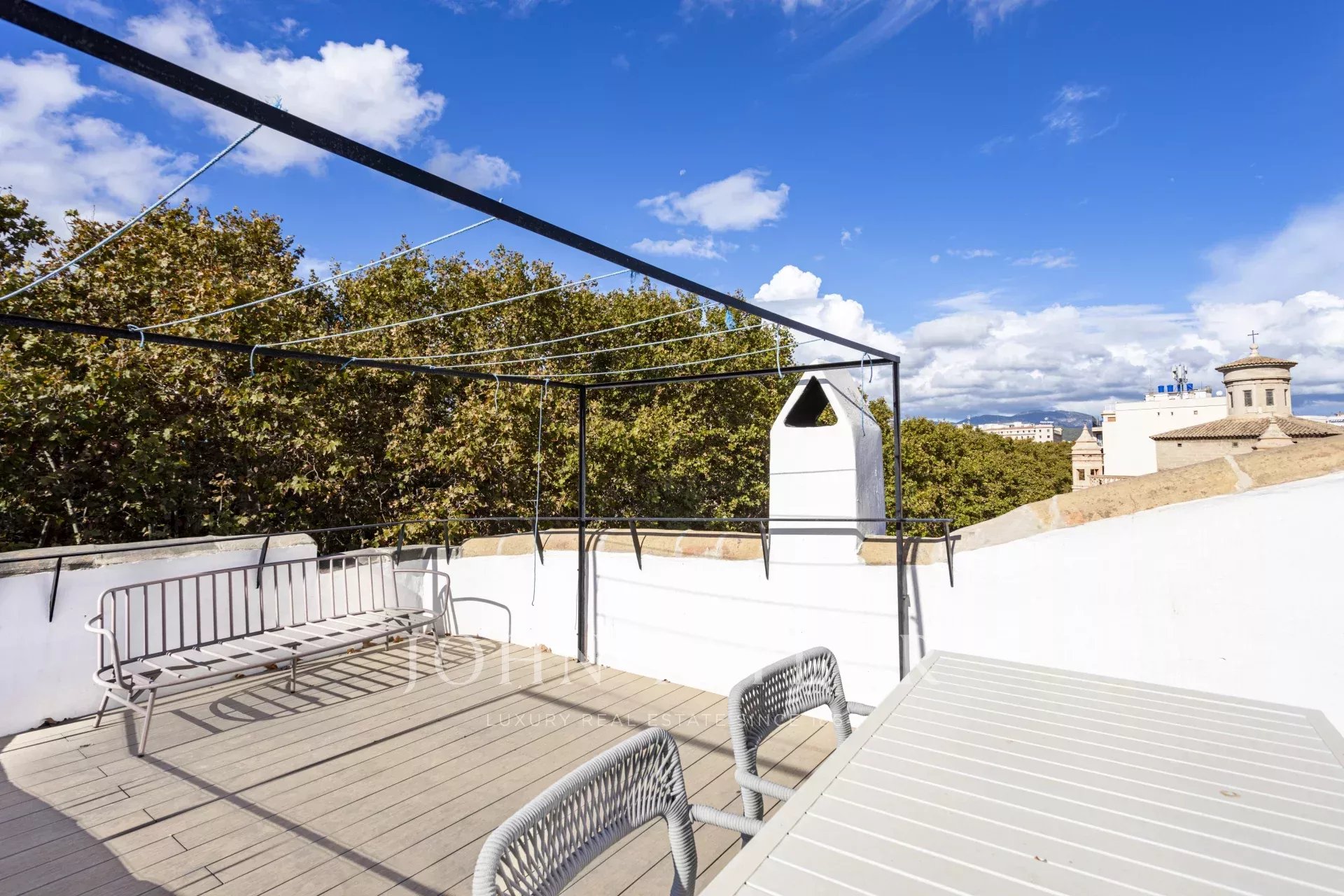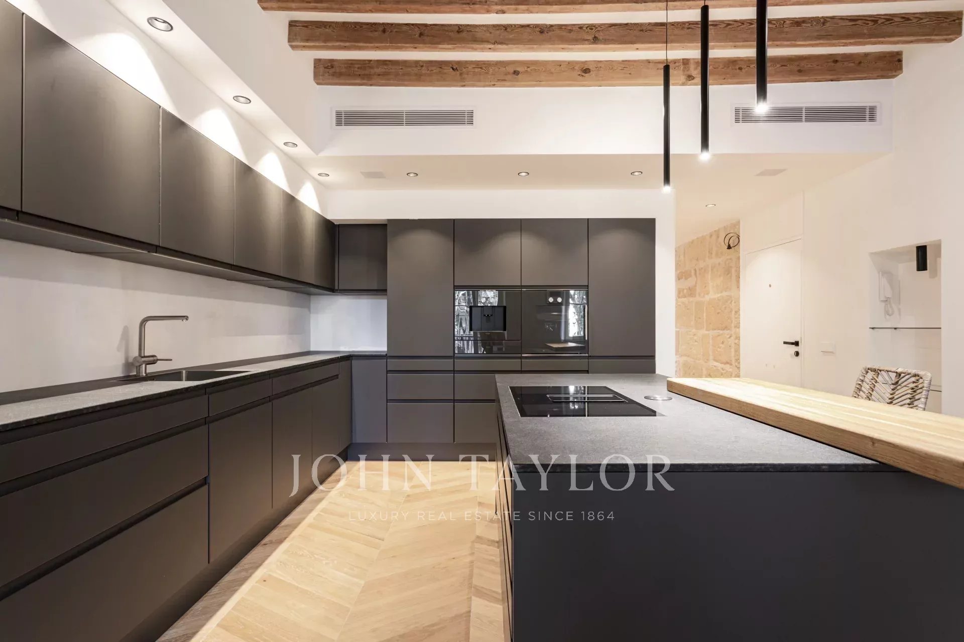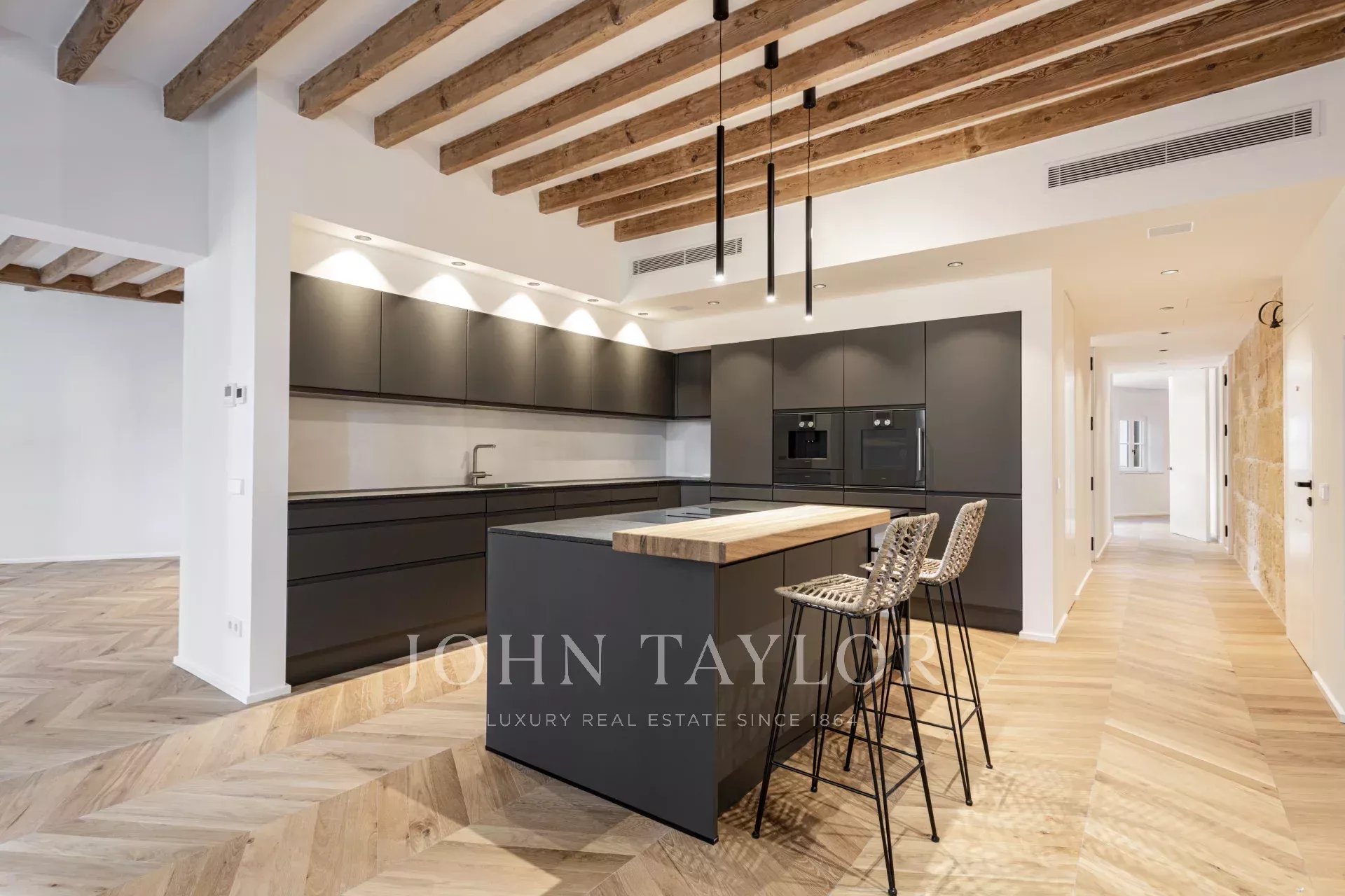 Entdecken Sie diese außergewöhnliche Luxuswohnung im Herzen von Palmas Altstadt an der berühmten Rambla. Die im Oktober 2024 fertiggestellte Immobilie verbindet moderne Eleganz mit historischem Charme und bietet direkten Zugang zu Palmas pulsierendem Leben, Restaurants und Einkaufsmöglichkeiten. Die Wohnung verfügt über einen großzügigen, offenen Grundriss mit einer voll ausgestatteten Küche, einem Ess- und einem Wohnzimmer. Vom Boden bis zur Decke reichende Fenster durchfluten den Raum mit natürlichem Licht und heben den atemberaubenden natürlichen Eichenholzboden, die originalen Marés-Steinwände und die authentischen Holzbalken hervor. Diese Mischung aus modernem Design und traditionellen Materialien schafft eine warme und einladende Atmosphäre. Das Haus verfügt über drei Schlafzimmer und drei Badezimmer, von denen zwei mit eigenem Bad ausgestattet sind. Das Hauptschlafzimmer verfügt über einen privaten Ankleideraum, der für Komfort und Luxus sorgt. Eines der herausragenden Merkmale ist die Gemeinschaftsterrasse mit atemberaubendem Blick auf die von Bäumen gesäumte Rambla, ideal zum Entspannen oder um Gäste zu empfangen. Es besteht die Möglichkeit, einen Parkplatz nur wenige Meter entfernt anzumieten. Diese atemberaubende Immobilie kombiniert hochwertige Ausstattung mit dem Charme von Palmas Altstadt und ist damit die ideale Wahl für alle, die ein luxuriöses Zuhause in bester Lage suchen.