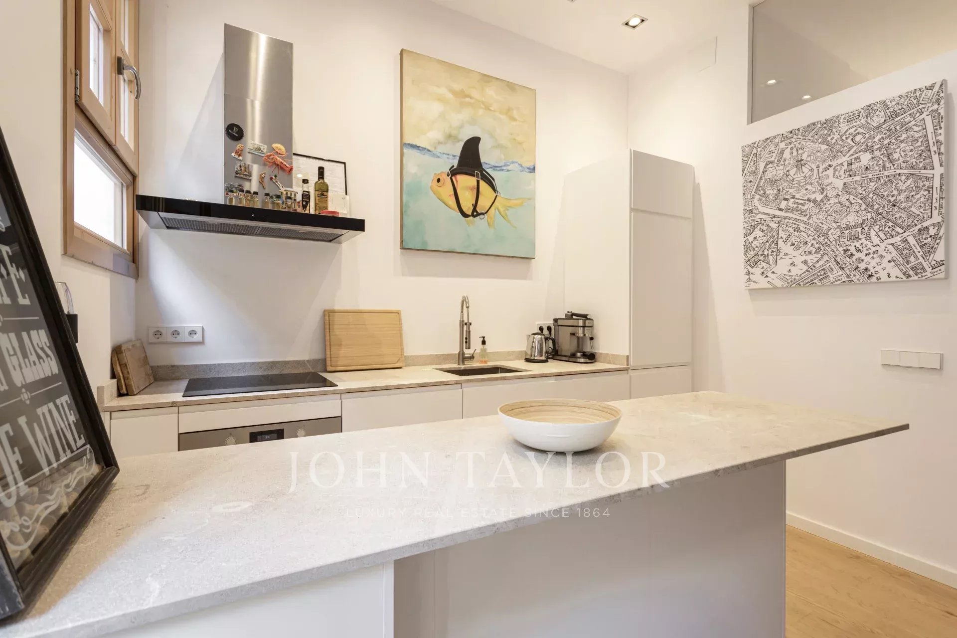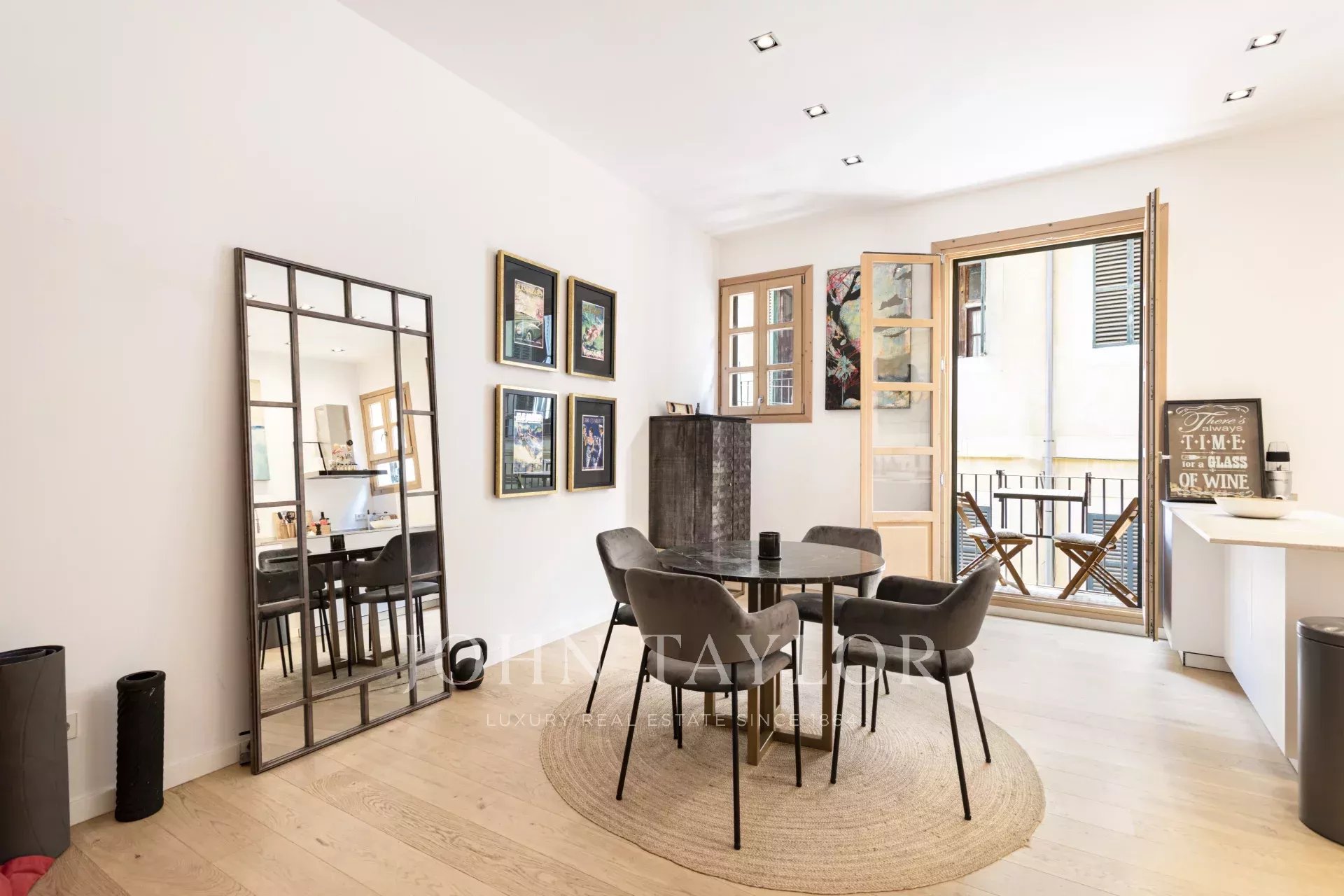 Die 2019 renovierte Wohnung verfügt über einen geräumigen, lichtdurchfluteten, offenen Wohnbereich, der Küche, Ess- und Wohnbereich nahtlos miteinander verbindet. Elegante Flügeltüren führen auf einen charmanten französischen Balkon, der den Innenraum mit natürlichem Licht durchflutet und die warme Atmosphäre, die durch Holzböden und hohe Decken entsteht, noch verstärkt.