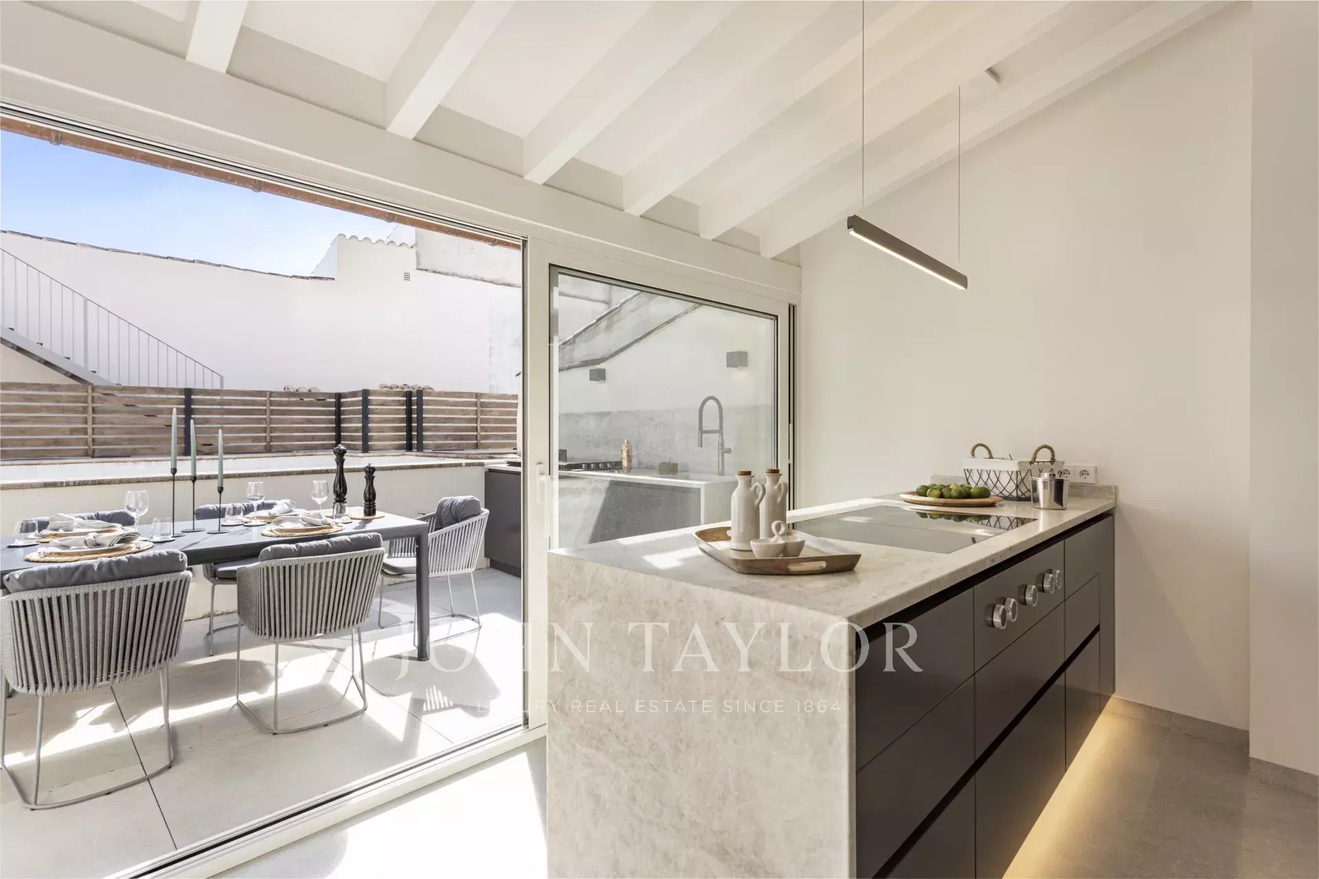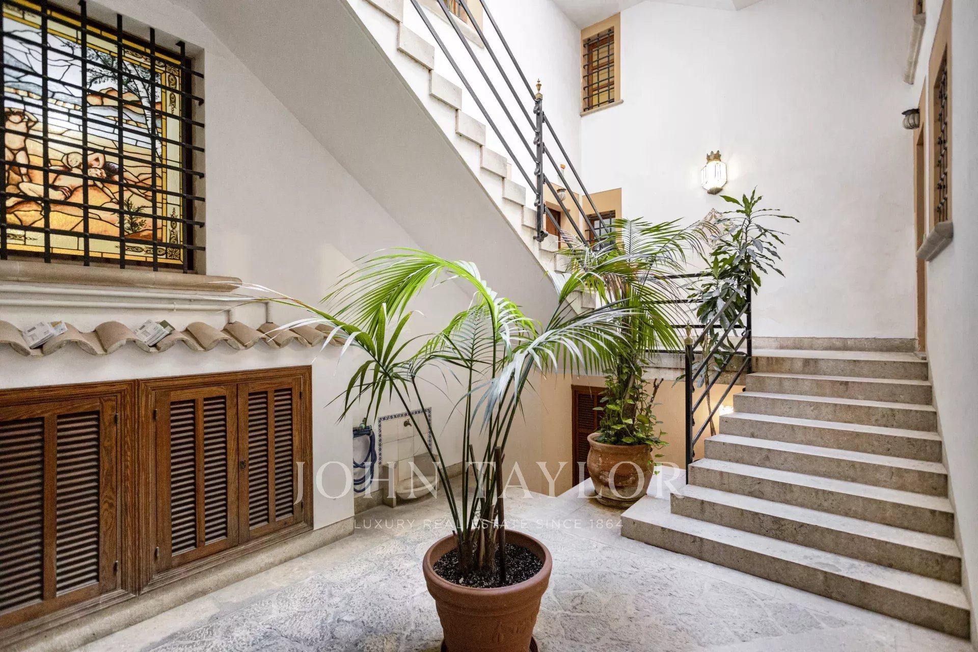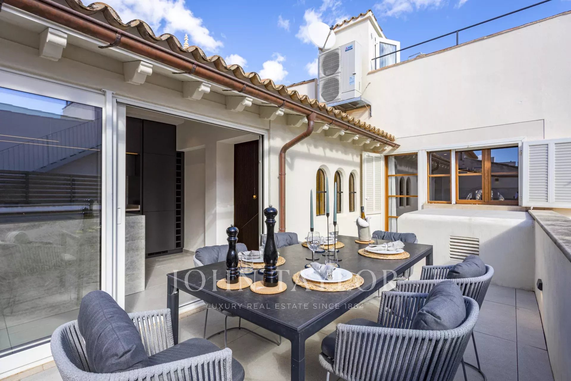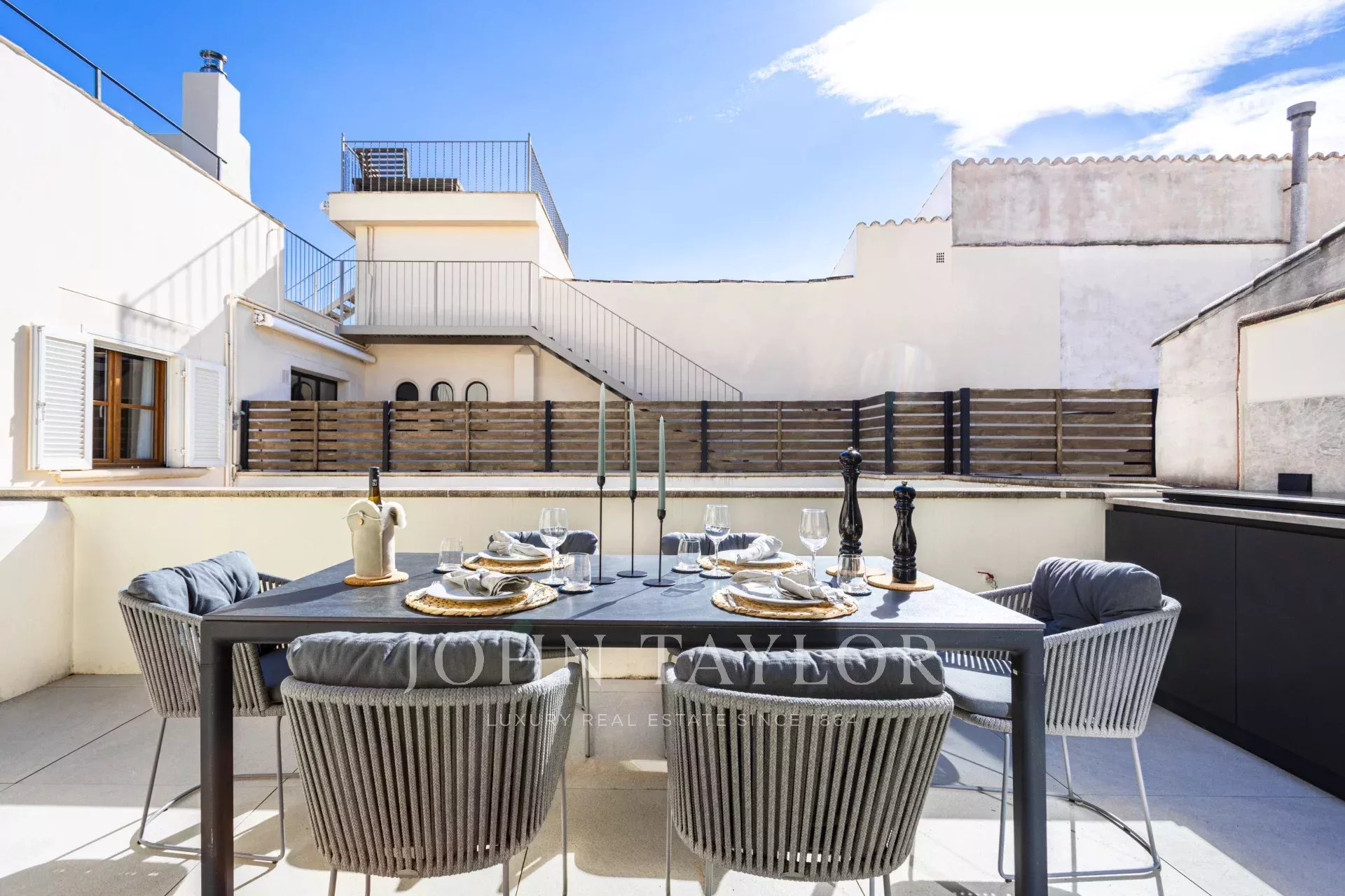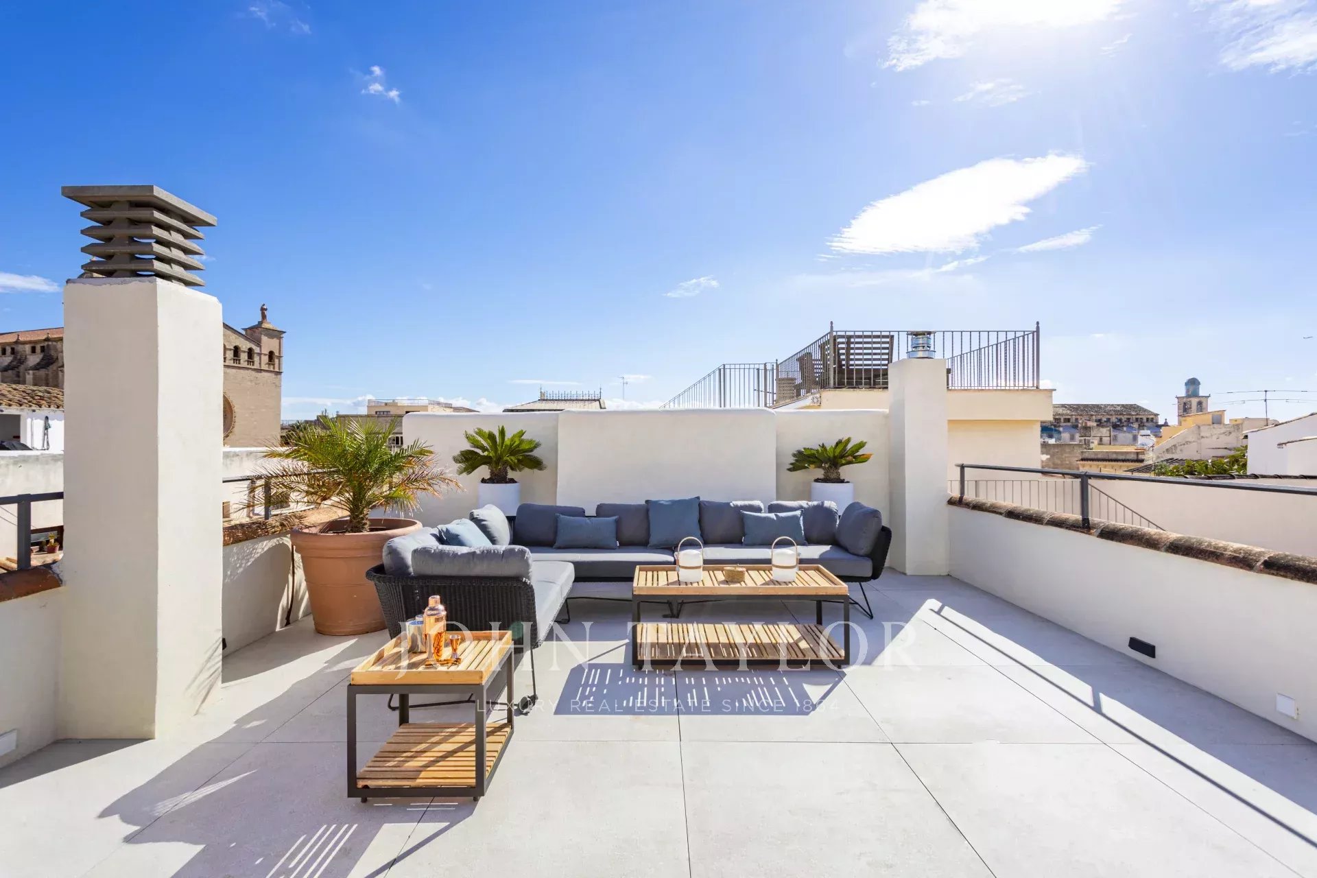In einer der bezauberndsten Gassen von Palmas Altstadt, nur wenige Schritte vom Rathaus und der Kathedrale entfernt, befindet sich dieses außergewöhnliche Duplex-Penthouse, das historischen Charme, modernen Luxus und mediterranes Lebensgefühl auf harmonische Weise vereint. Es erstreckt sich über die beiden obersten Etagen eines sorgfältig restaurierten historischen Gebäudes mit einer charaktervollen alten Holztüre und einem charmanten Innenhof und bietet durch nur einen Nachbarn und Aufzug bis zur obersten Etage ein hohes Maß an Privatsphäre. Mit einer Gesamtfläche von 243 m², darunter 58,9 m² Terrassen, empfängt die Wohnung mit einem eleganten Eingangsbereich, der zu den Schlafräumen führt: einem Hauptschlafzimmer mit Bad en suite sowie zwei weiteren Schlafzimmern, die sich ein stilvolles Badezimmer teilen. Auf der oberen Ebene führt ein großzügiger Wohn- und Essbereich mit Gaskamin und einer maßgefertigten Weinvitrine auf die angrenzende Terrasse – der perfekte Ort für stilvolle Abende oder entspannte Stunden unter dem Sternenhimmel. Die separate Designerküche ist mit hochwertigen Geräten der Marken Gaggenau, Bora und Liebherr ausgestattet und hat ebenfalls Zugang zur Terrasse, wo eine Außenküche mit Grill zum mediterranen Genießen einlädt. Eine Treppe führt vom Wohnbereich auf die Dachterrasse, die mit einem atemberaubenden Panoramablick über die Kathedrale, das Meer und die von historischen Kirchen wie Santa Eulalia und Sant Francesc geprägte Skyline Palmas begeistert. Mit einer Vorinstallation für einen Pool oder Jacuzzi bietet sie eine private Oase über den Dächern der Altstadt. Das Penthouse wird vollmöbliert mit exklusiven Designermöbeln von Minotti und Freifrau verkauft und überzeugt zudem durch ein durchdachtes Lichtkonzept von Occhio – eine perfekte Symbiose aus zeitloser Eleganz und modernem Wohnkomfort im historischen Herzen Palmas. Zum Penthouse gehört außerdem ein Stellplatz in einer nahegelegenen Garage.
