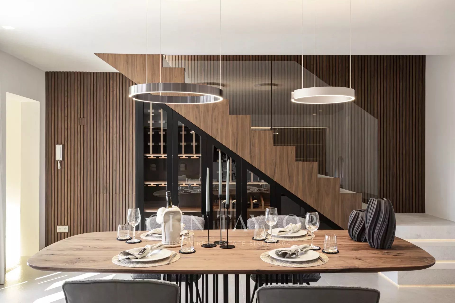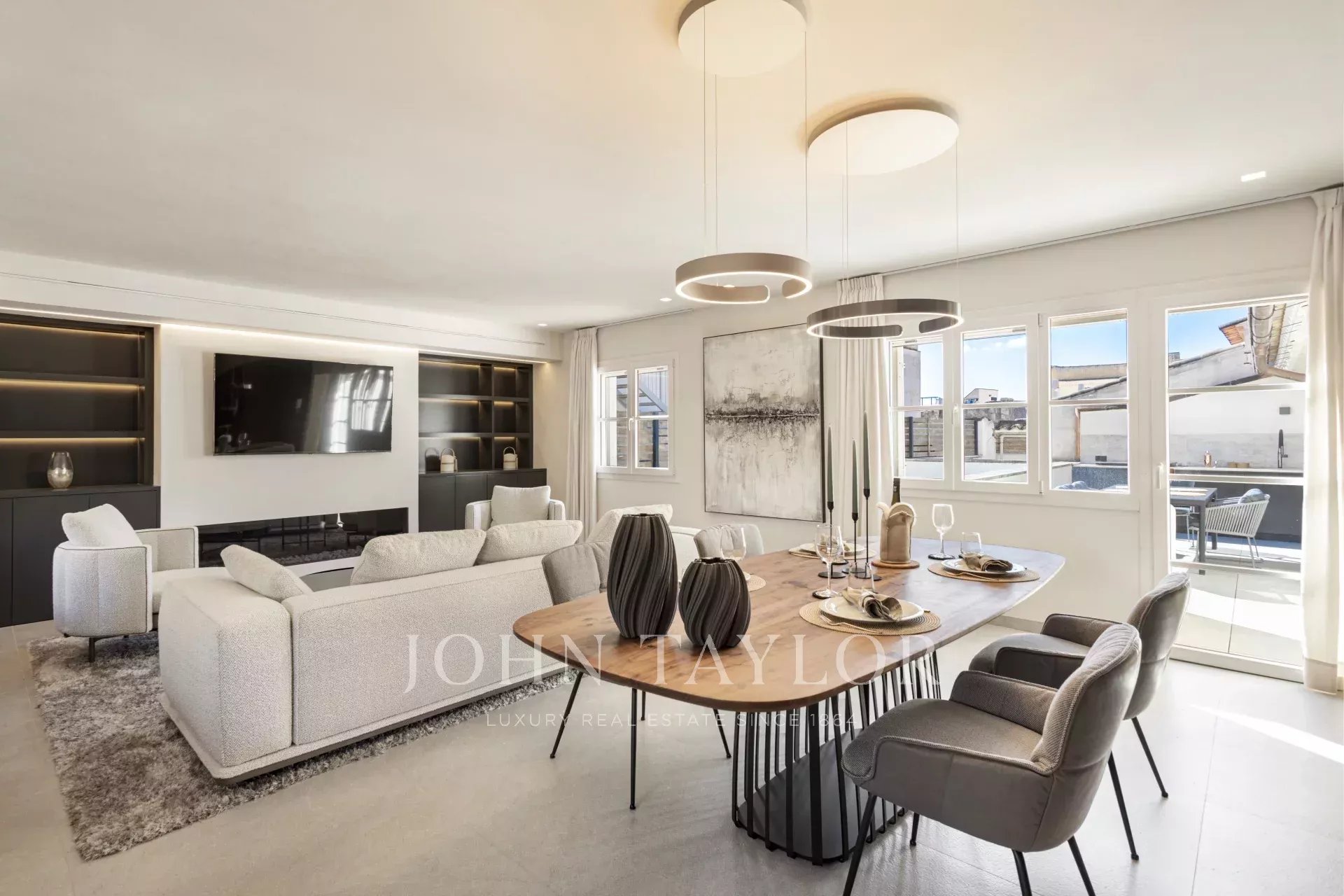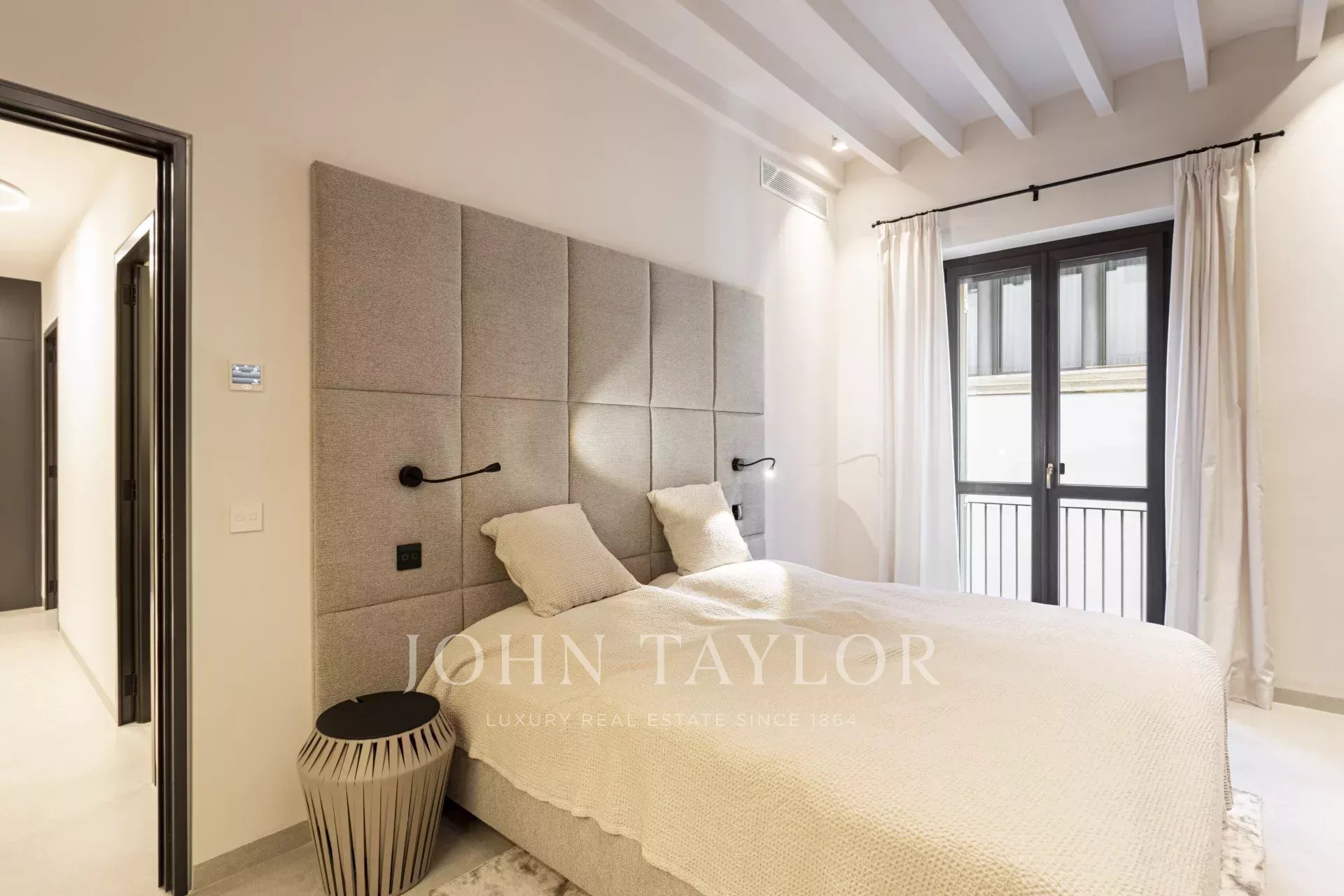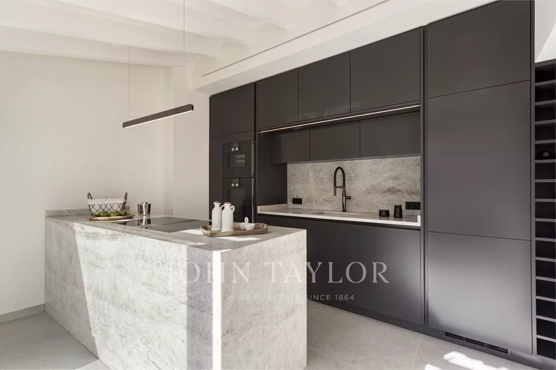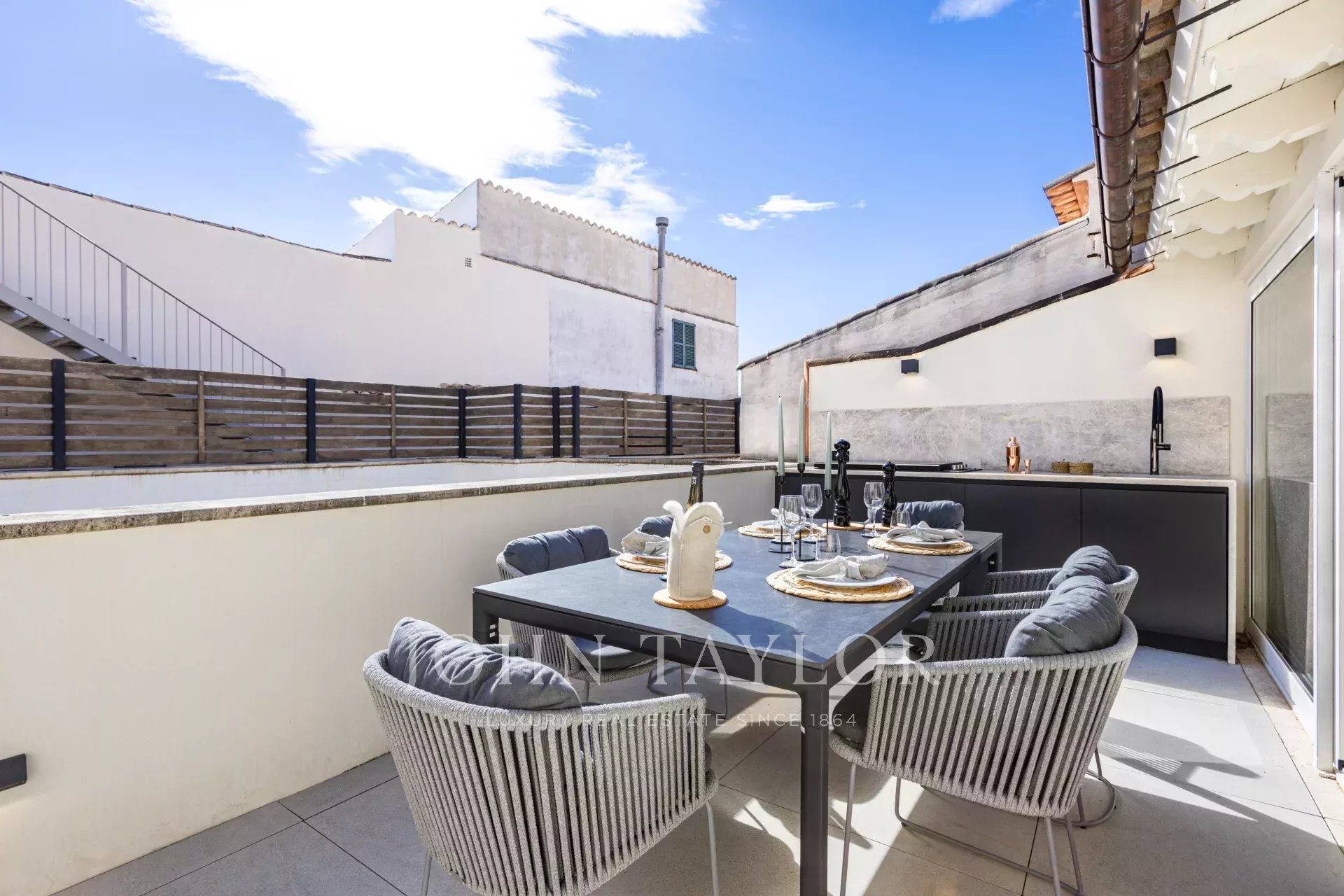 In einer der bezauberndsten Gassen von Palmas Altstadt, nur wenige Schritte vom Rathaus und der Kathedrale entfernt, befindet sich dieses außergewöhnliche Duplex-Penthouse, das historischen Charme, modernen Luxus und mediterranes Lebensgefühl auf harmonische Weise vereint. Es erstreckt sich über die beiden obersten Etagen eines sorgfältig restaurierten historischen Gebäudes mit einer charaktervollen alten Holztüre und einem charmanten Innenhof und bietet durch nur einen Nachbarn und Aufzug bis zur obersten Etage ein hohes Maß an Privatsphäre. Mit einer Gesamtfläche von 243 m², darunter 58,9 m² Terrassen, empfängt die Wohnung mit einem eleganten Eingangsbereich, der zu den Schlafräumen führt: einem Hauptschlafzimmer mit Bad en suite sowie zwei weiteren Schlafzimmern, die sich ein stilvolles Badezimmer teilen. Auf der oberen Ebene führt ein großzügiger Wohn- und Essbereich mit Gaskamin und einer maßgefertigten Weinvitrine auf die angrenzende Terrasse – der perfekte Ort für stilvolle Abende oder entspannte Stunden unter dem Sternenhimmel. Die separate Designerküche ist mit hochwertigen Geräten der Marken Gaggenau, Bora und Liebherr ausgestattet und hat ebenfalls Zugang zur Terrasse, wo eine Außenküche mit Grill zum mediterranen Genießen einlädt. Eine Treppe führt vom Wohnbereich auf die Dachterrasse, die mit einem atemberaubenden Panoramablick über die Kathedrale, das Meer und die von historischen Kirchen wie Santa Eulalia und Sant Francesc geprägte Skyline Palmas begeistert. Mit einer Vorinstallation für einen Pool oder Jacuzzi bietet sie eine private Oase über den Dächern der Altstadt. Das Penthouse wird vollmöbliert mit exklusiven Designermöbeln von Minotti und Freifrau verkauft und überzeugt zudem durch ein durchdachtes Lichtkonzept von Occhio – eine perfekte Symbiose aus zeitloser Eleganz und modernem Wohnkomfort im historischen Herzen Palmas. Zum Penthouse gehört außerdem ein Stellplatz in einer nahegelegenen Garage.