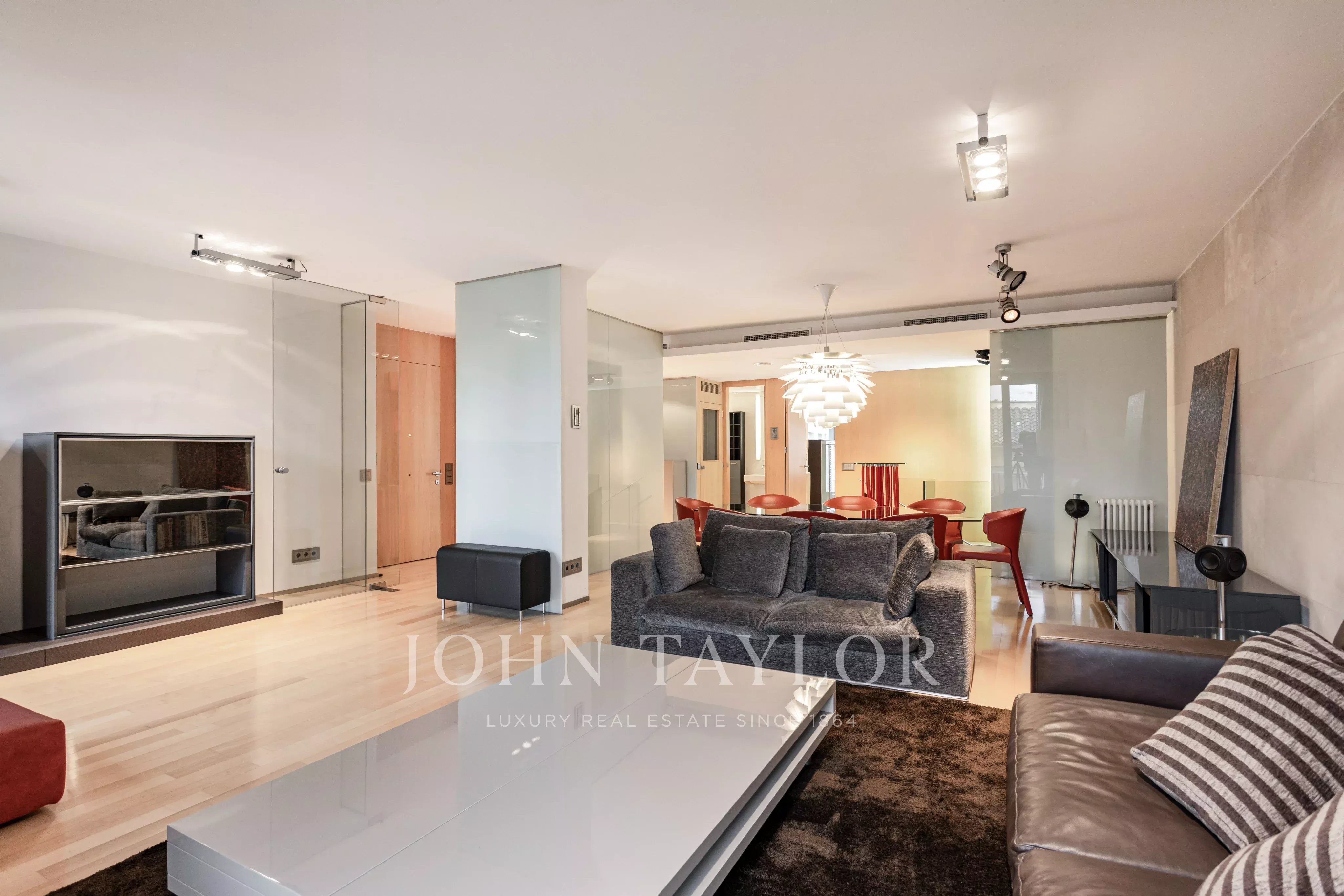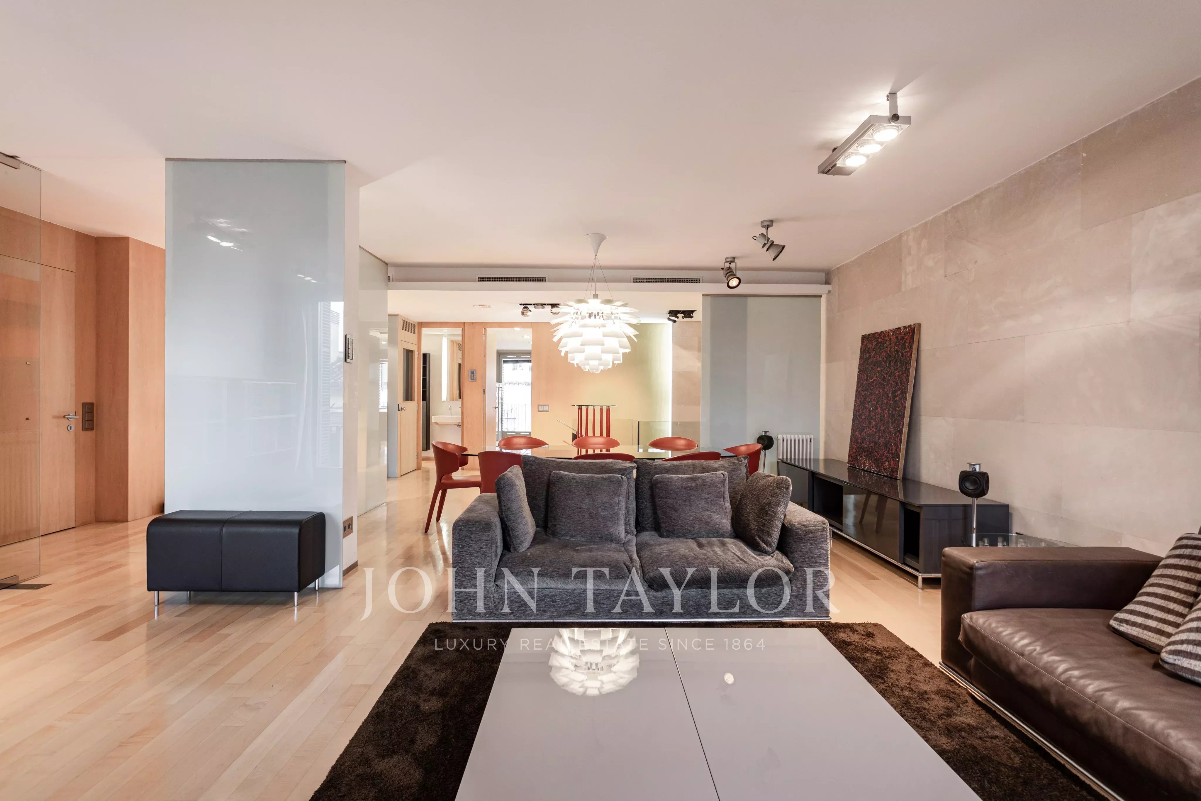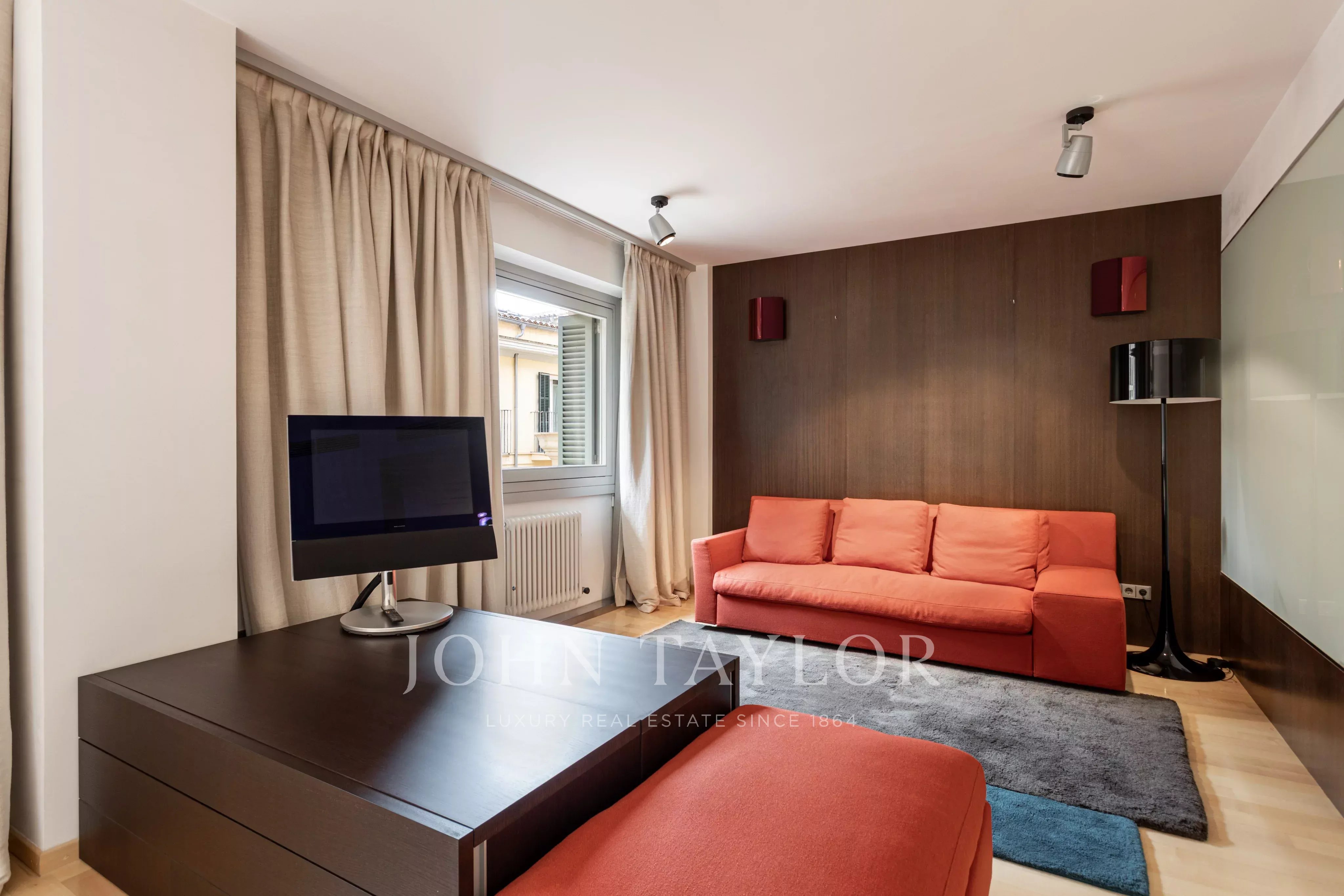 Die Wohnung erstreckt sich über zwei Ebenen, die sowohl über eine interne Treppe als auch über einen privaten Aufzug verbunden sind – ein seltenes Komfortmerkmal in dieser Lage.