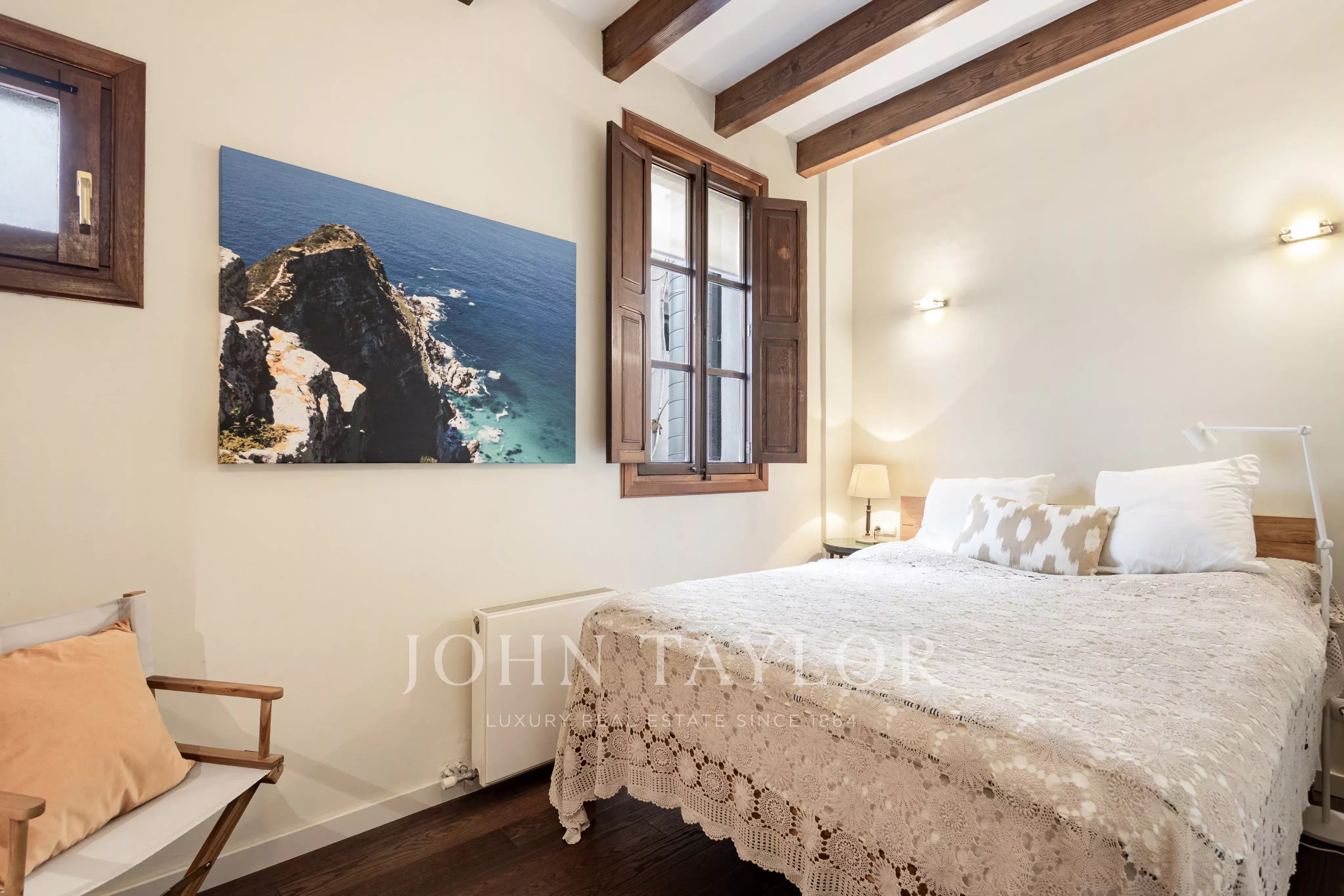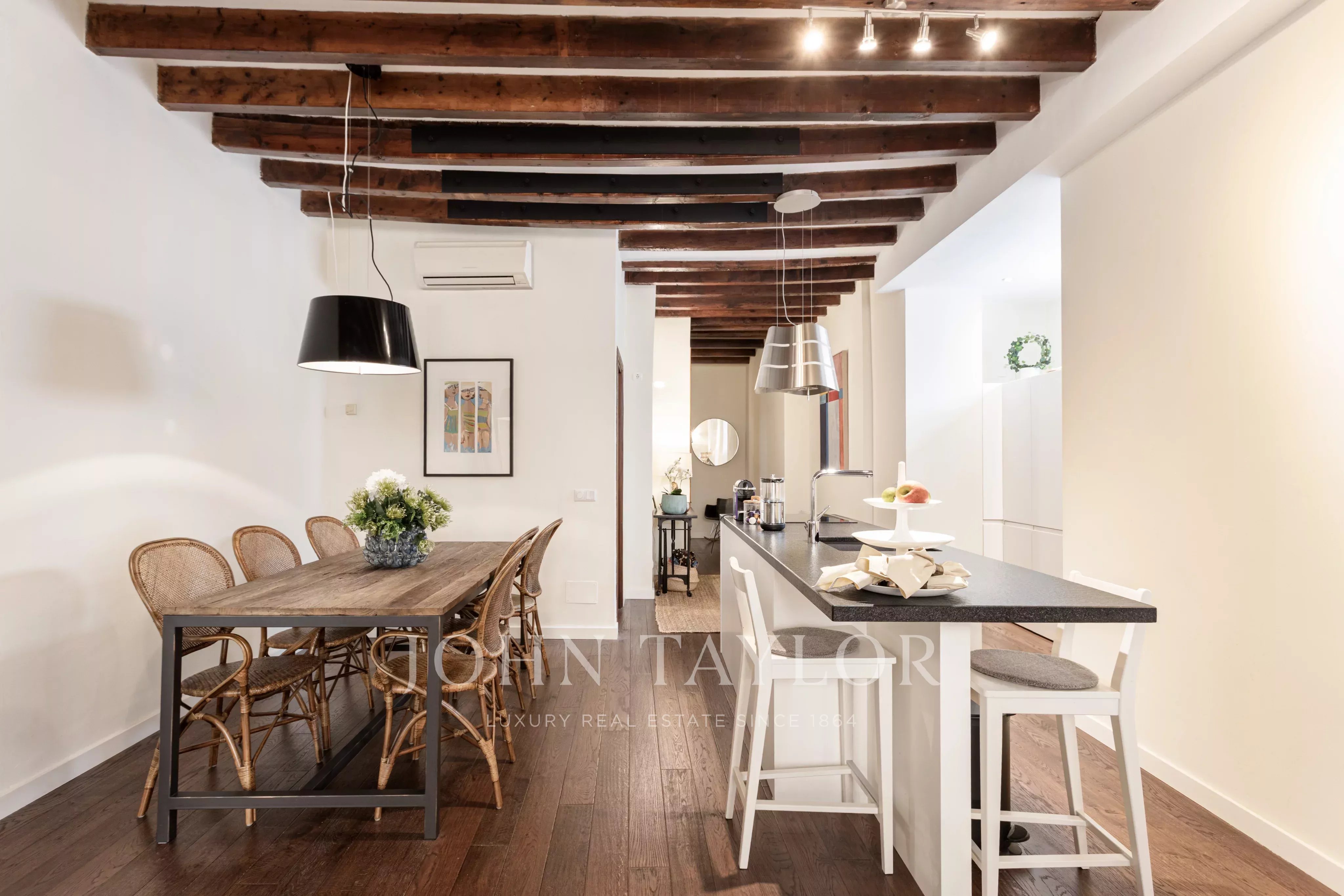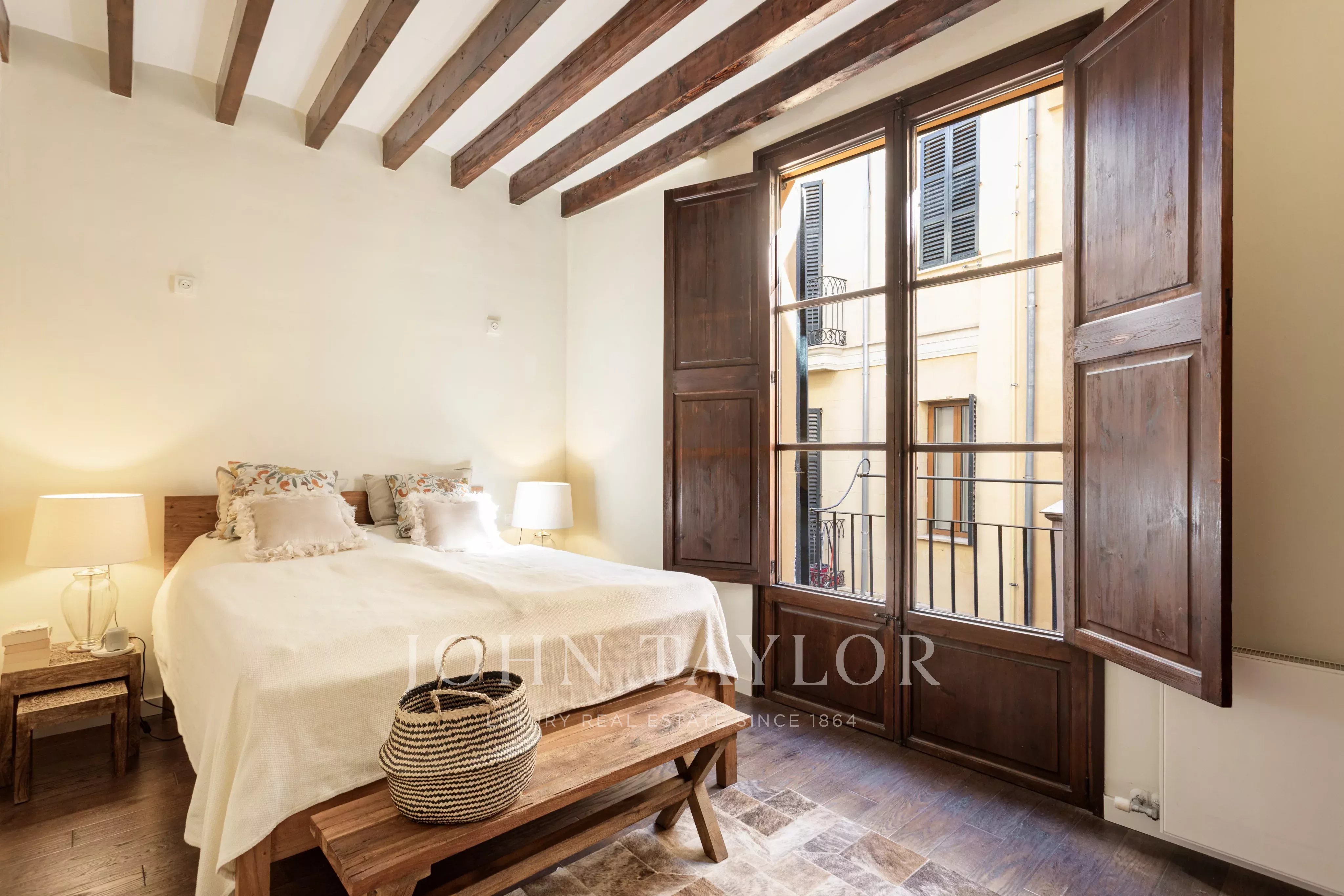 Die Wohnung ist durchdacht geplant, um Komfort und Privatsphäre zu gewährleisten: Die beiden Schlafzimmer befinden sich an gegenüberliegenden Enden der Wohnung, jeweils mit geräumigem en-suite Badezimmer und Einbauschränken, ideal zum Teilen oder für Gäste. Hohe Decken, originale dunkle Parkettböden und beeindruckende freiliegende Holzbalken verleihen dem Raum Charakter und zeitlose Eleganz.