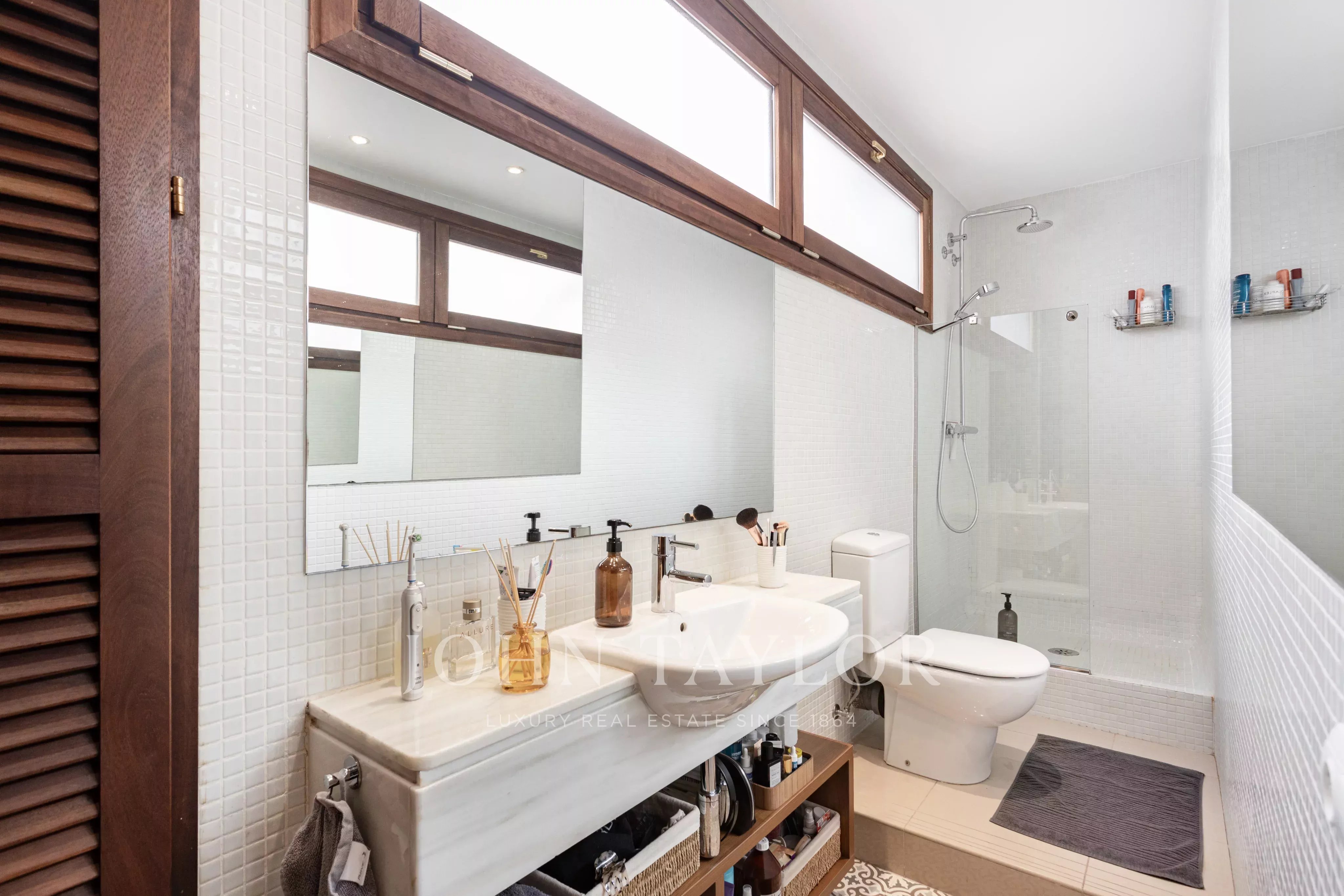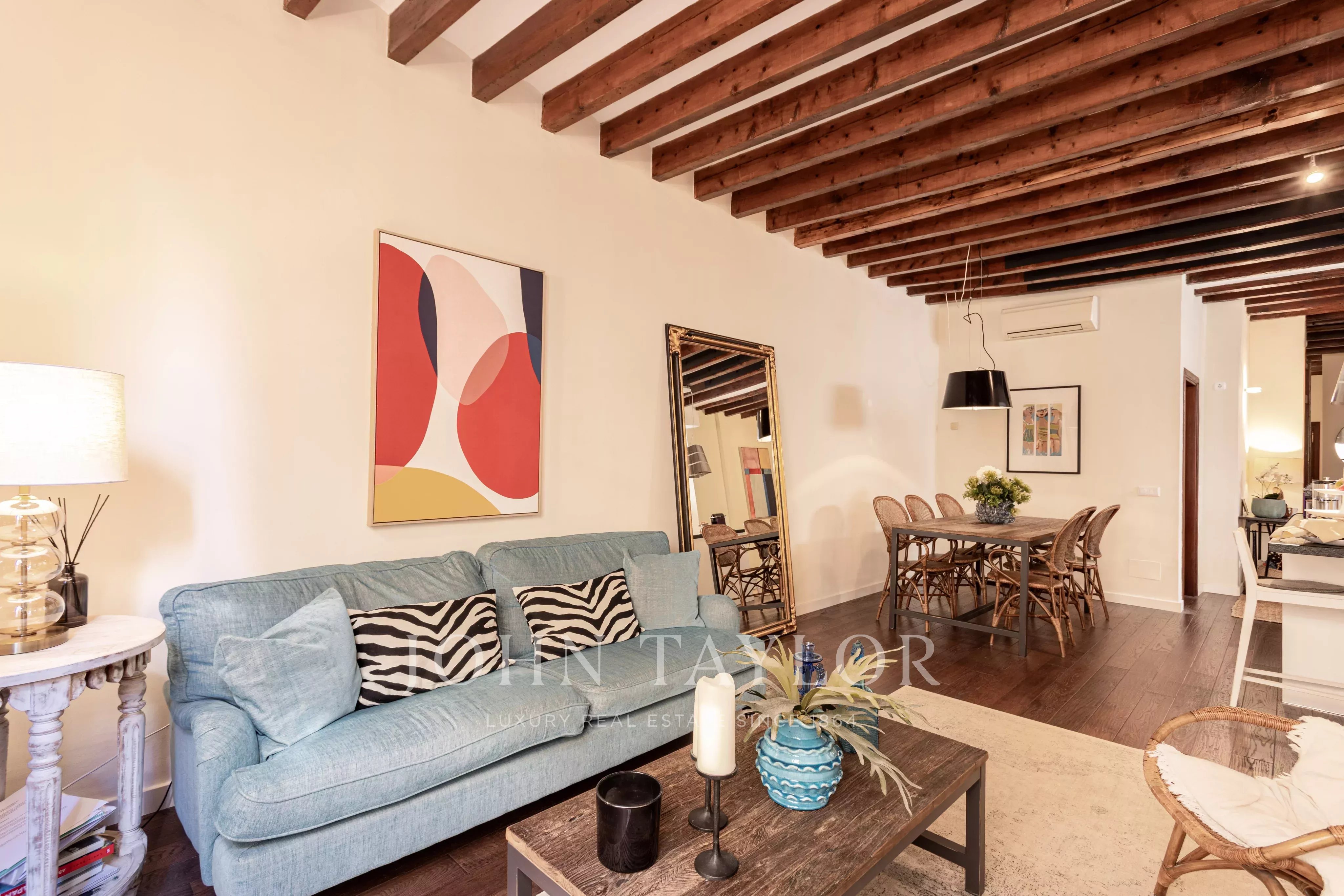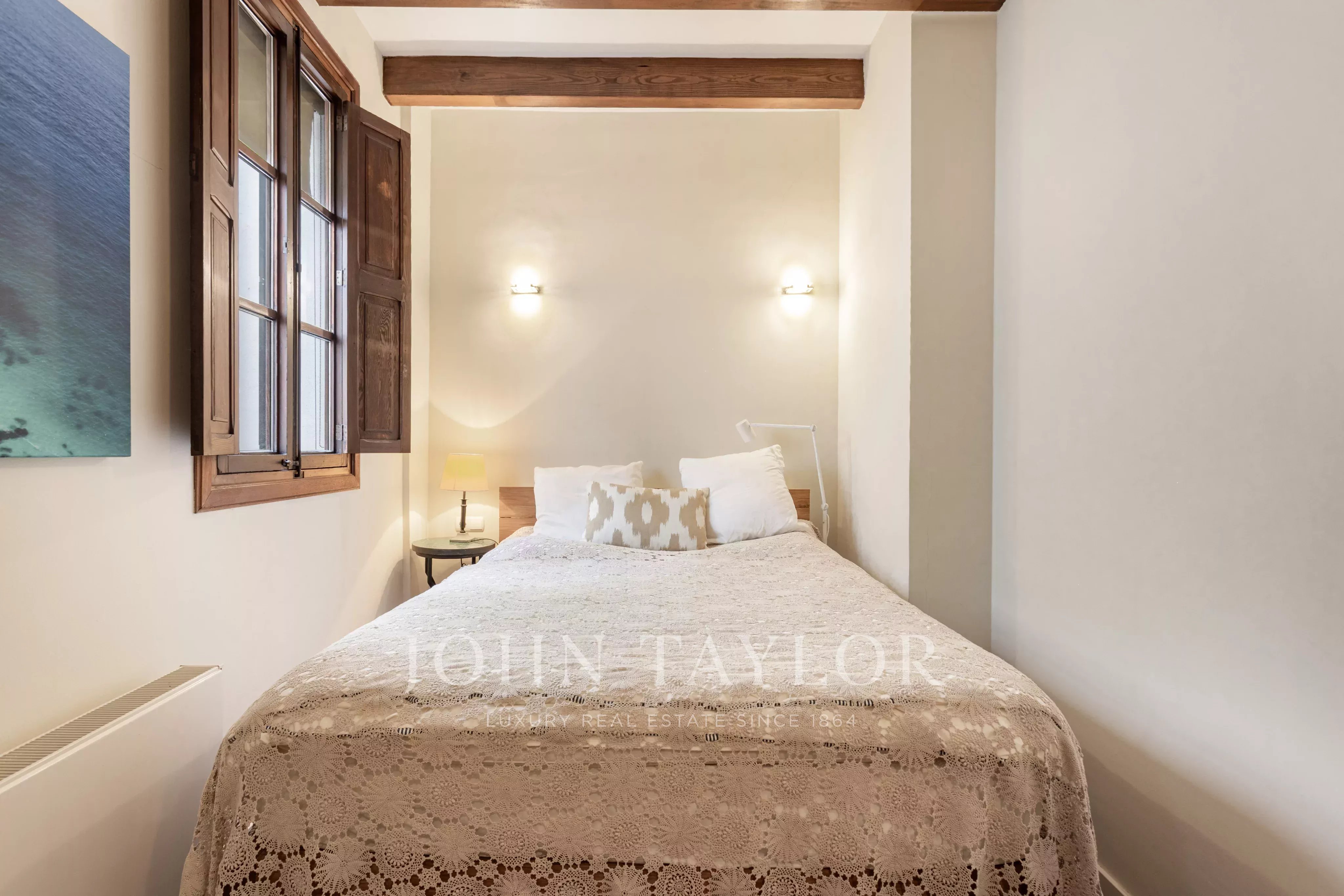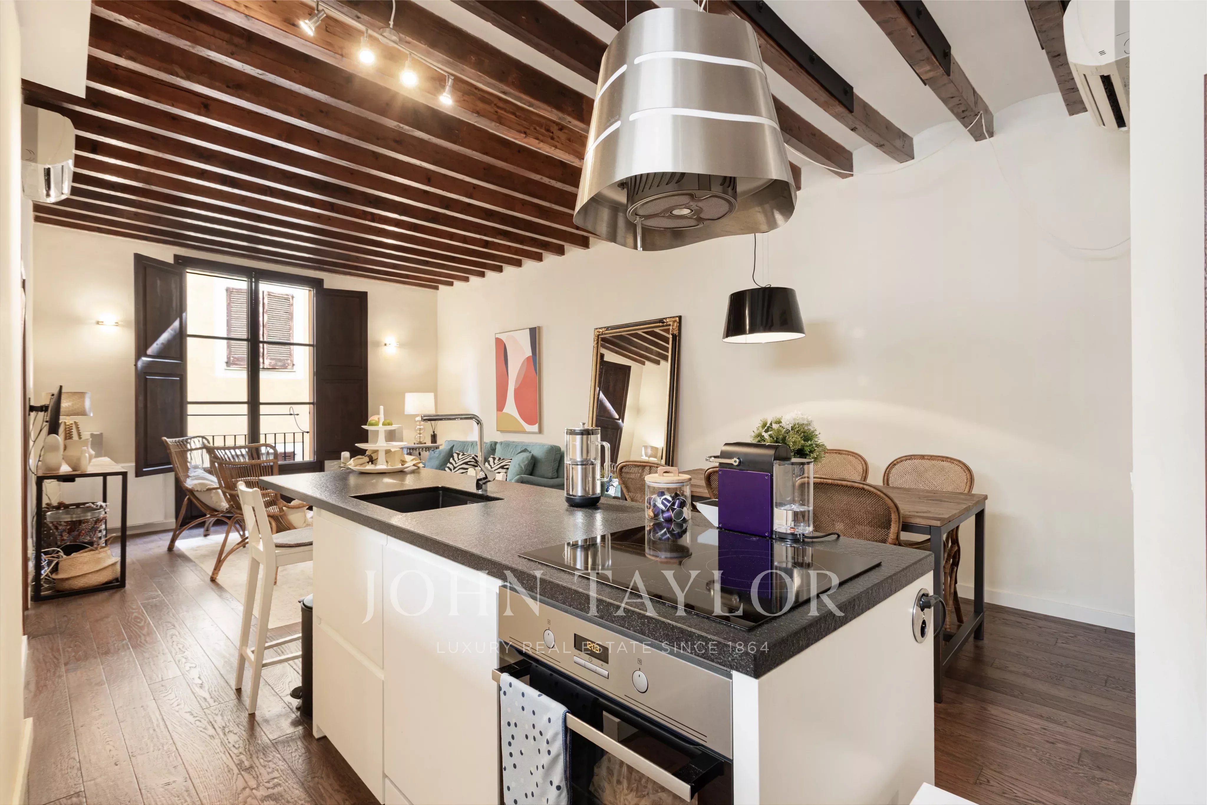 Die Wohnung ist durchdacht geplant, um Komfort und Privatsphäre zu gewährleisten: Die beiden Schlafzimmer befinden sich an gegenüberliegenden Enden der Wohnung, jeweils mit geräumigem en-suite Badezimmer und Einbauschränken, ideal zum Teilen oder für Gäste. Hohe Decken, originale dunkle Parkettböden und beeindruckende freiliegende Holzbalken verleihen dem Raum Charakter und zeitlose Eleganz.