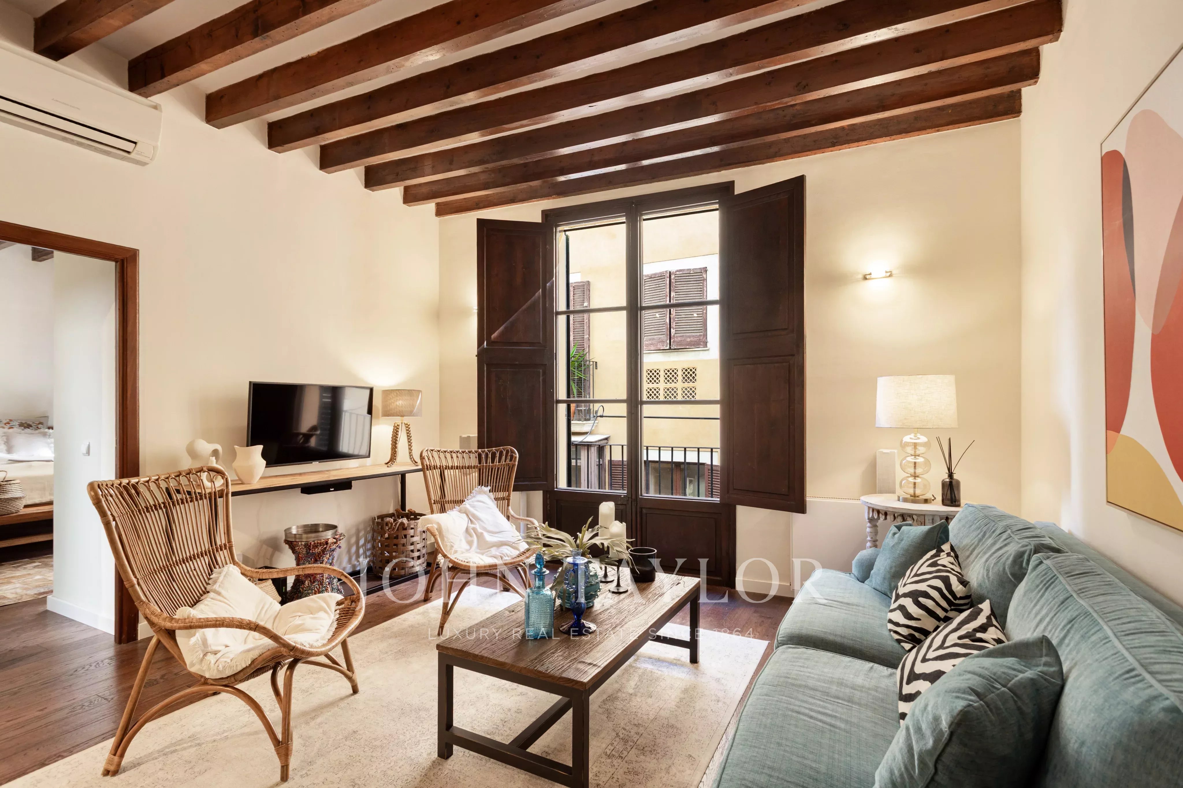 Der offene Wohn- und Essbereich verbindet sich nahtlos mit einer modernen, voll ausgestatteten Küche mit Kochinsel, perfekt zum Unterhalten. Zwei charmante französische Balkone, schaffen ein nahtloses Gefühl von Indoor-Outdoor-Living. Mit traditionellen mallorquinischen Fensterläden und ohne Stufen zwischen Wohnbereich und Balkonen werden diese zu einer Erweiterung der Wohnung, bieten vollständige Privatsphäre und einen ruhigen Ort zum Entspannen oder einen Drink im Freien.