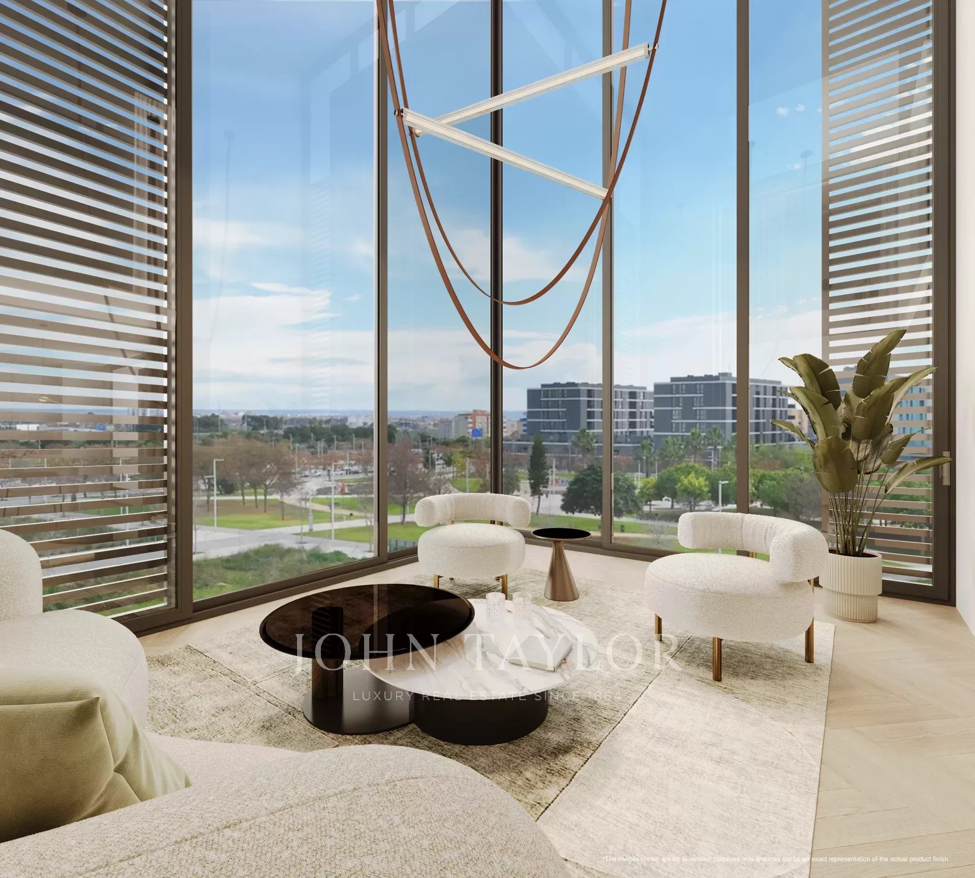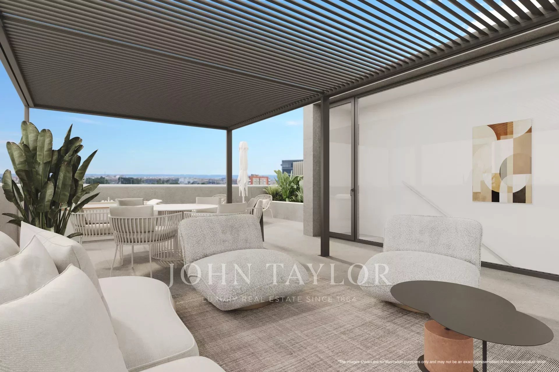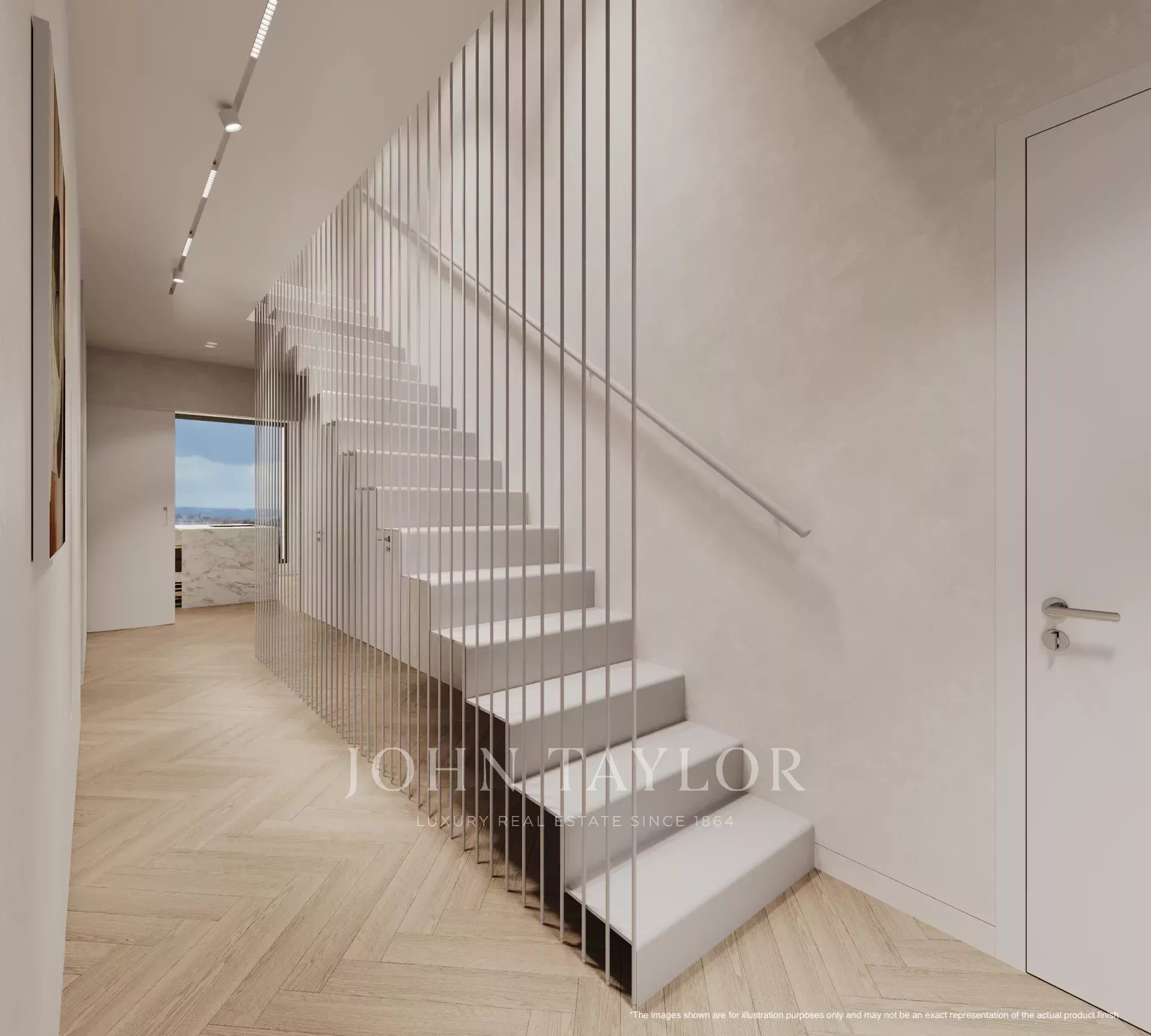 Dieses Penthouse im 4. Stock bietet eine voll ausgestattete offene Küche, Ess- und Wohnbereich mit 2 Schlafzimmern und 2 Bädern (1 ensuite). Über die Innentreppe gelangen Sie auf die herrliche 103 m² große Terrasse, die reichlich Platz bietet, um einen Lounge-, Ess- und Unterhaltungsbereich im Freien einzurichten. Mit einer bebauten Gesamtfläche von 270 m² und einer Innenwohnfläche von 98 m² erwartet Sie eine komfortable und stilvolle Atmosphäre. Sie können zwischen drei Innenausstattungen wählen: Adagio, Arta und Raw.