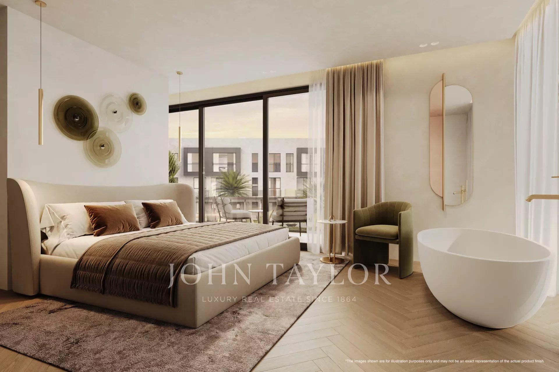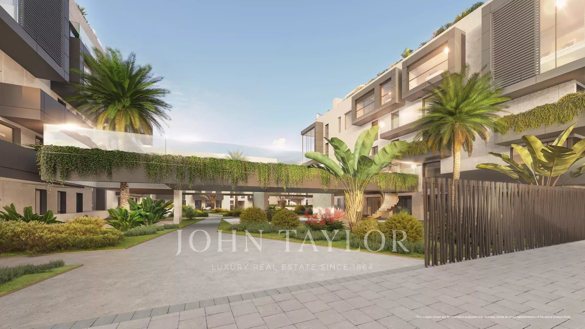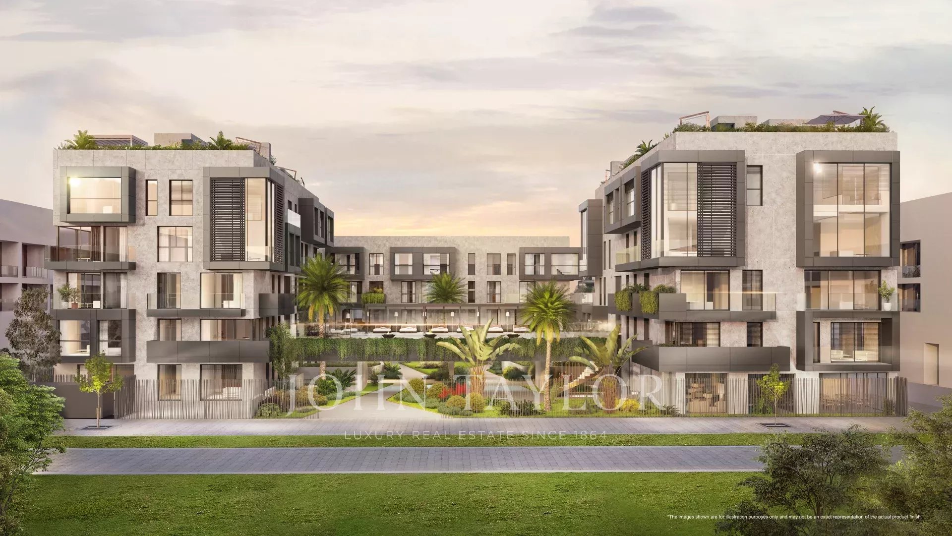 Dieses Penthouse im 4. Stock bietet eine voll ausgestattete offene Küche, Ess- und Wohnbereich mit 2 Schlafzimmern und 2 Bädern (1 ensuite). Über die Innentreppe gelangen Sie auf die herrliche 103 m² große Terrasse, die reichlich Platz bietet, um einen Lounge-, Ess- und Unterhaltungsbereich im Freien einzurichten. Mit einer bebauten Gesamtfläche von 270 m² und einer Innenwohnfläche von 98 m² erwartet Sie eine komfortable und stilvolle Atmosphäre. Sie können zwischen drei Innenausstattungen wählen: Adagio, Arta und Raw.