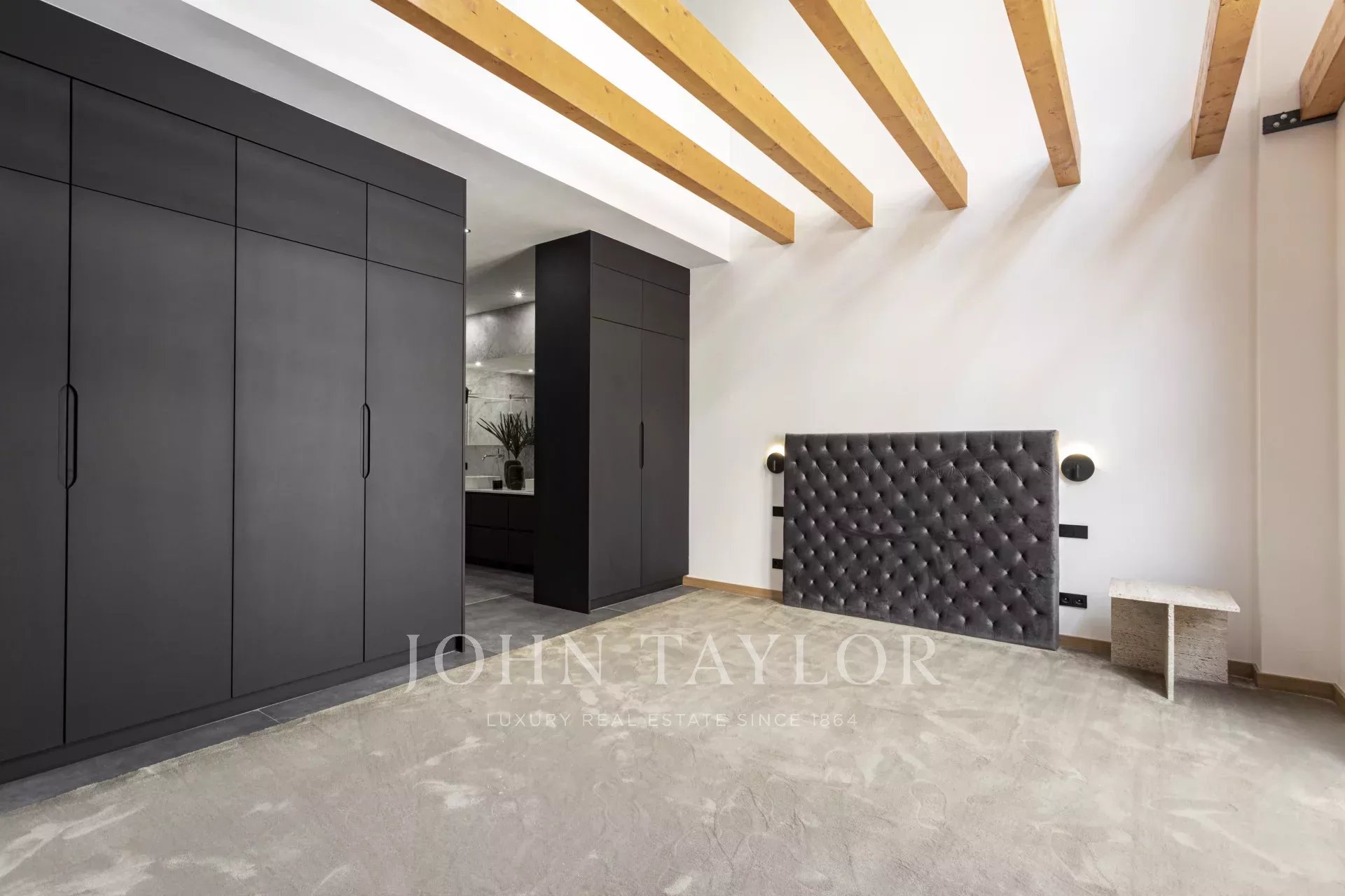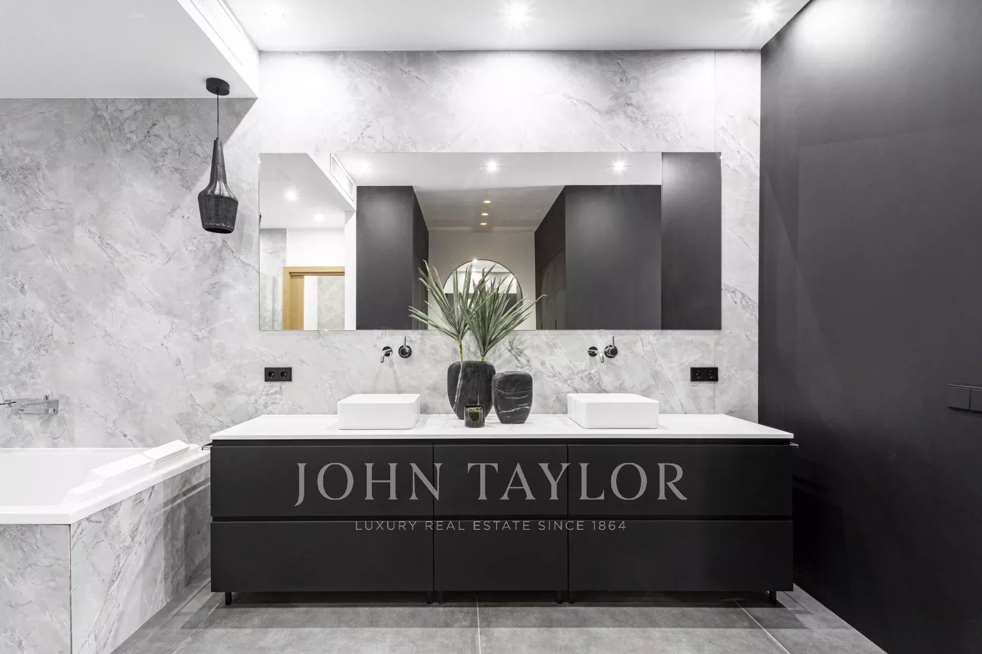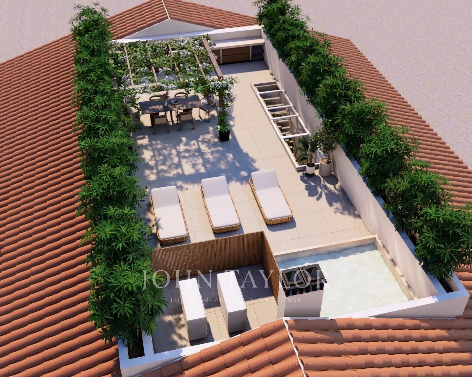 Das Hauptschlafzimmer mit Ankleidebereich und eigenem Bad sorgt für maximalen Wohnkomfort auf einer Etage. Über die "schwebende Treppe" gelangt man in die erste Etage zu den zwei weiteren Schlafzimmern, beide mit eigenem Bad und einem zusätzlichen Wohnbereich. Die 100 m² große Dachterrasse ist zweifellos das Schmuckstück des Hauses, mit einer Außenküche, einem Ess- und einem Loungebereich, der durch das sanfte Rauschen des Wasserbrunnens ergänzt wird. Die Immobilie verfügt über einen Außenparkplatz, Fußbodenheizung, Zentralklimaanlage und wird möbliert verkauft.