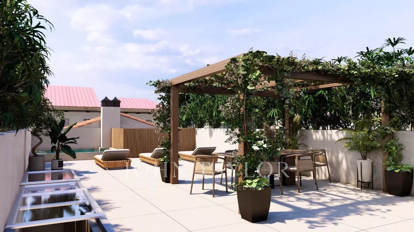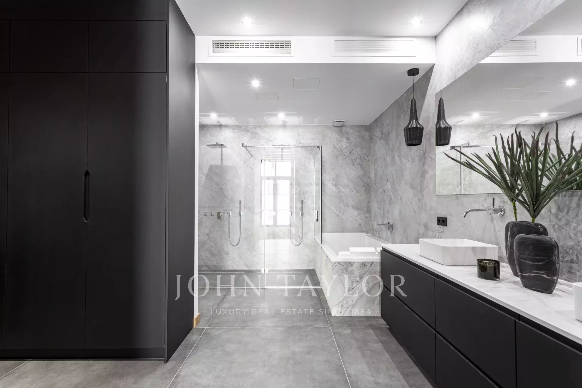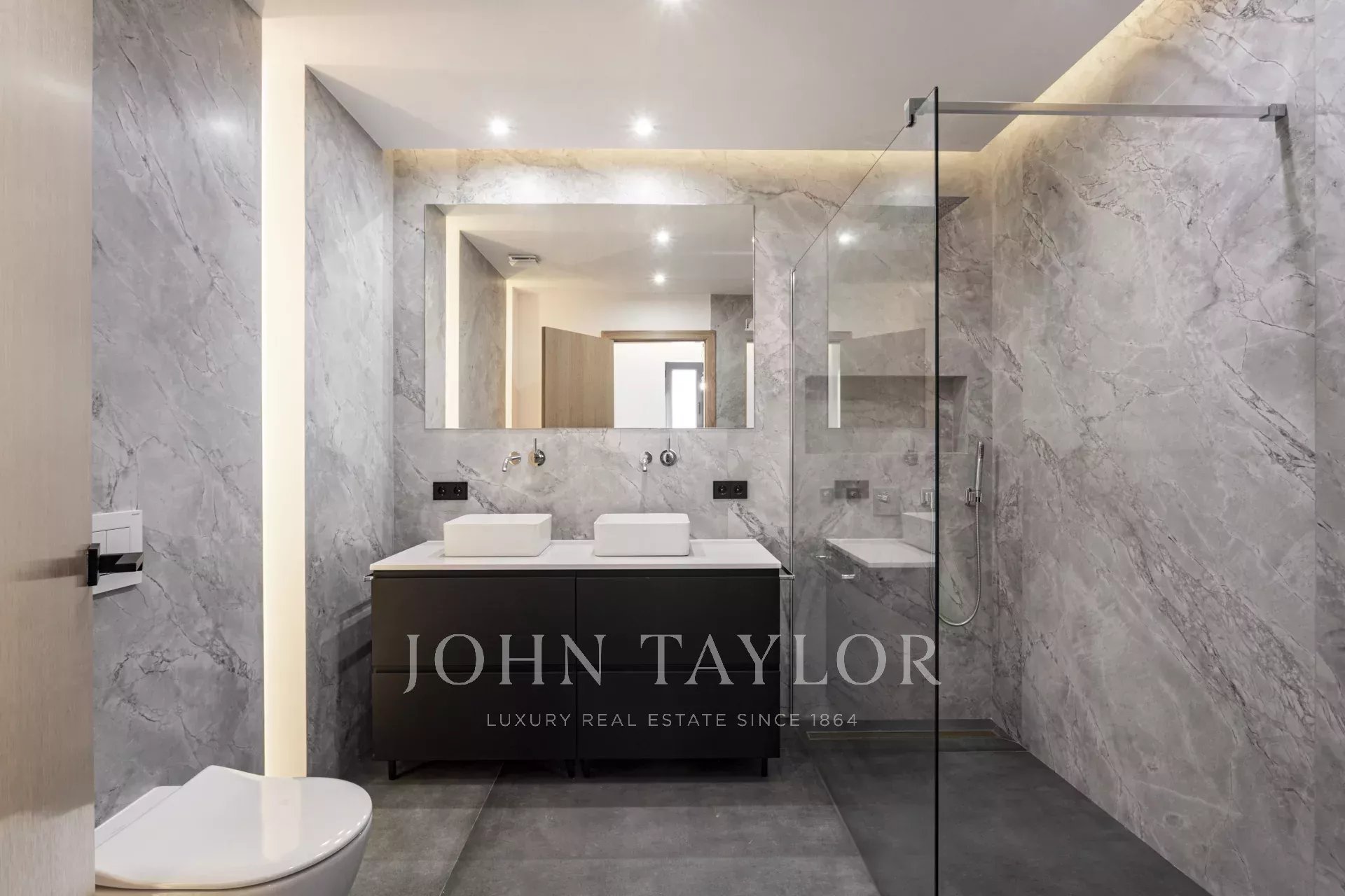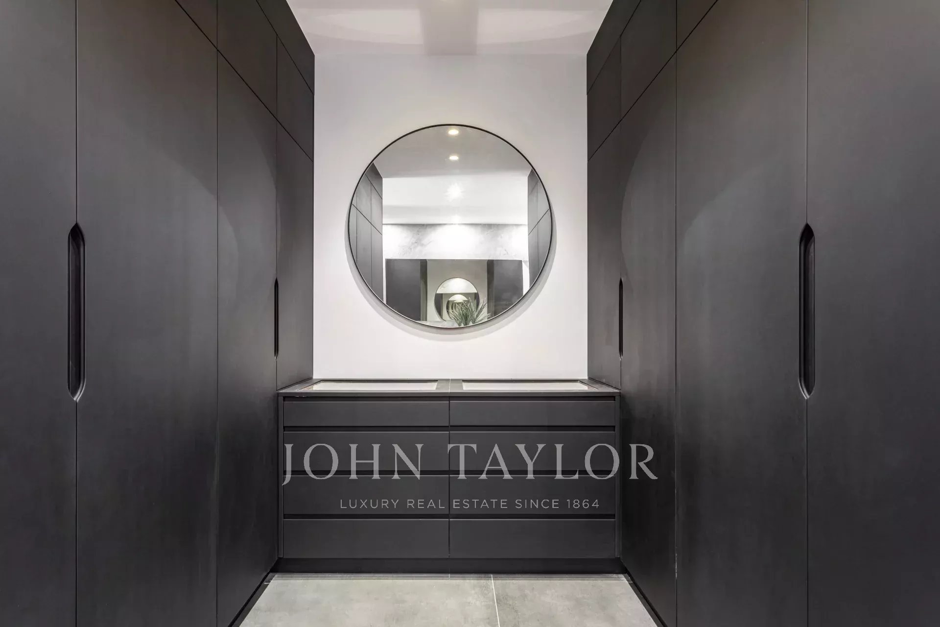 Das Hauptschlafzimmer mit Ankleidebereich und eigenem Bad sorgt für maximalen Wohnkomfort auf einer Etage. Über die "schwebende Treppe" gelangt man in die erste Etage zu den zwei weiteren Schlafzimmern, beide mit eigenem Bad und einem zusätzlichen Wohnbereich. Die 100 m² große Dachterrasse ist zweifellos das Schmuckstück des Hauses, mit einer Außenküche, einem Ess- und einem Loungebereich, der durch das sanfte Rauschen des Wasserbrunnens ergänzt wird. Die Immobilie verfügt über einen Außenparkplatz, Fußbodenheizung, Zentralklimaanlage und wird möbliert verkauft.