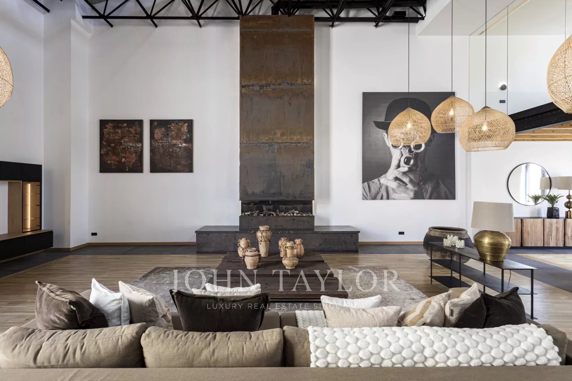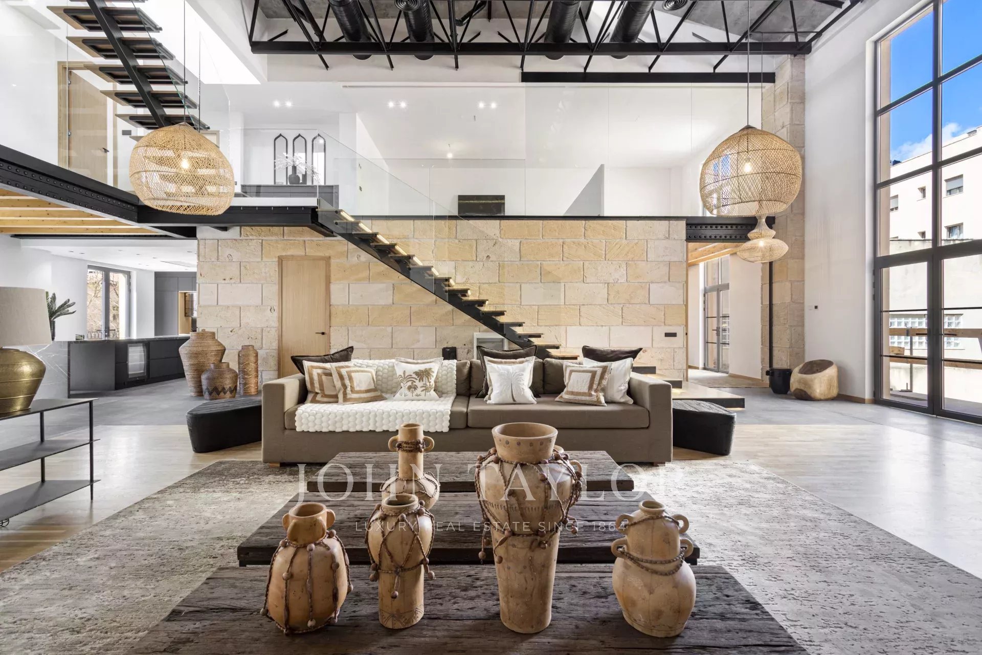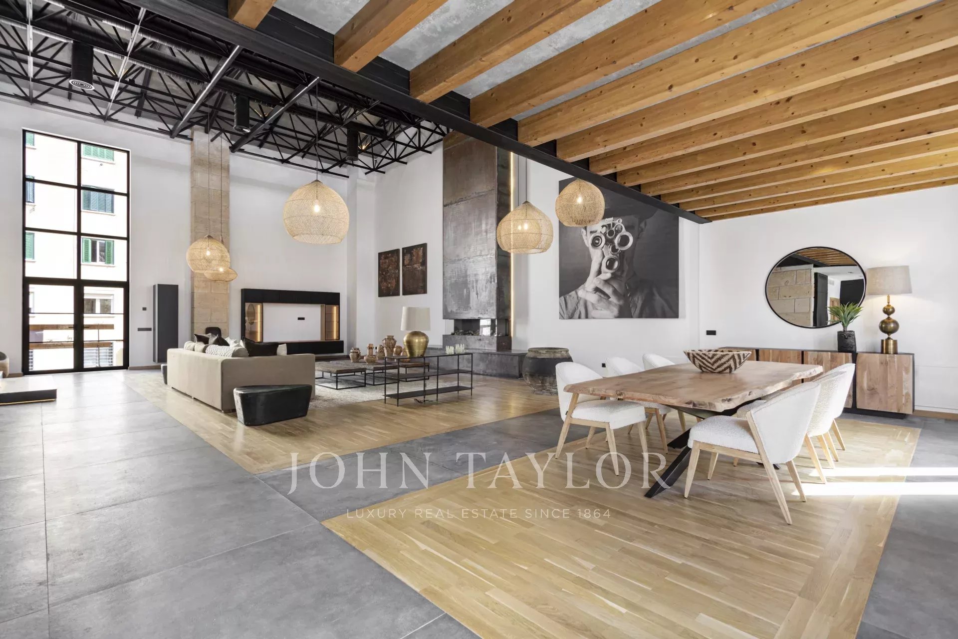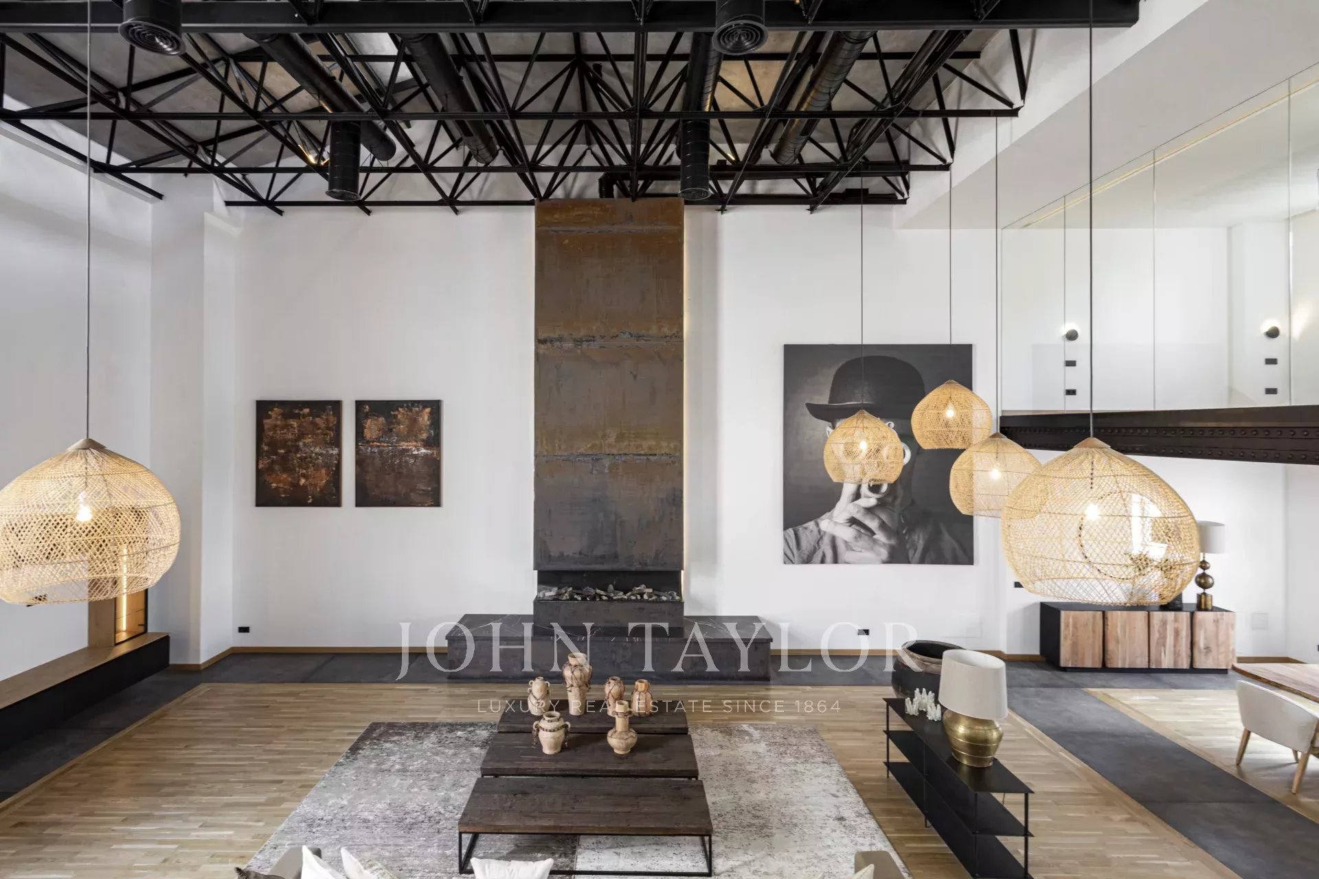 Schon beim Betreten der Wohnung ist man beeindruckt von den 6,80 m2 hohen Decken, dem immensen natürlichen Licht und dem Platz, den die Wohnung bietet. Im Erdgeschoss befindet sich eine großartige, 166 m² große, offene Raumaufteilung, die eine voll ausgestattete Küche mit Insel und Sitzgelegenheiten, einen formellen Essbereich und einen Wohnbereich mit offenem Kamin umfasst.