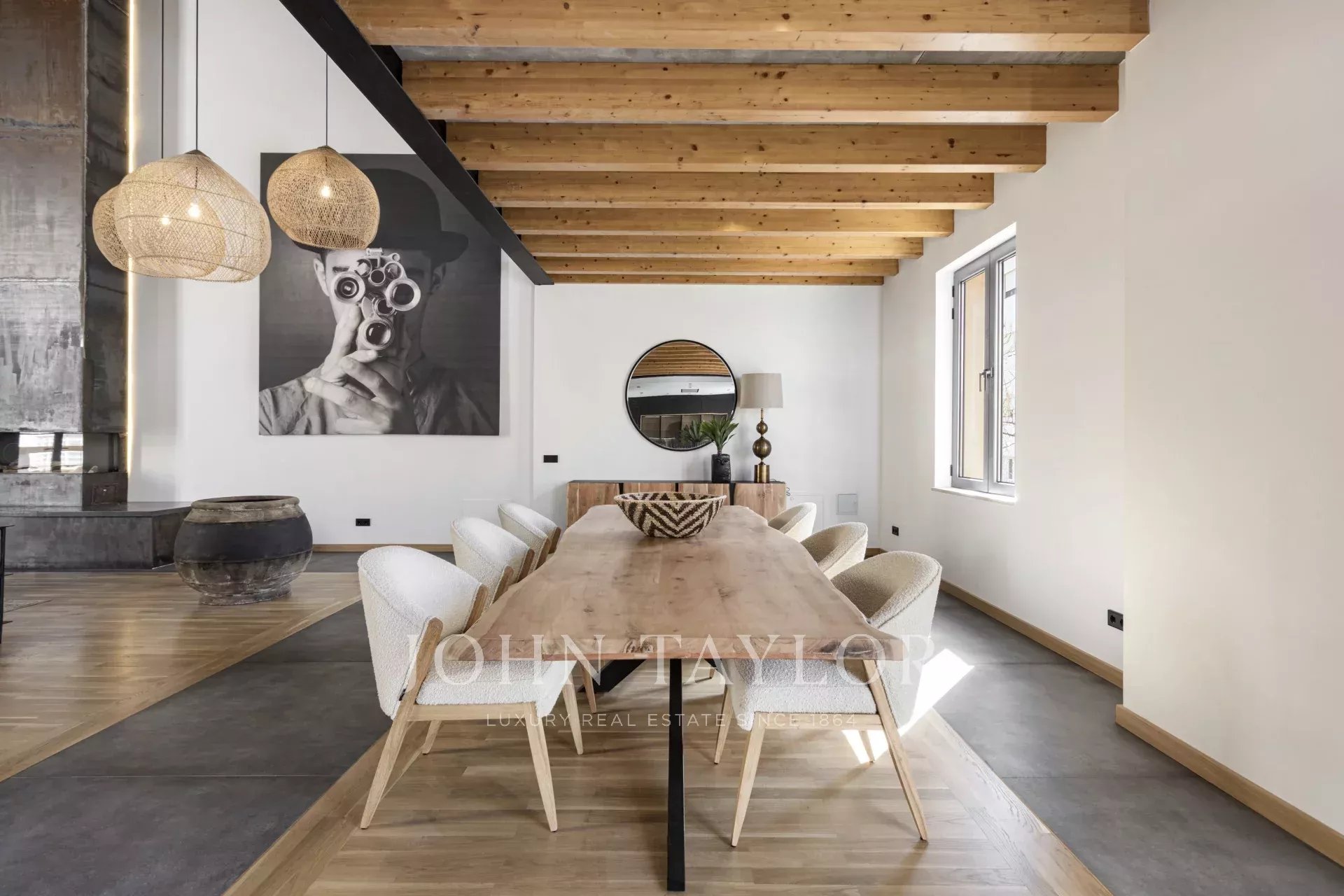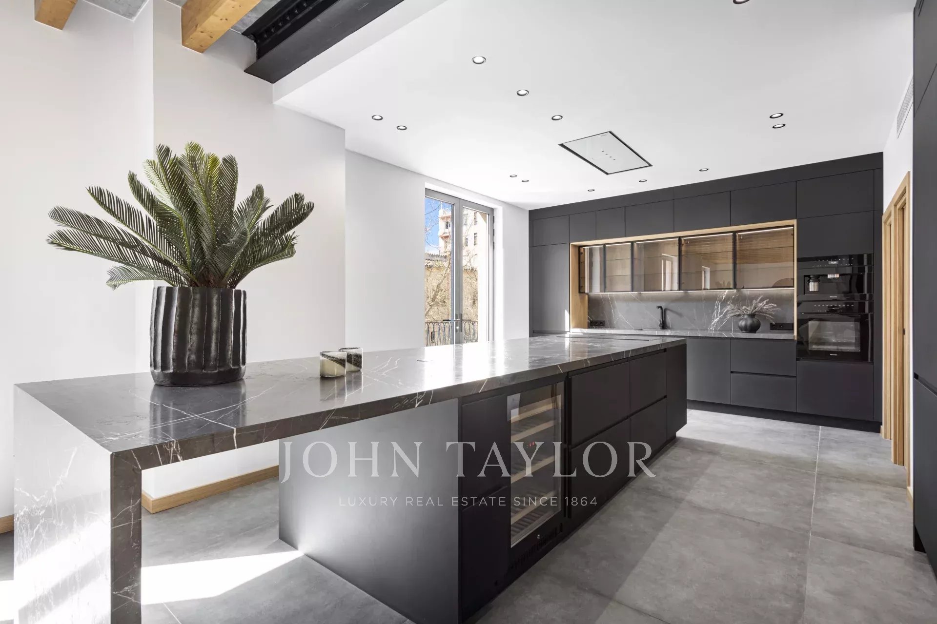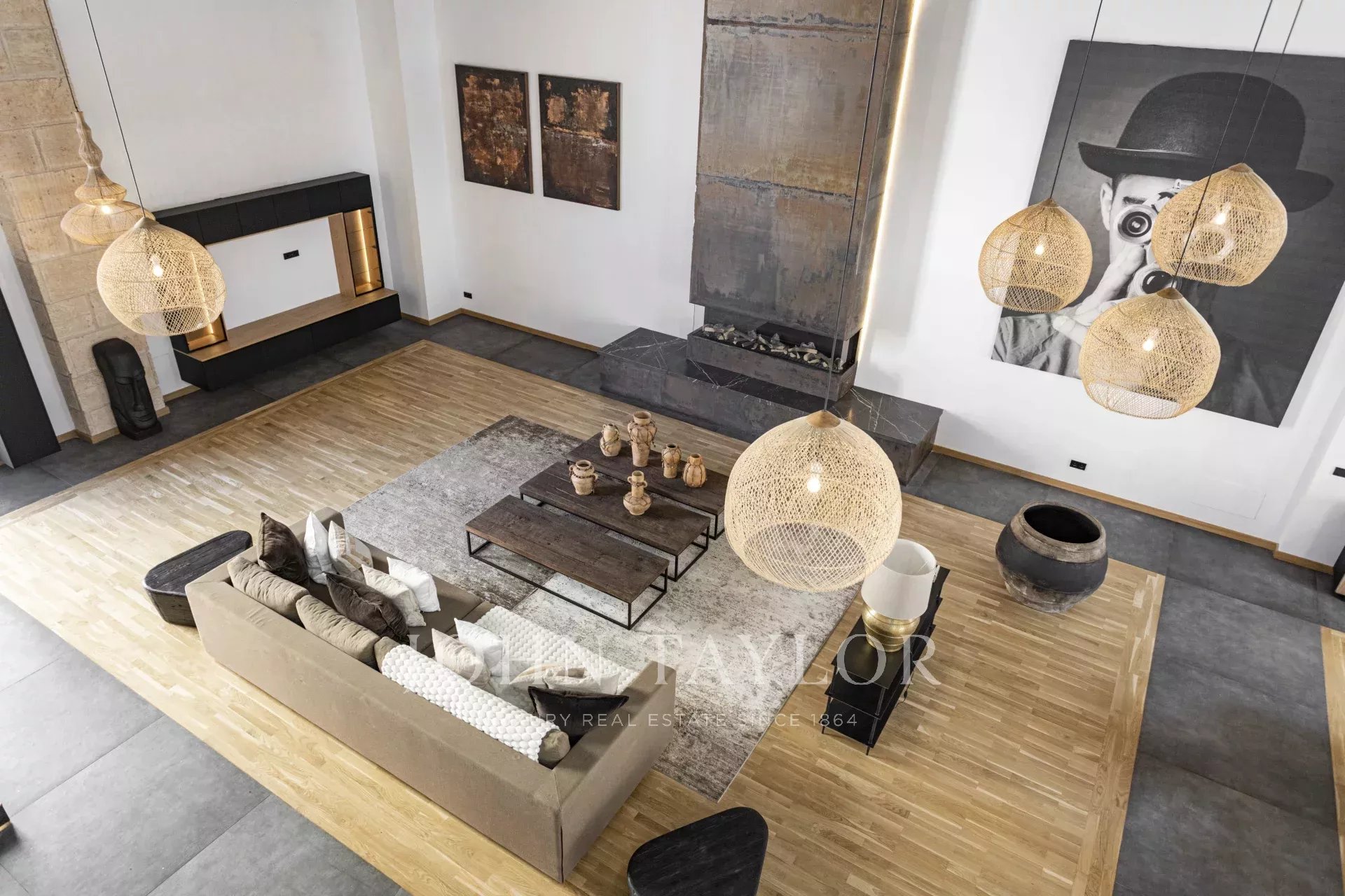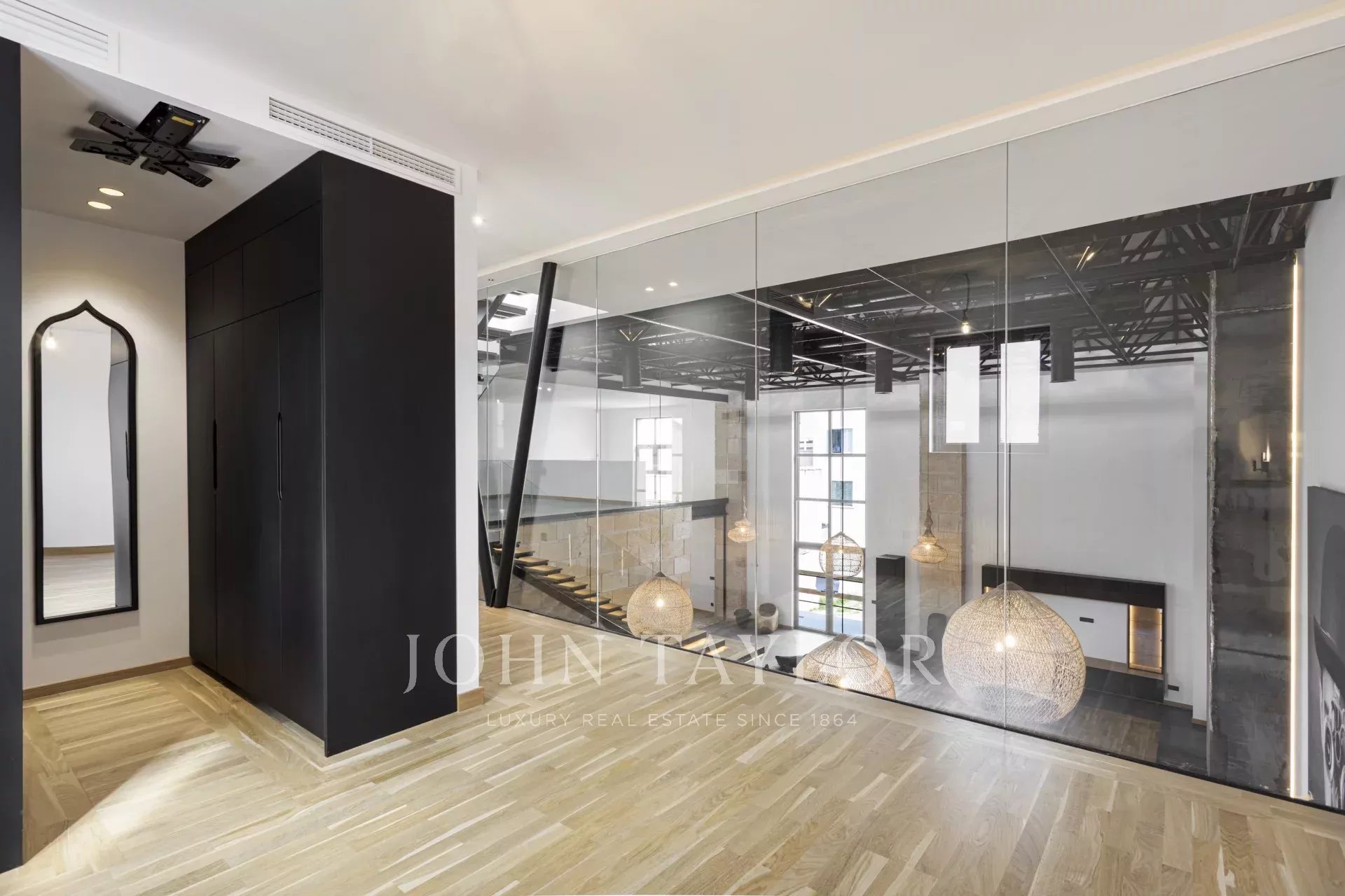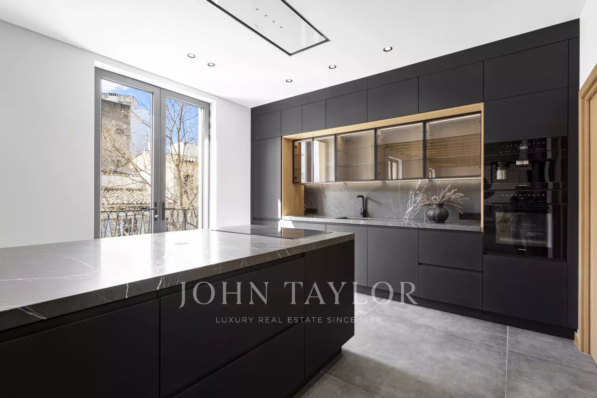 Schon beim Betreten der Wohnung ist man beeindruckt von den 6,80 m2 hohen Decken, dem immensen natürlichen Licht und dem Platz, den die Wohnung bietet. Im Erdgeschoss befindet sich eine großartige, 166 m² große, offene Raumaufteilung, die eine voll ausgestattete Küche mit Insel und Sitzgelegenheiten, einen formellen Essbereich und einen Wohnbereich mit offenem Kamin umfasst.