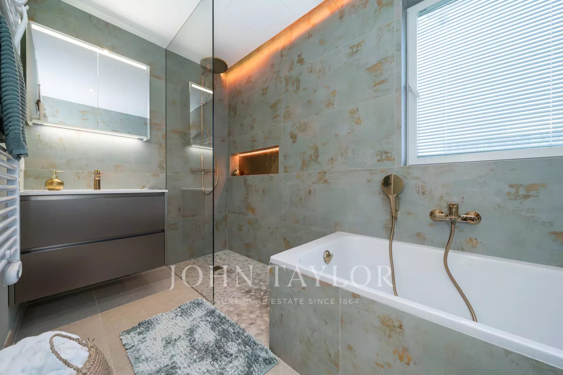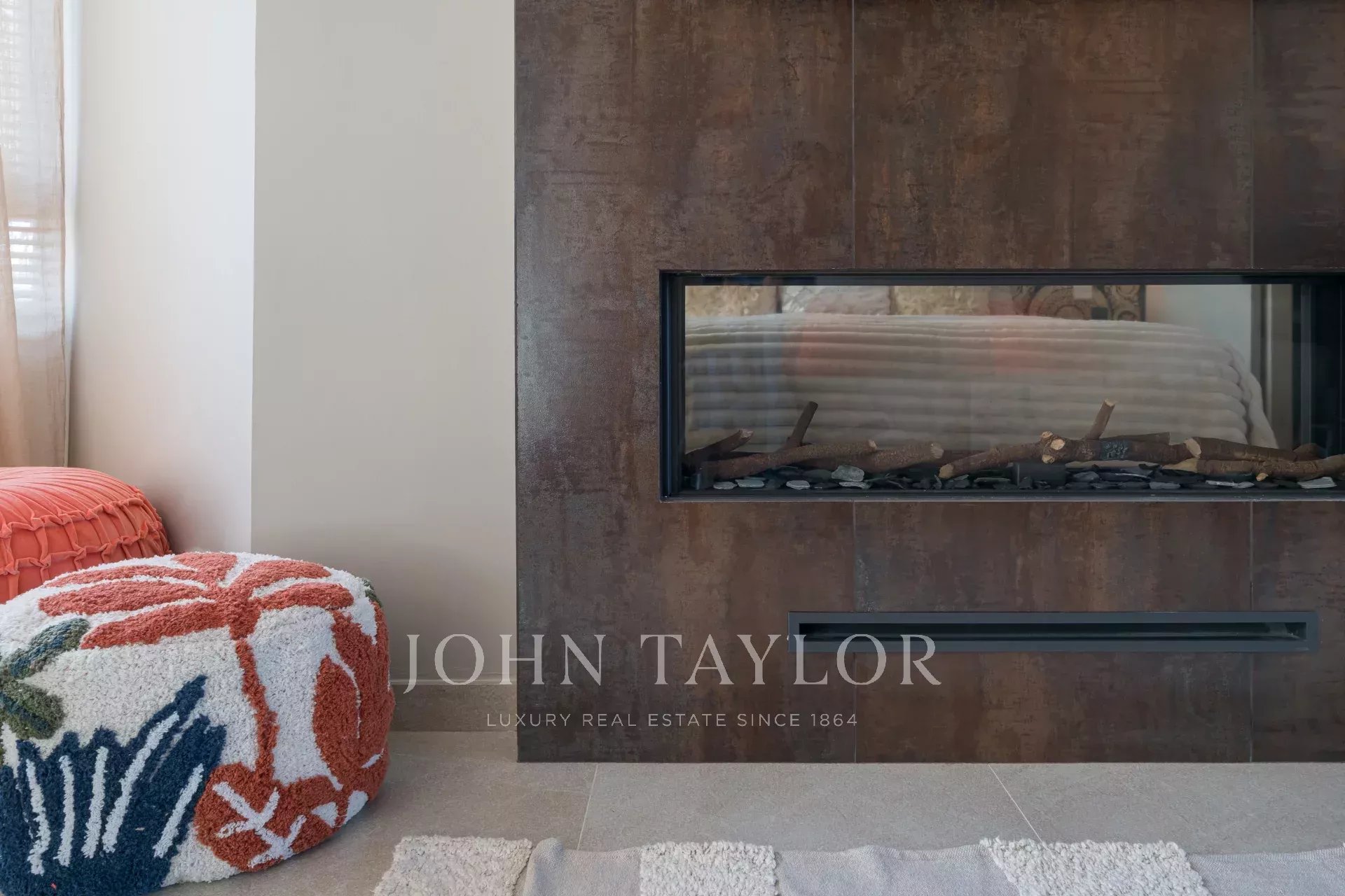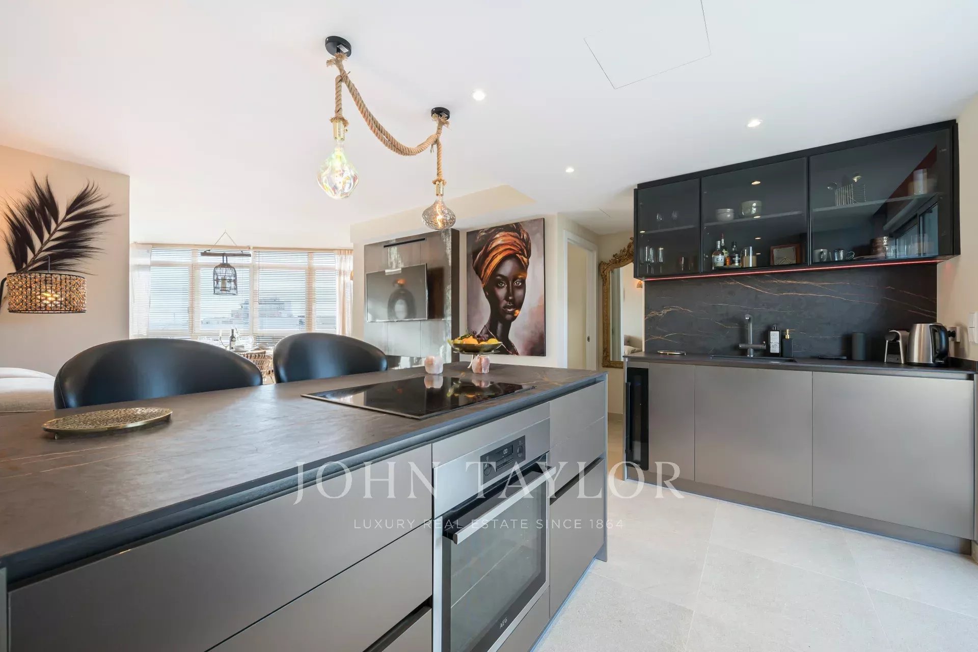Auf 150 Quadratmetern bietet dieses Penthouse 75 Quadratmeter stilvollen Innenraum, darunter eine offene Küche, einen Ess- und Wohnbereich, der sich um einen doppelseitigen Gaskamin gruppiert. Die Wohnung bietet zwei gut ausgestattete Schlafzimmer und ein luxuriöses Badezimmer, das mit hochwertigen Oberflächen ausgestattet ist.