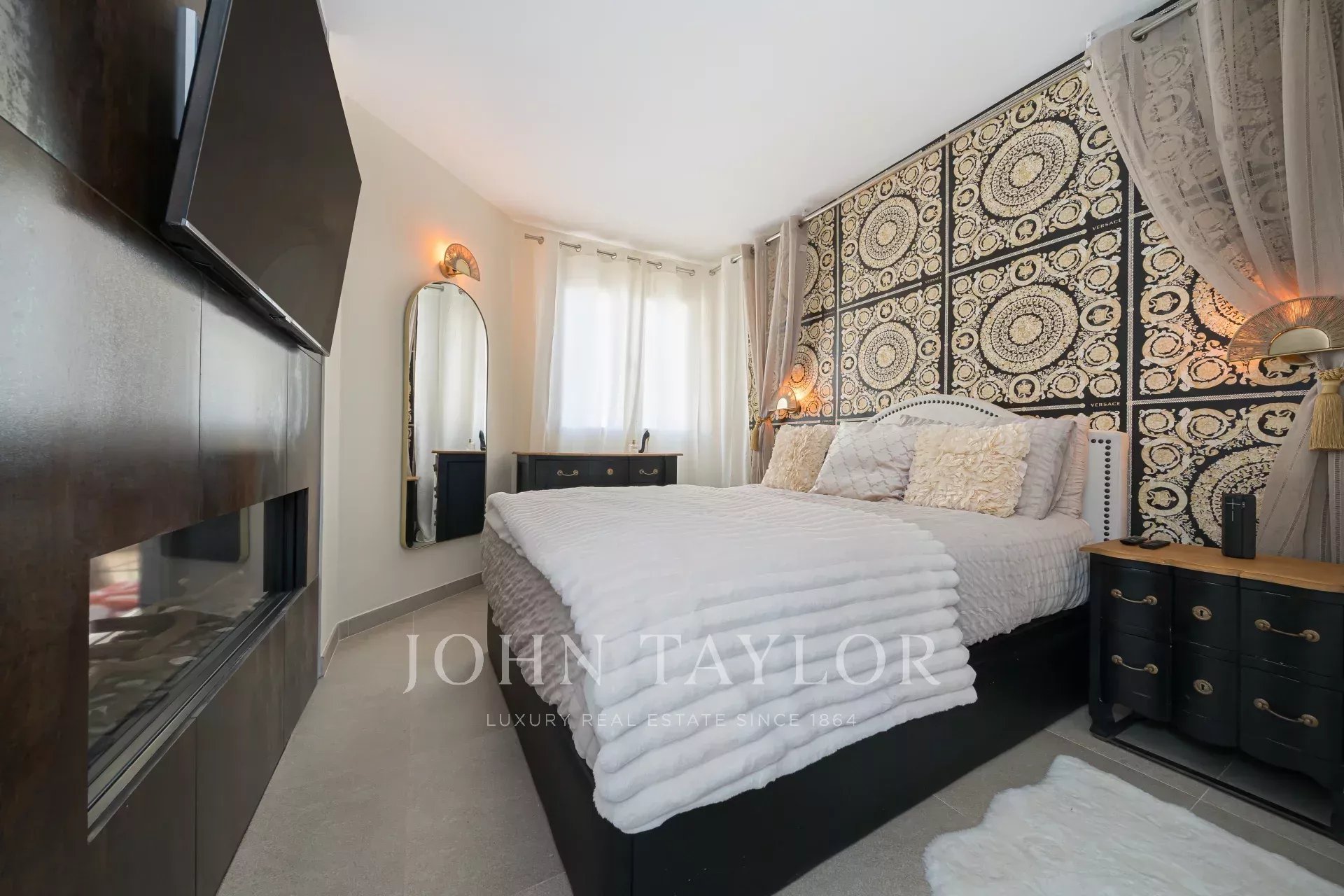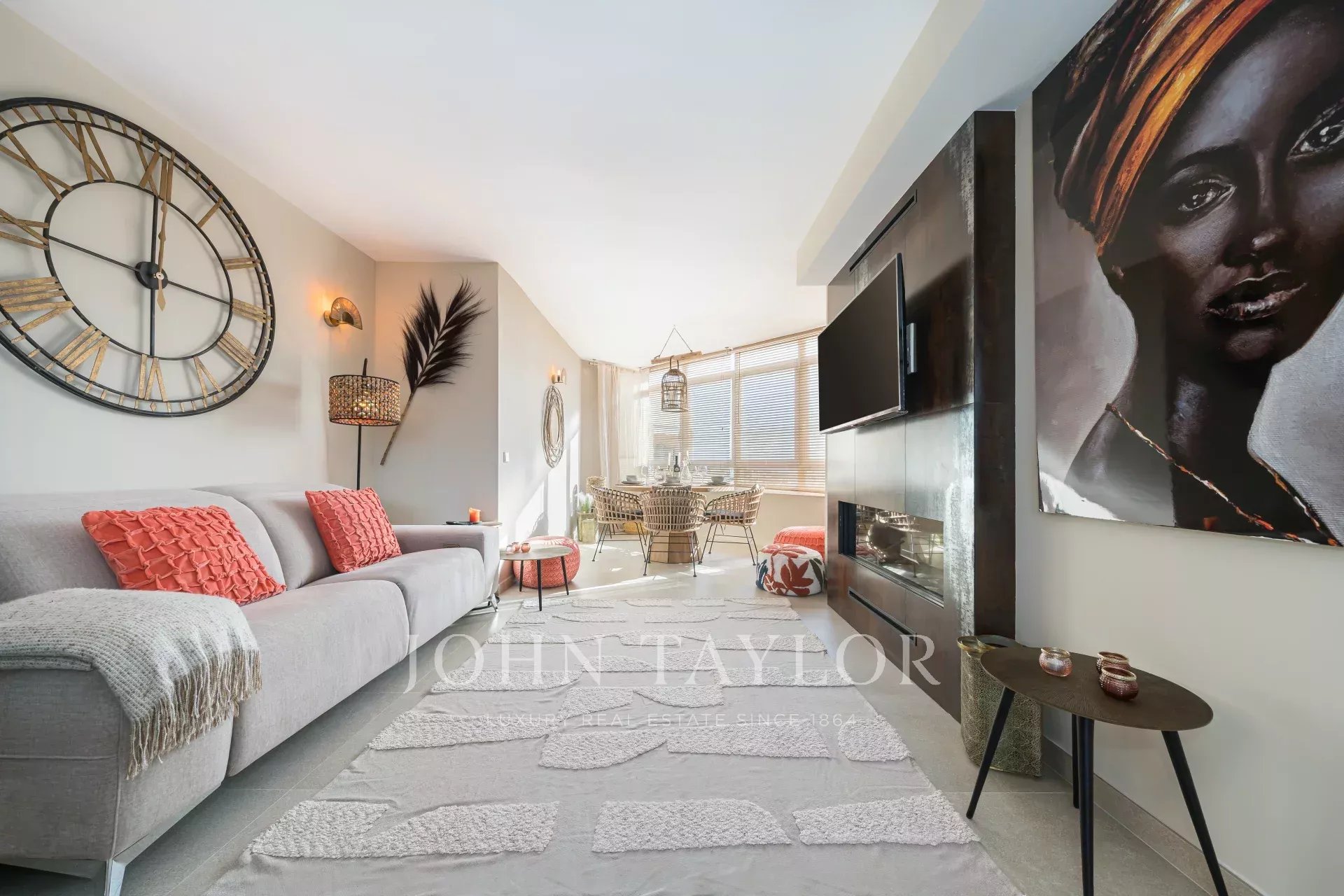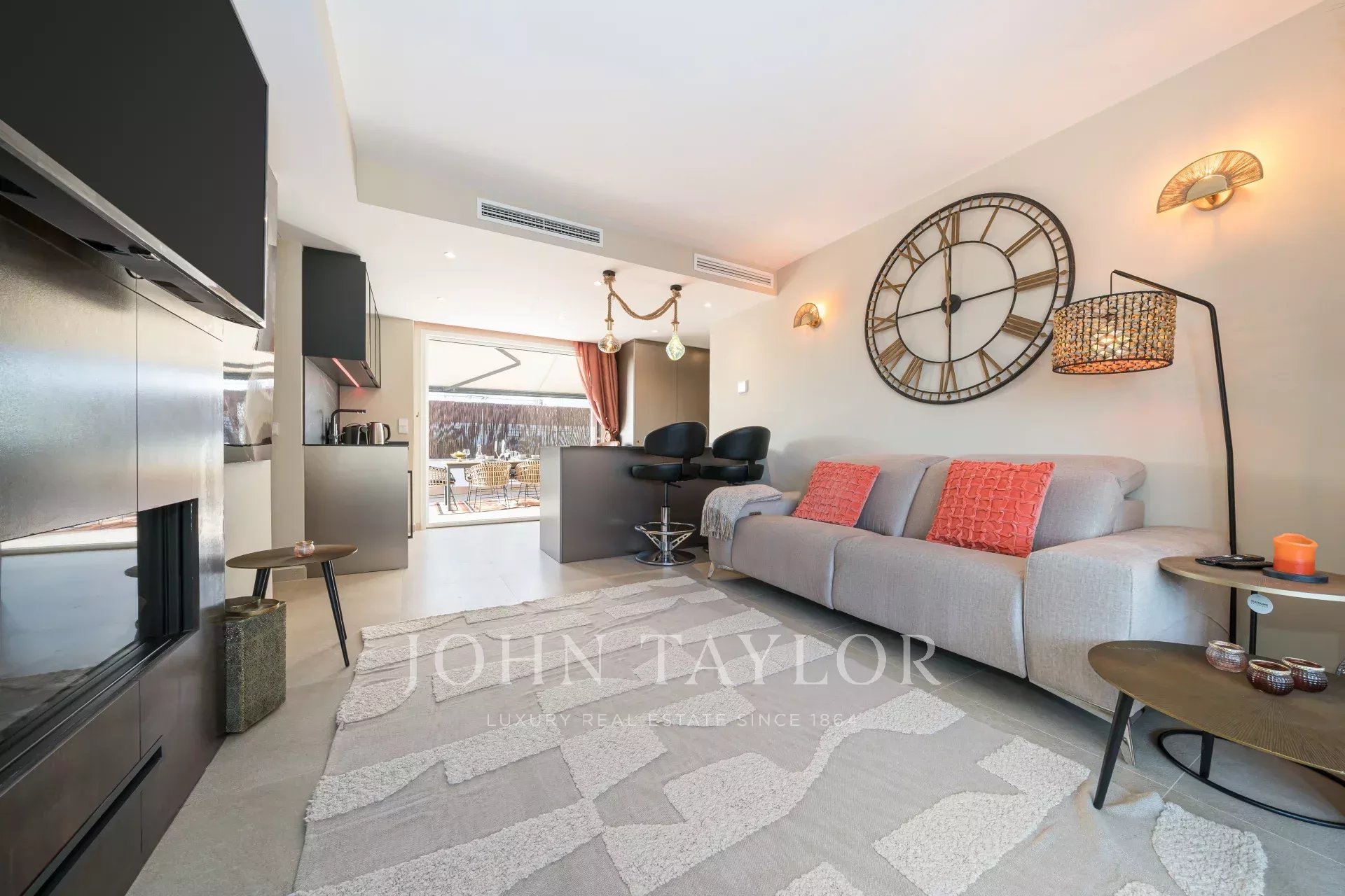 Auf 150 Quadratmetern bietet dieses Penthouse 75 Quadratmeter stilvollen Innenraum, darunter eine offene Küche, einen Ess- und Wohnbereich, der sich um einen doppelseitigen Gaskamin gruppiert. Die Wohnung bietet zwei gut ausgestattete Schlafzimmer und ein luxuriöses Badezimmer, das mit hochwertigen Oberflächen ausgestattet ist.