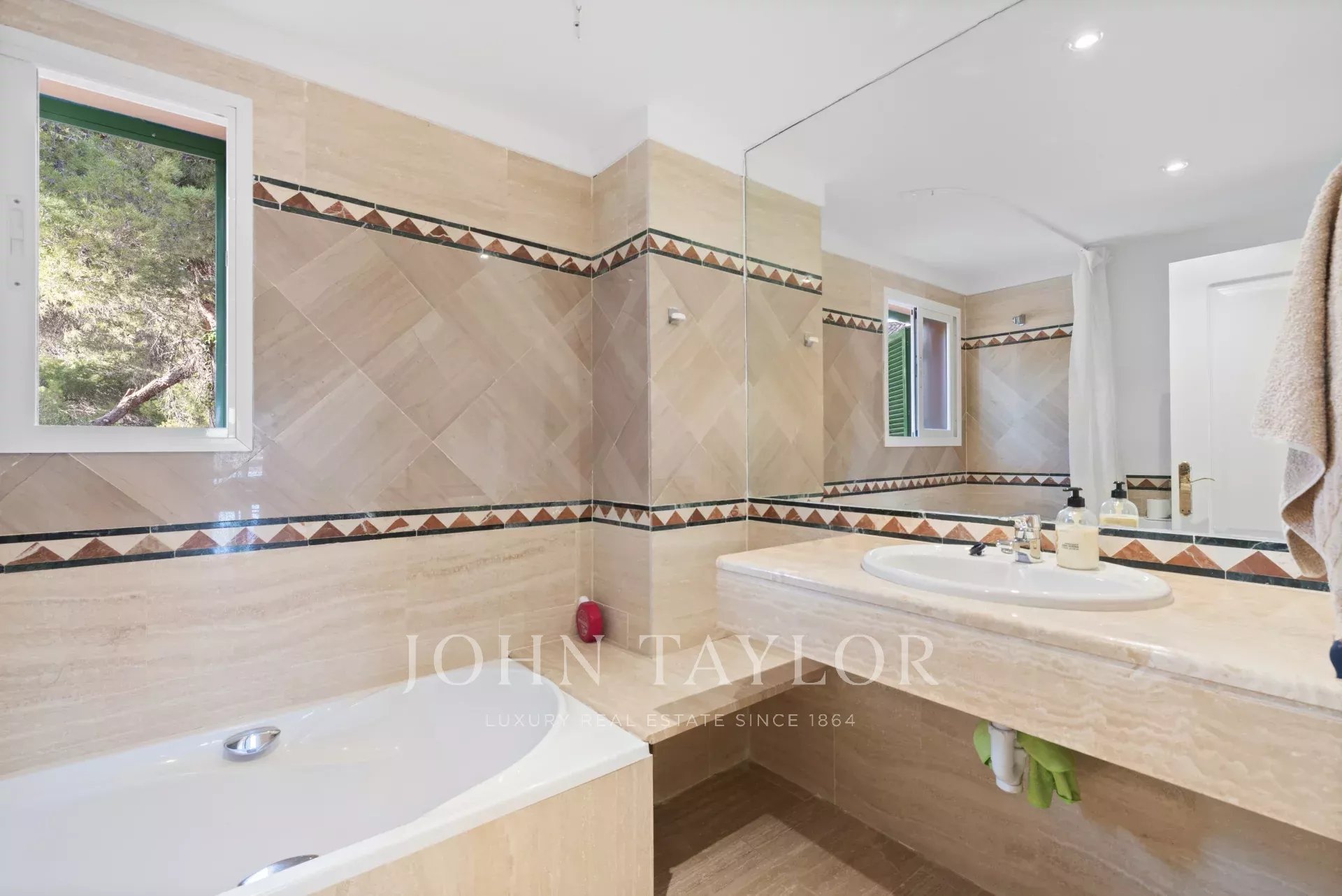Im Inneren ist ein helles Wohn-Esszimmer mit einer separaten modernen Küche integriert, die eine gemütliche Atmosphäre für das tägliche Leben und für besondere Momente schafft. Das Haus verfügt über 2 Schlafzimmer mit eigenem Bad, die Komfort und Privatsphäre für die ganze Familie oder Gäste bieten. Zur Ausstattung gehören eine Klimaanlage warm/kalt und eine gepflegte Wohnanlage mit drei Swimmingpools und direktem Zugang zum Meer. Die Immobilie ist attraktiv für diejenigen, die einen Raum in einer außergewöhnlichen Enklave modernisieren möchten. Eine Residenz, die Ruhe und Nähe zu allen Annehmlichkeiten vereint: Strände, Golfplätze, Restaurants und Luxusboutiquen. Ein Parkplatz. Ein Ort, an dem das Mittelmeer Ihr nächster Nachbar wird.