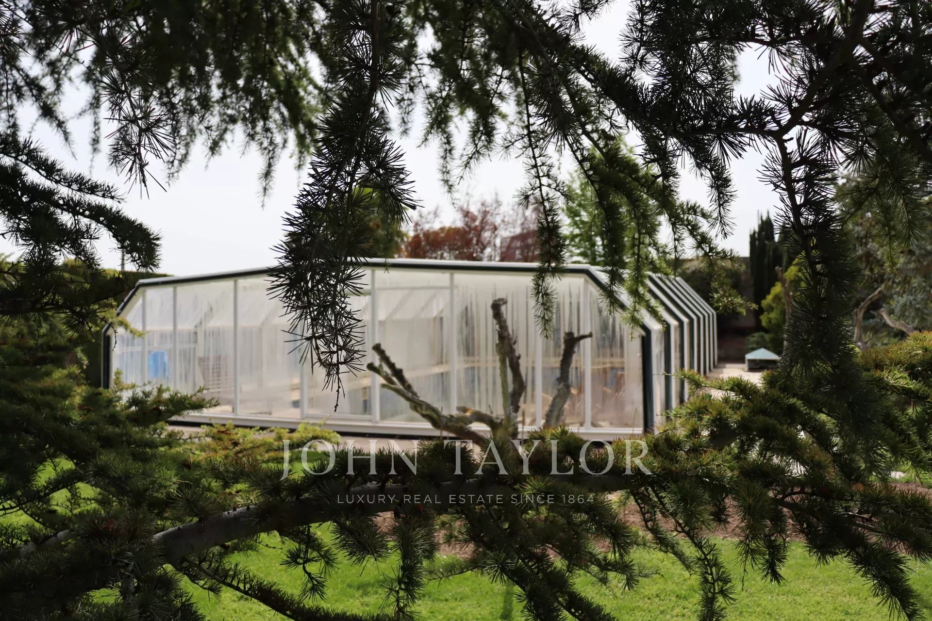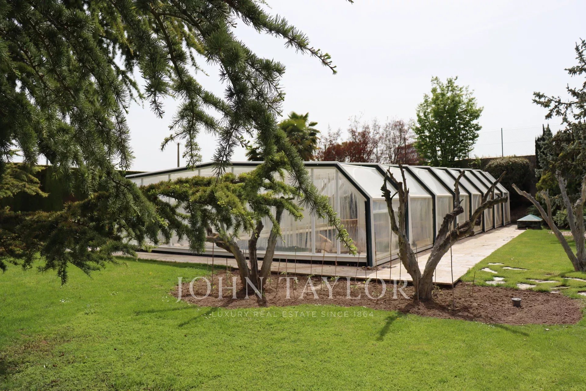 Überdachte Garage für zwei Fahrzeuge (Erweiterungsmöglichkeit), überdachtes Außenschwimmbad und Paddle-Tennisplatz.