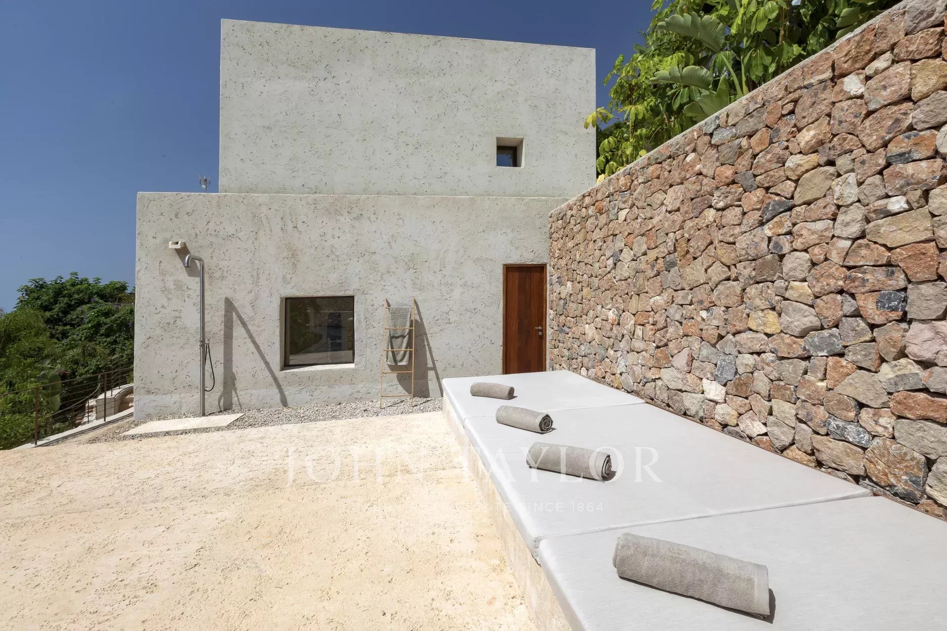 Auf der Terrasse am Fuße des Wohnzimmers gibt es einen Grillplatz, Sitzgelegenheiten zum Entspannen und große Liegen zum Sonnenbaden.