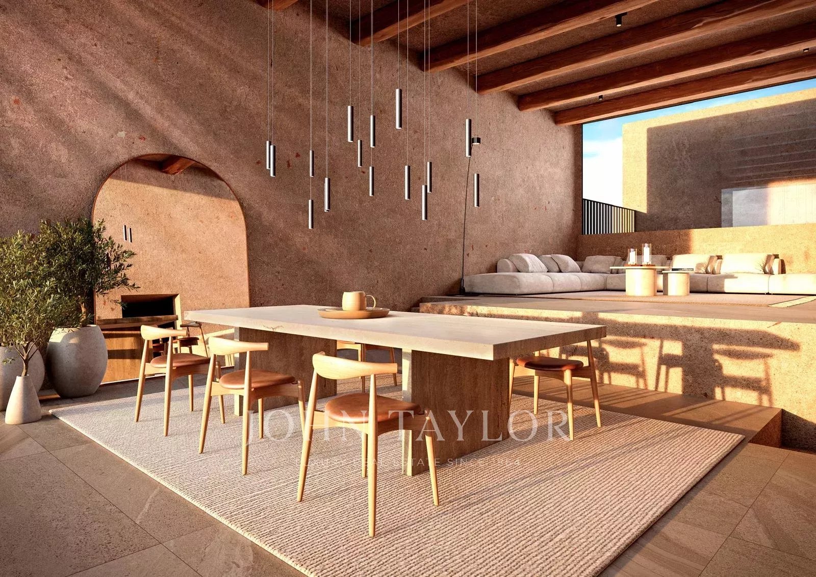 Das Projekt basiert auf zwei architektonischen Konzepten: Atrium-Häuser und Patio-Häuser. Die oberen Villen, auf terrassiertem Gelände gelegen, nutzen die Höhe optimal, um panoramische Ausblicke auf das Meer und Dalt Vila zu bieten und die Verbindung mit dem Horizont zu betonen. Die unteren Villen legen Wert auf Privatsphäre und Intimität und öffnen sich zu ruhigen Innenhöfen, in denen ein japanischer Ahorn den Wechsel der Jahreszeiten mit seinen Farben markiert.
