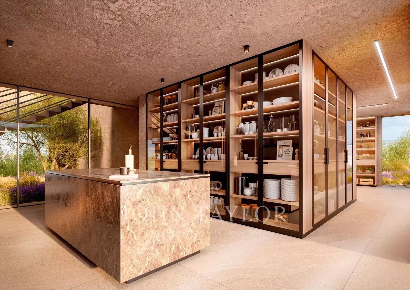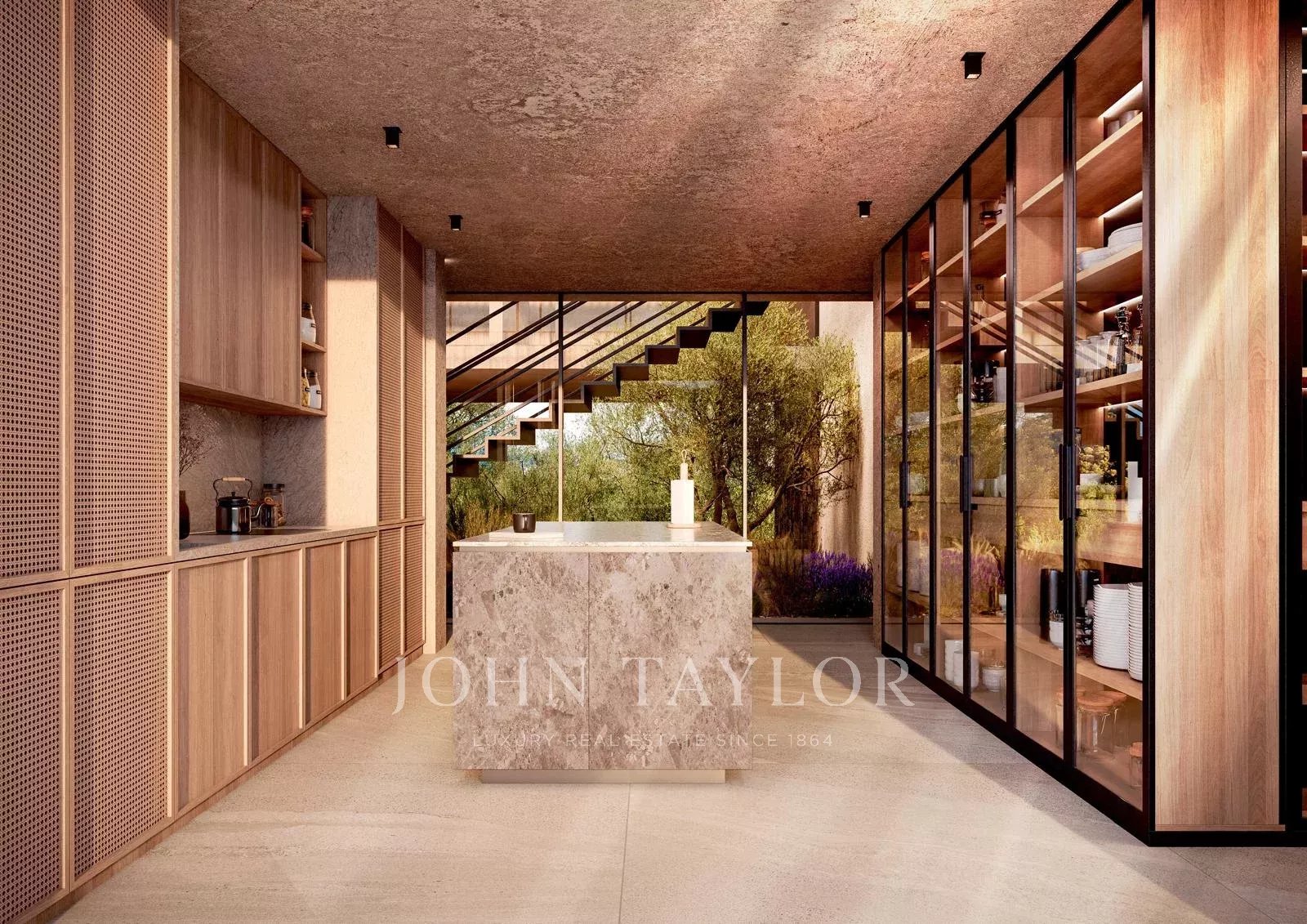 Umgeben von Olivenbäumen, Lavendel, Rosmarin und weiteren mediterranen Kräutern ist diese Villa als Rückzugsort der Ruhe konzipiert, perfekt in die Landschaft integriert und vermittelt die zeitlose Schönheit und den entspannten Lebensstil Ibizas.