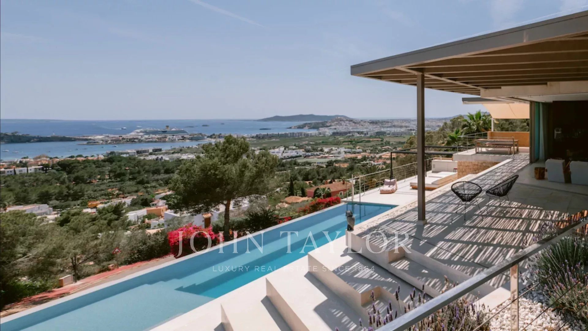 Mit Natursteinmauern und warmen Holzelementen strahlt die Villa eine einladende und zugleich elegante Atmosphäre aus. Beeindruckende Panoramablicke auf das azurblaue Mittelmeer, die historische Altstadt Dalt Vila und die idyllische Insel Formentera sind von fast jedem Winkel des Hauses aus zu genießen.