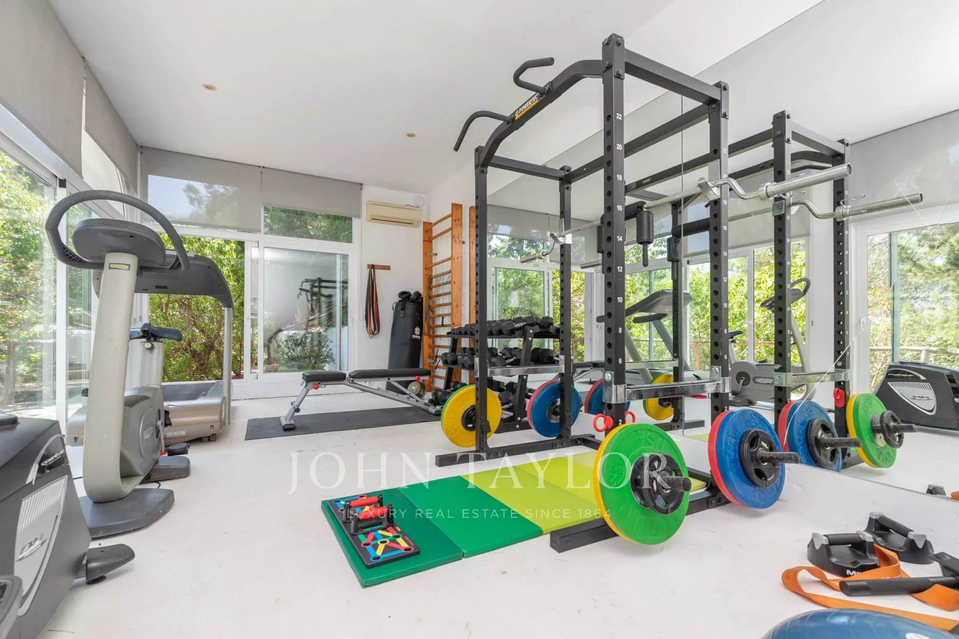 Die Immobilie umfasst auch eine große Garage von 162 m² mit Platz für bis zu sechs Fahrzeuge sowie ein hochmodernes Fitnessstudio mit Meerblick und Technogym-Ausstattung. Weitere Annehmlichkeiten sind Klimaanlage, Elektroheizung, Highspeed-Internet, IPTV, ein SONOS-Soundsystem, ein Waschraum und eine Außenbeleuchtung mit über 350 Lampen.