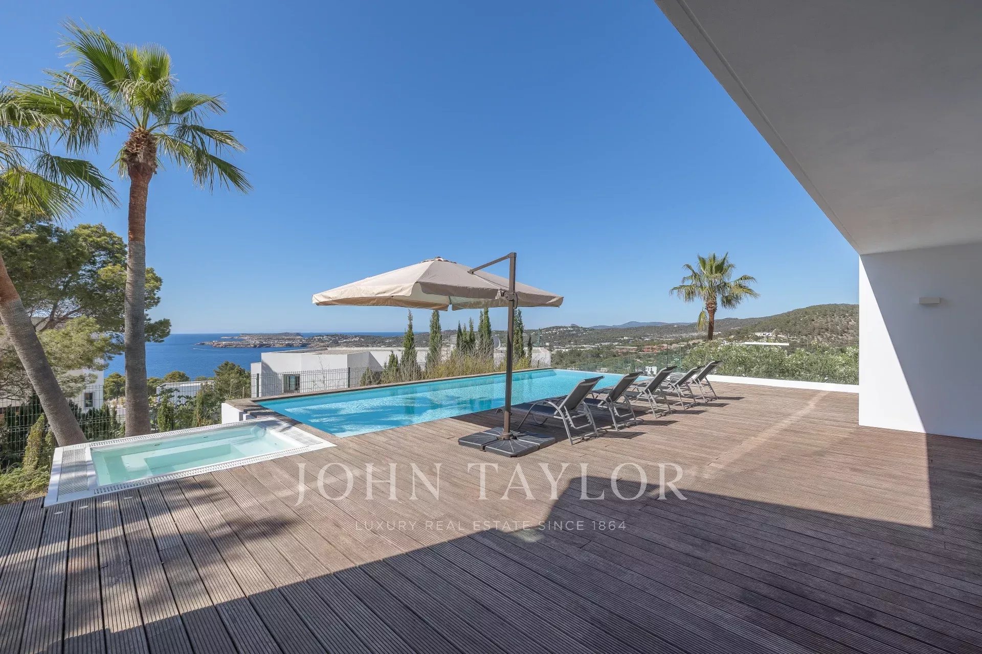 Diese luxuriöse Residenz besteht aus vier Schlafzimmern, jedes mit eigenem Bad, einer geräumigen Küche, weitläufigen Terrassen und einem außergewöhnlich großzügigen Außenbereich. Das Highlight des Anwesens ist die beeindruckende Dachterrasse, die mit einem Whirlpool ausgestattet ist und einen idealen Ort zum Entspannen bietet.