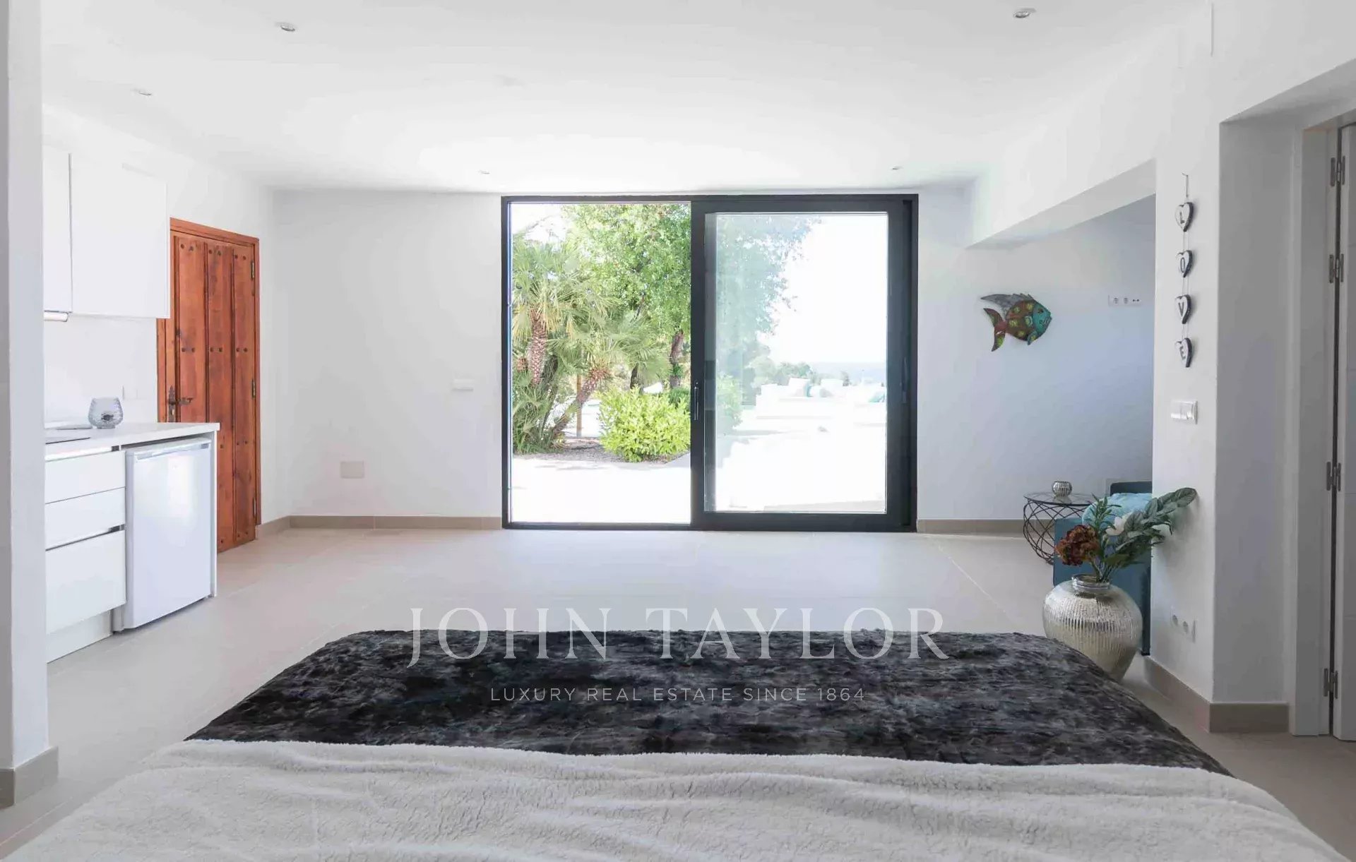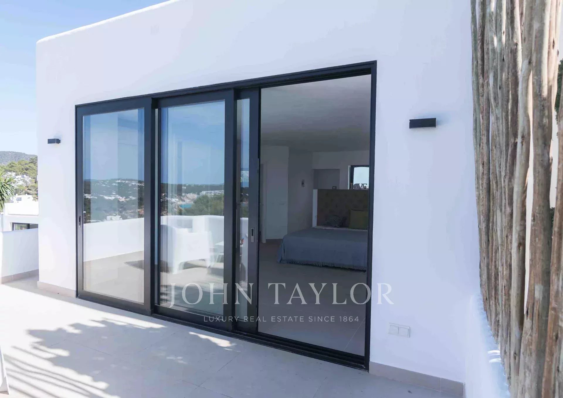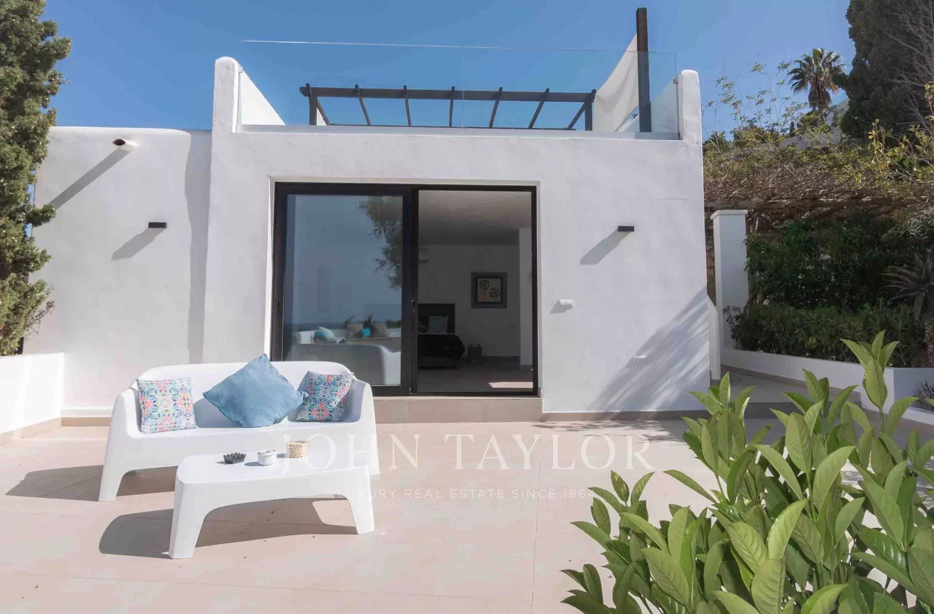Der Außenbereich umfasst mehrere Terrassen mit insgesamt 640 m² gefliester Fläche. Die zentrale Gruppe jahrhundertealter Bäume umschließt eine Außendusche mit Warmwasser und vermittelt ein Gefühl von Freiheit. Vom erhöhten Infinity-Pool genießt man spektakuläre Ausblicke auf Cala Tarida, umgeben von einladenden Außenbereichen zum Sonnenbaden und Entspannen.