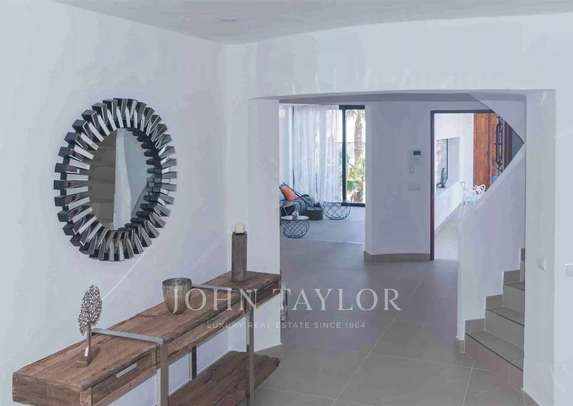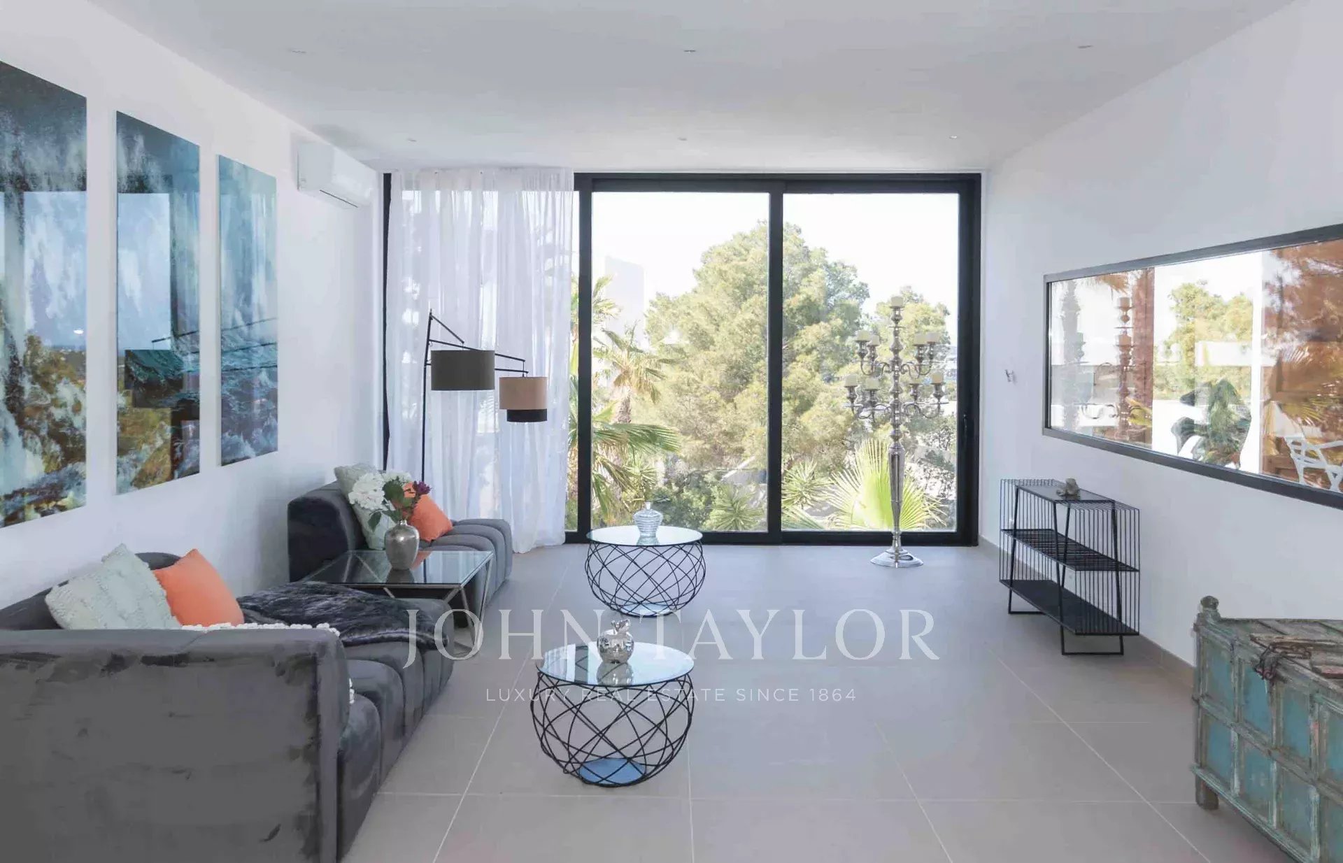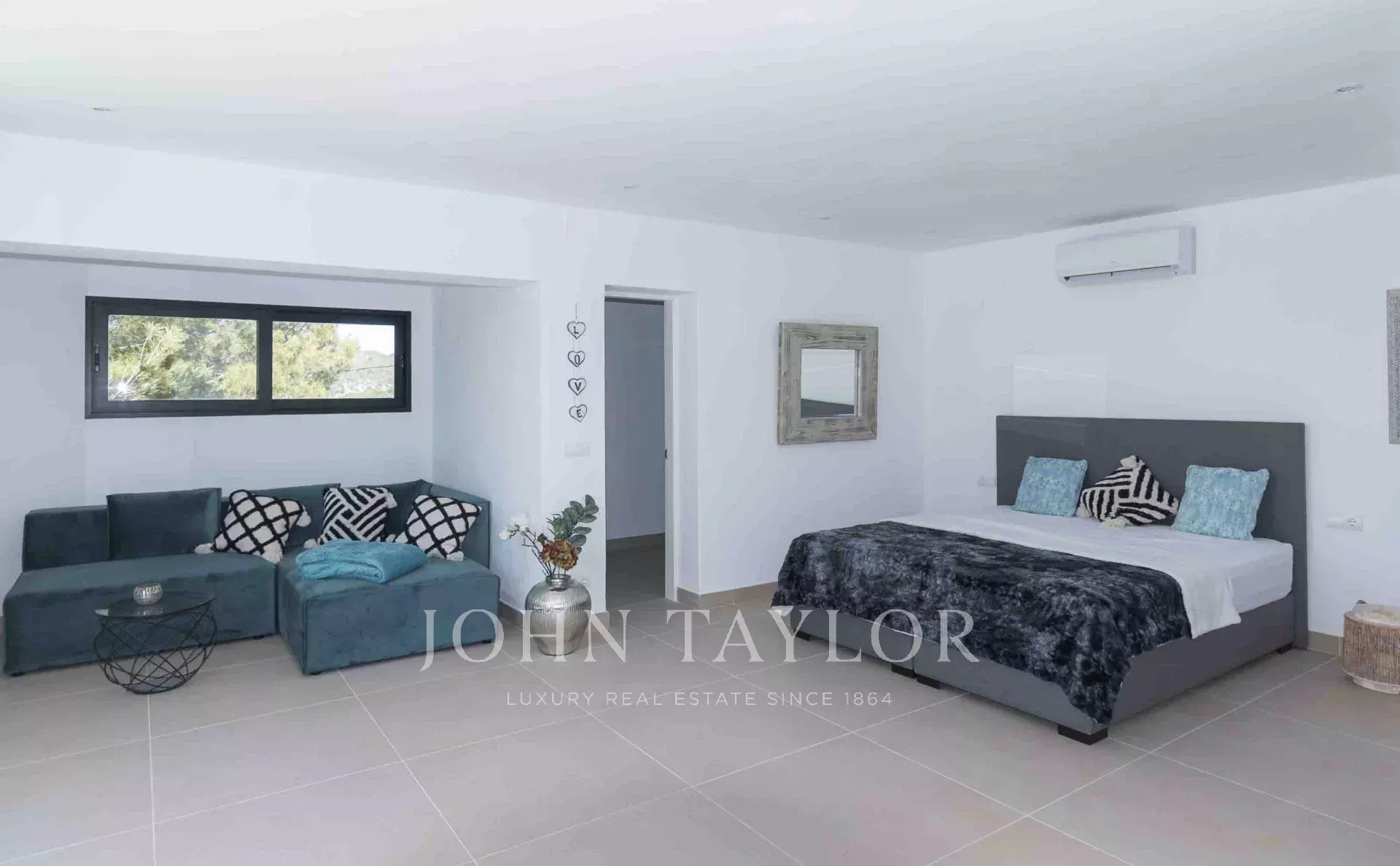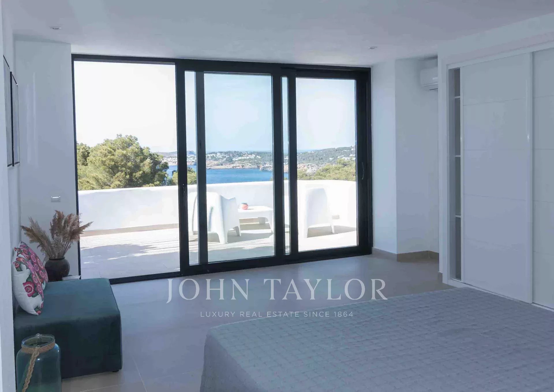 Der Außenbereich umfasst mehrere Terrassen mit insgesamt 640 m² gefliester Fläche. Die zentrale Gruppe jahrhundertealter Bäume umschließt eine Außendusche mit Warmwasser und vermittelt ein Gefühl von Freiheit. Vom erhöhten Infinity-Pool genießt man spektakuläre Ausblicke auf Cala Tarida, umgeben von einladenden Außenbereichen zum Sonnenbaden und Entspannen.