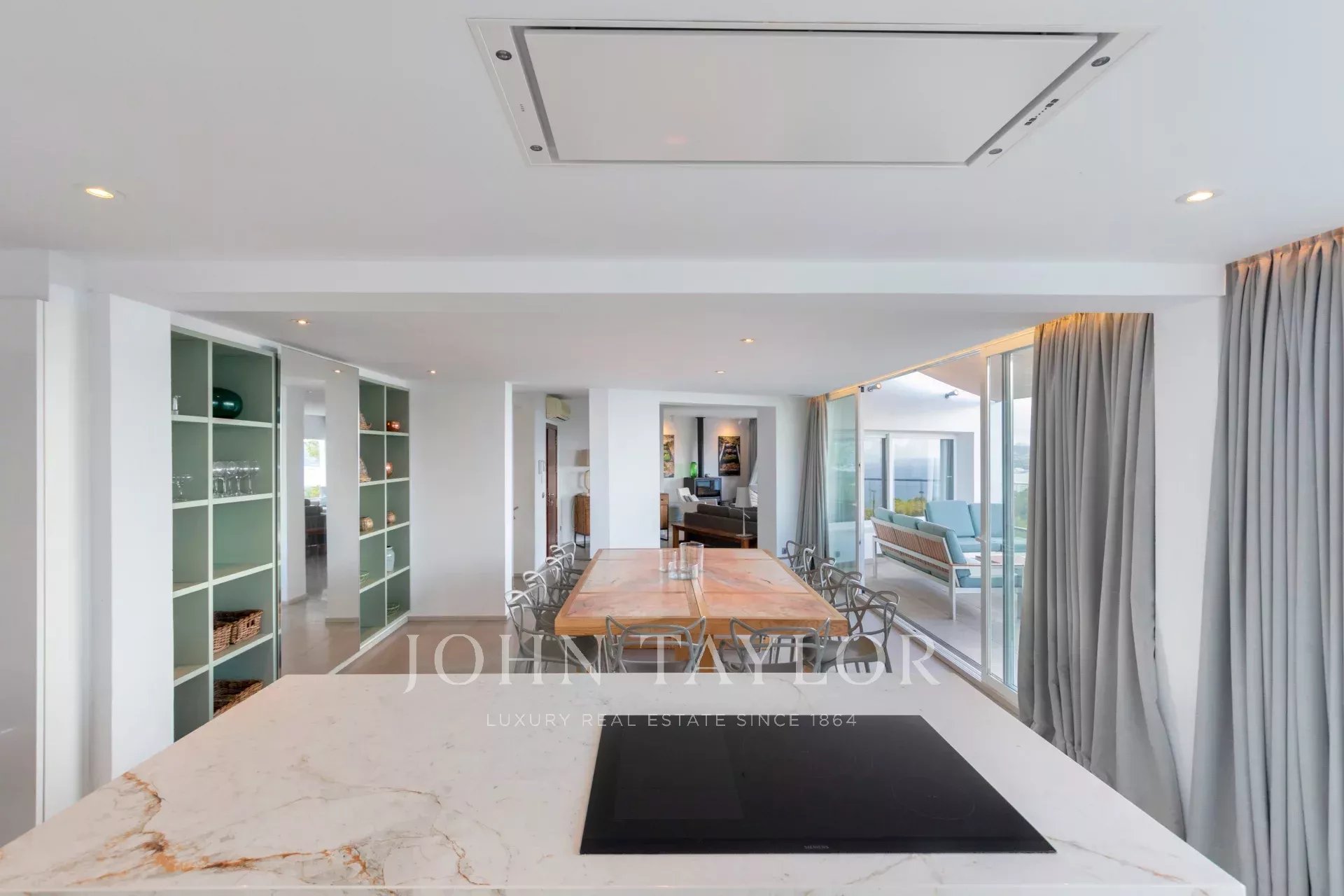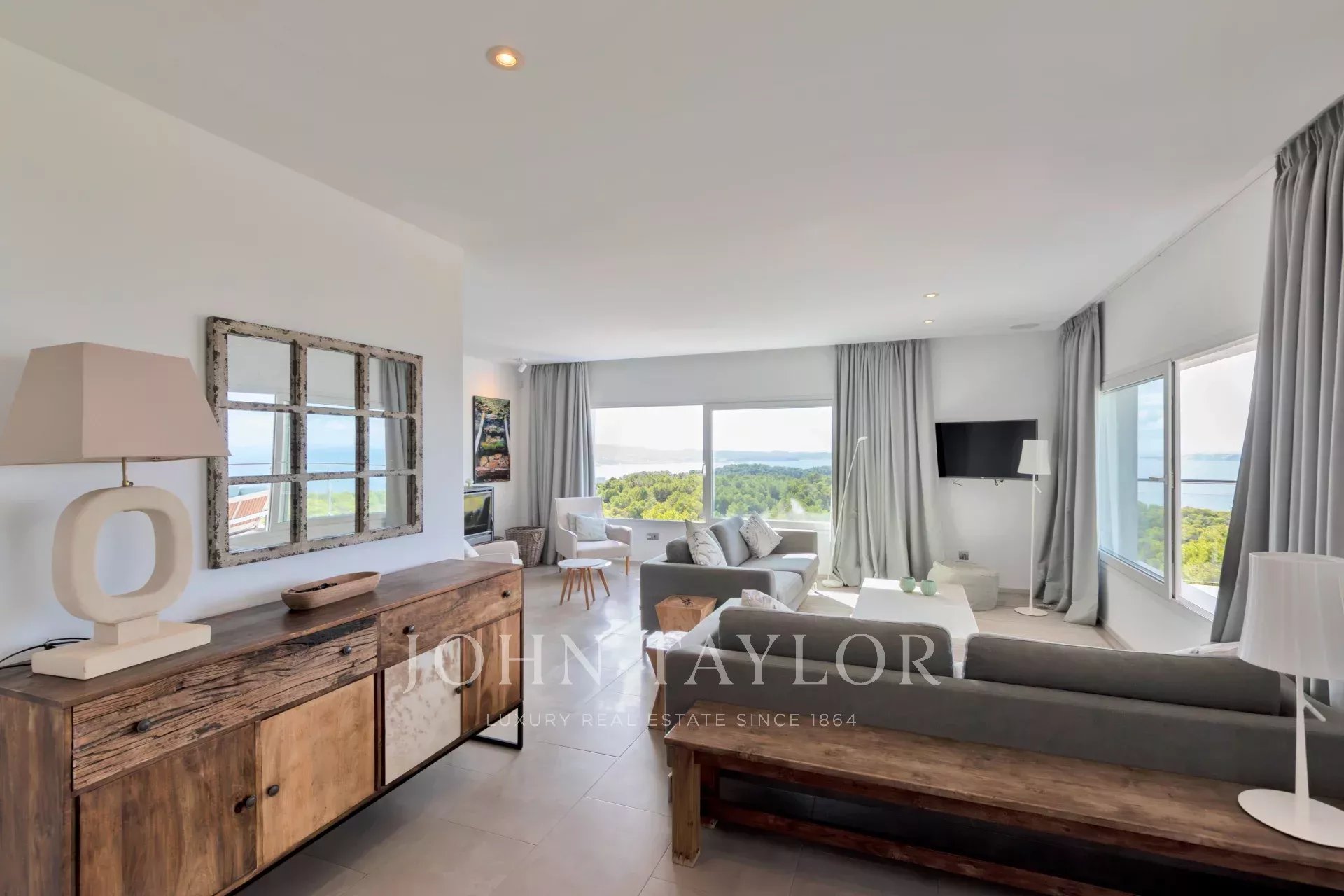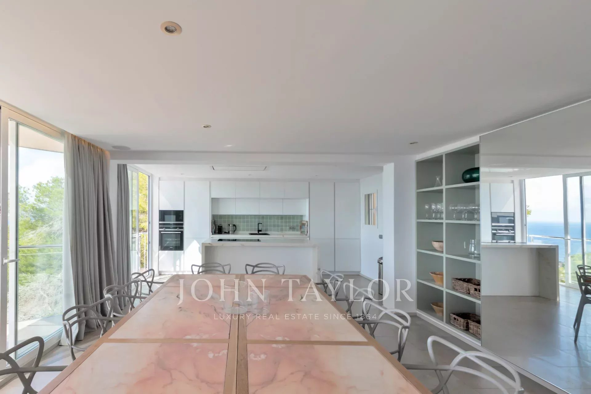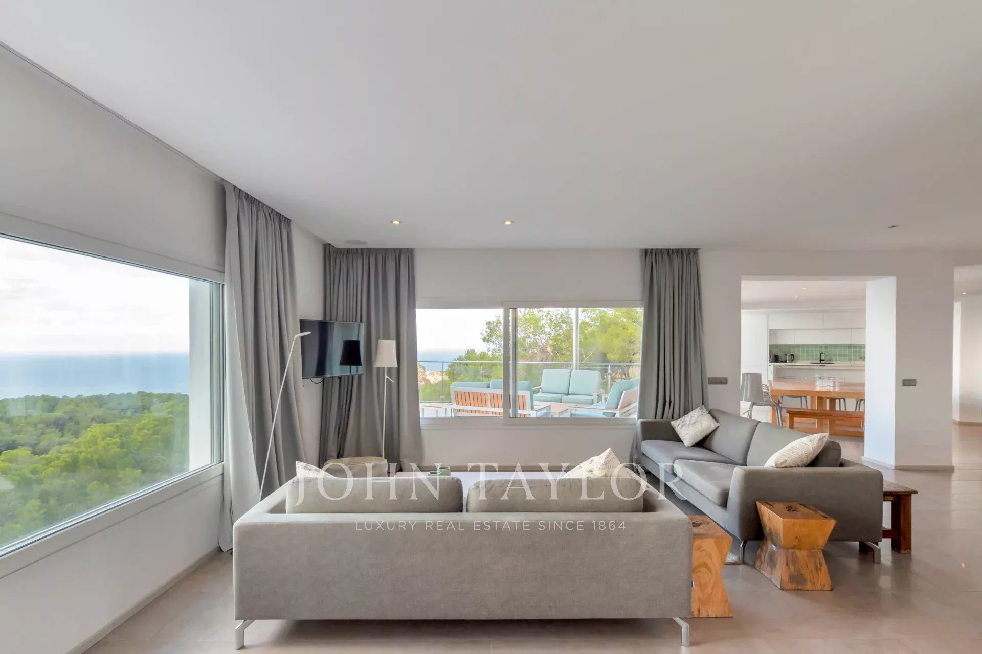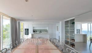 Diese moderne Villa, die auf einem Hügel thront, beeindruckt mit ihrem spektakulären Blick auf das Mittelmeer, der von fast jedem Zimmer aus sichtbar ist. Beim Betreten der Villa wird man von einem lichtdurchfluteten, offenen Wohnbereich empfangen, der sich nahtlos in eine moderne Küche einfügt. Große Fenster rahmen die atemberaubende Naturkulisse und schaffen eine direkte Verbindung zur Umgebung.