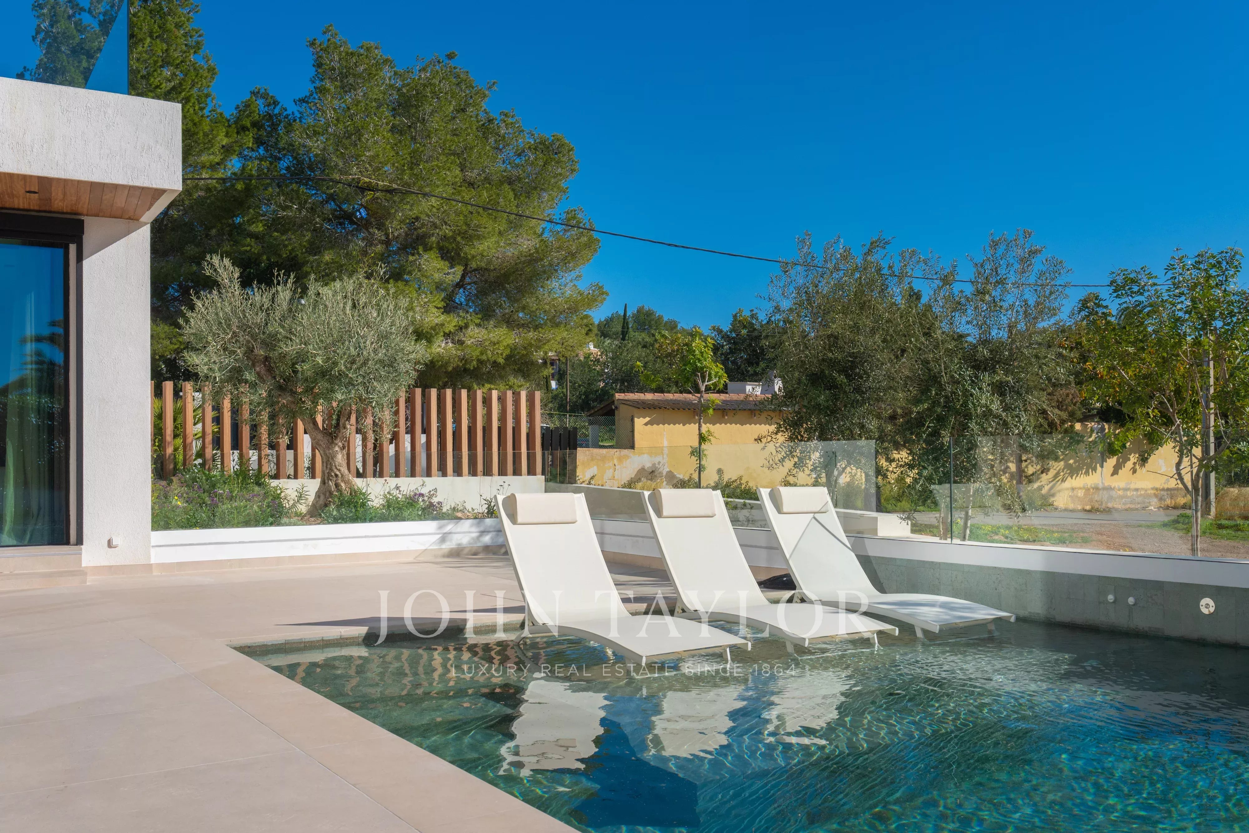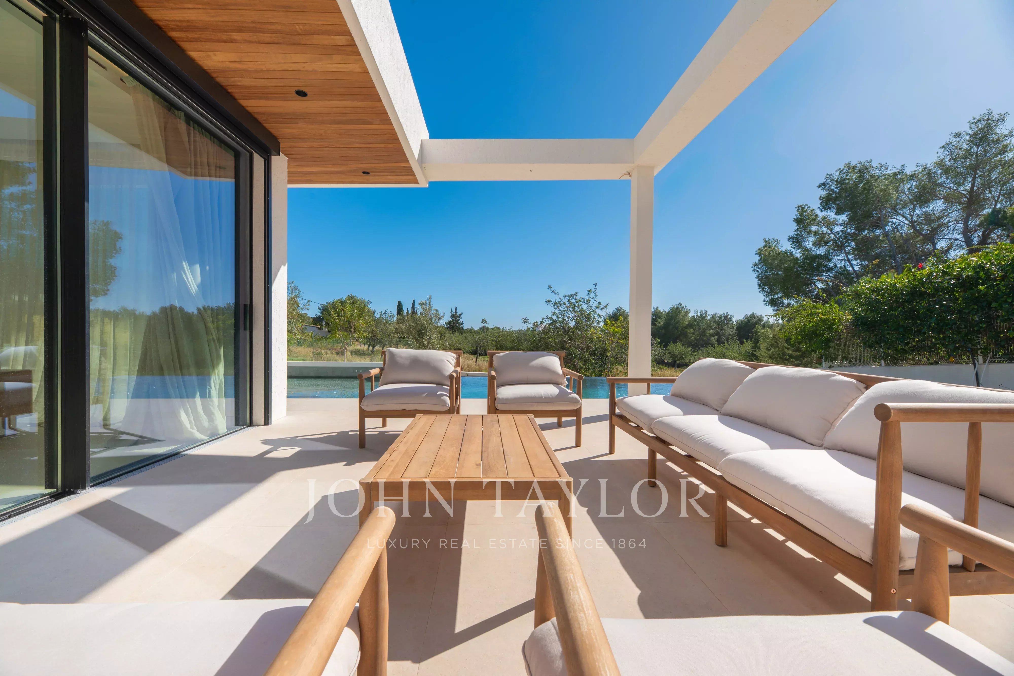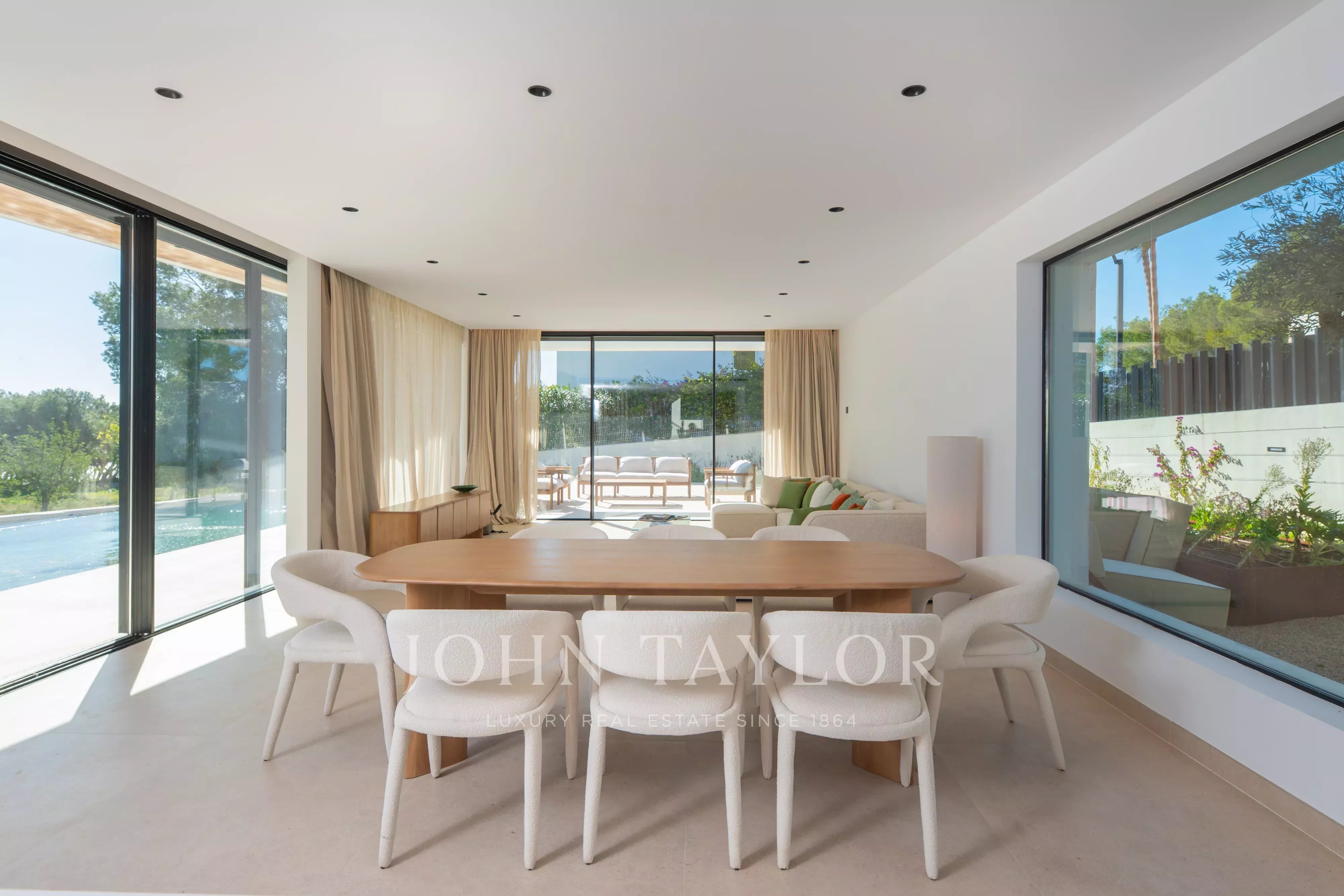 Große Fensterfronten führen direkt in den Außenbereich mit einer angenehmen überdachten Terrasse, perfekt für Mahlzeiten im Freien, sowie einem attraktiven privaten Poolbereich, um das ibizenkische Klima ganzjährig zu genießen.