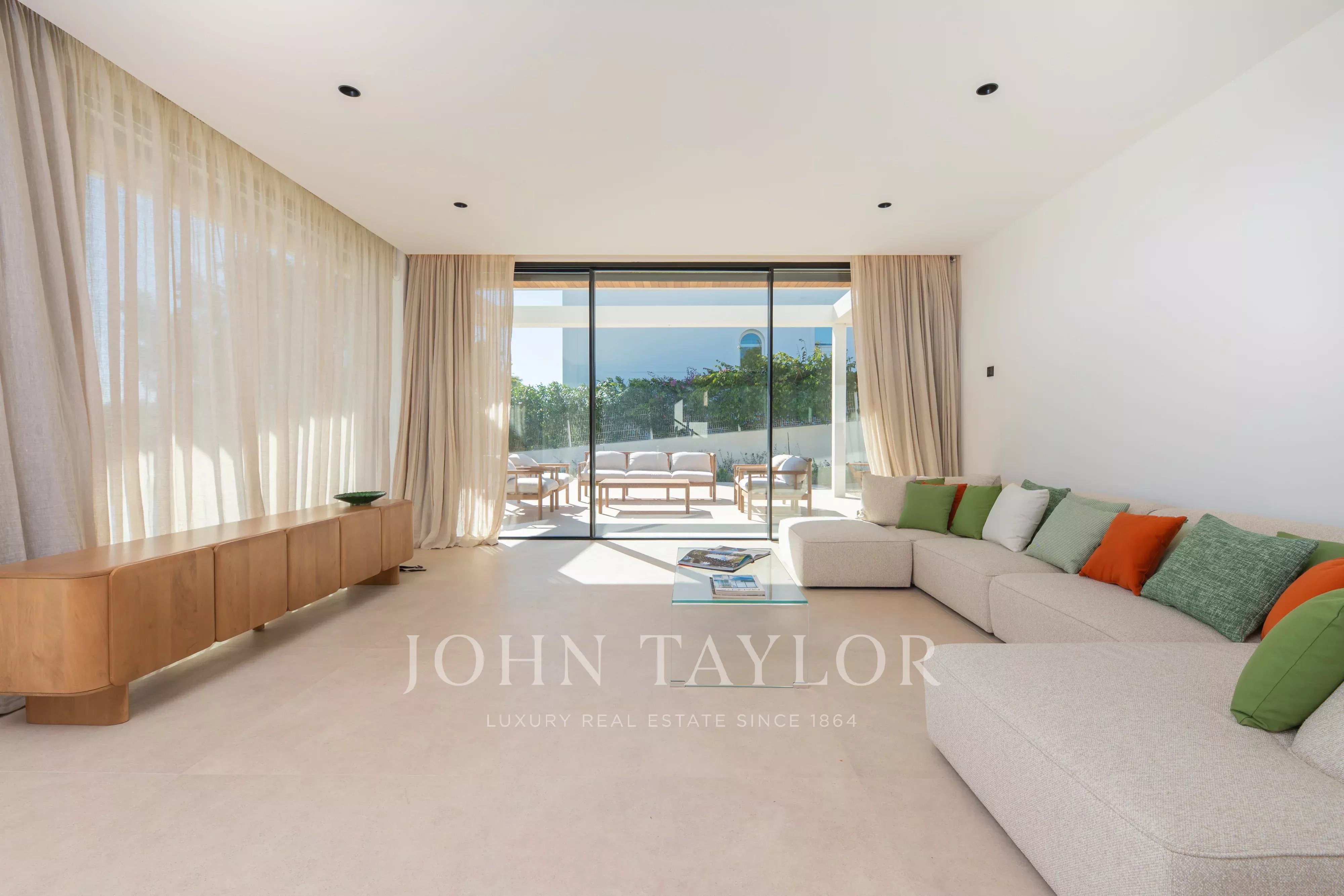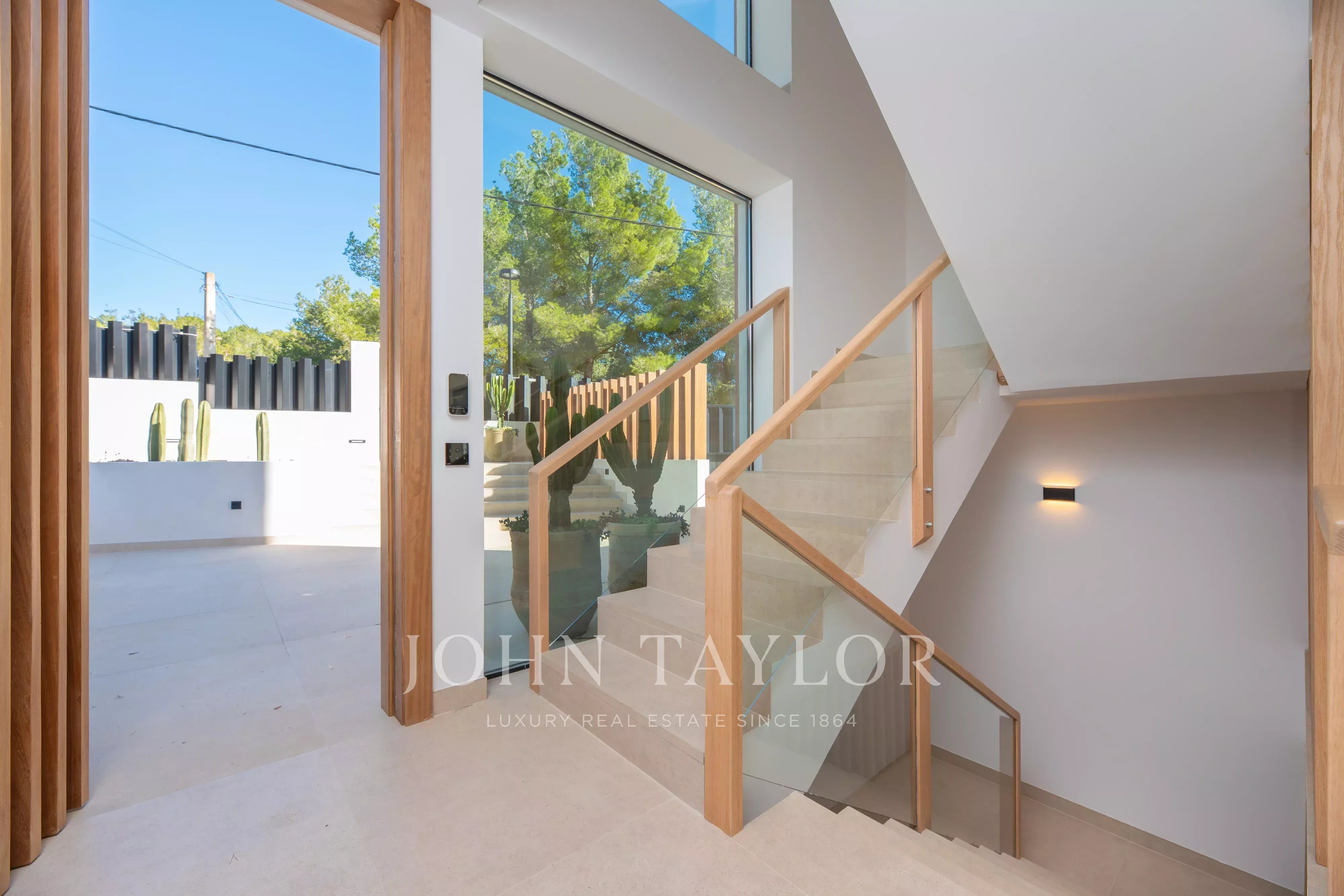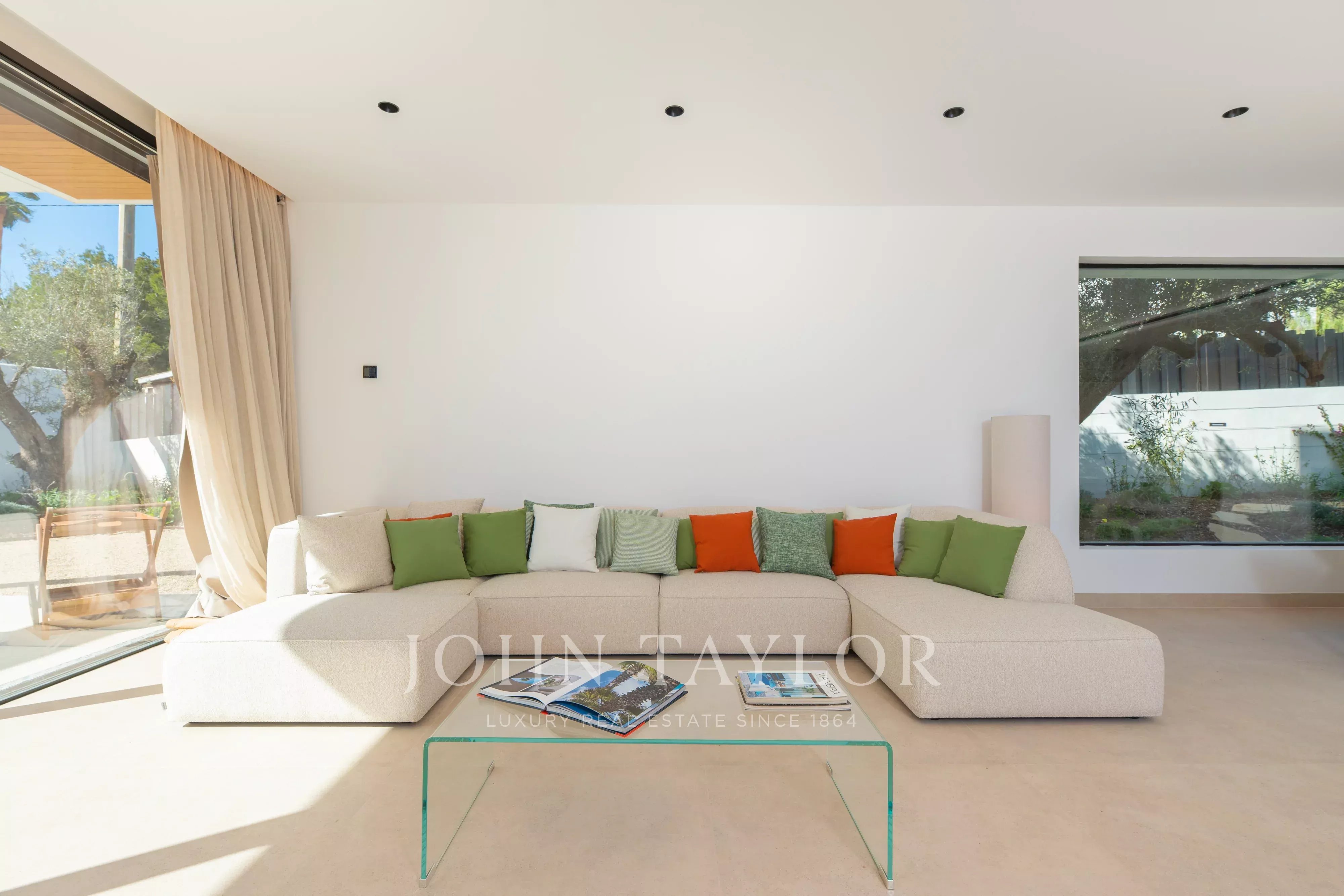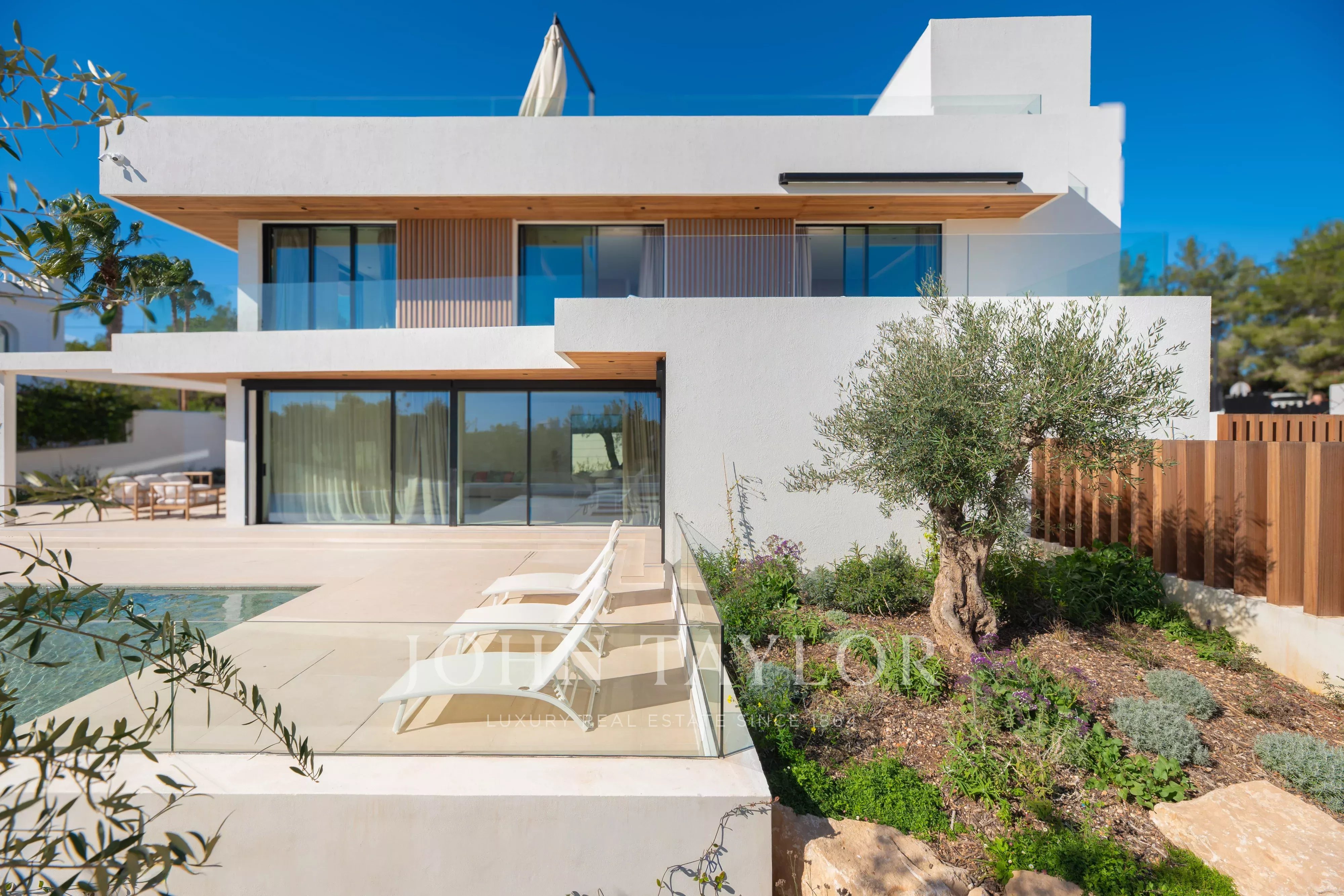 Große Fensterfronten führen direkt in den Außenbereich mit einer angenehmen überdachten Terrasse, perfekt für Mahlzeiten im Freien, sowie einem attraktiven privaten Poolbereich, um das ibizenkische Klima ganzjährig zu genießen.