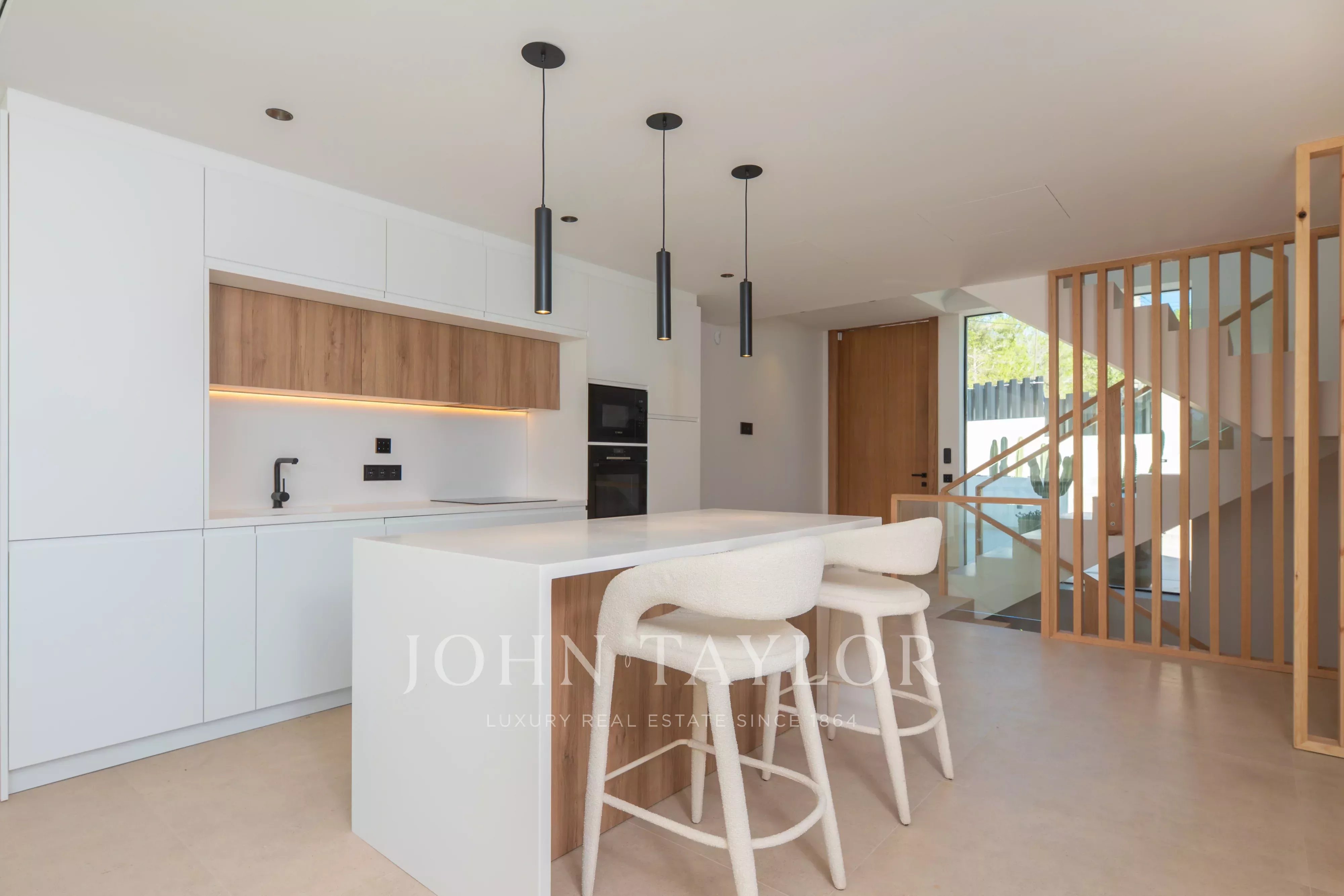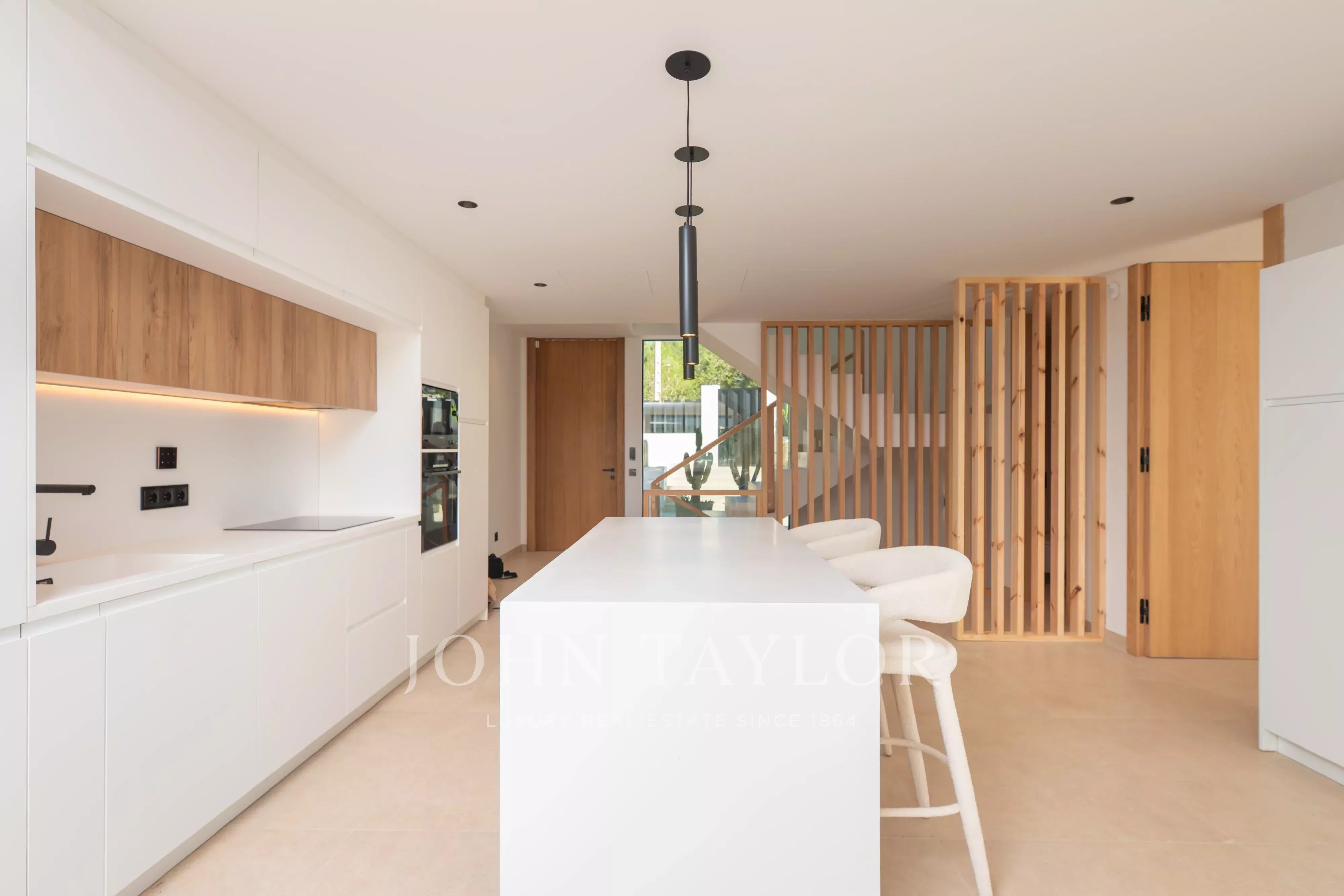 Im Erdgeschoss bietet der Innenbereich einen hellen offenen Wohn-, Ess- und Küchenbereich, der ein modernes und funktionales Raumkonzept schafft. Auf dieser Ebene befinden sich außerdem ein Gäste-WC sowie ein Schlafzimmer mit Bad en suite, ideal für Gäste oder komfortables Wohnen auf einer Ebene.