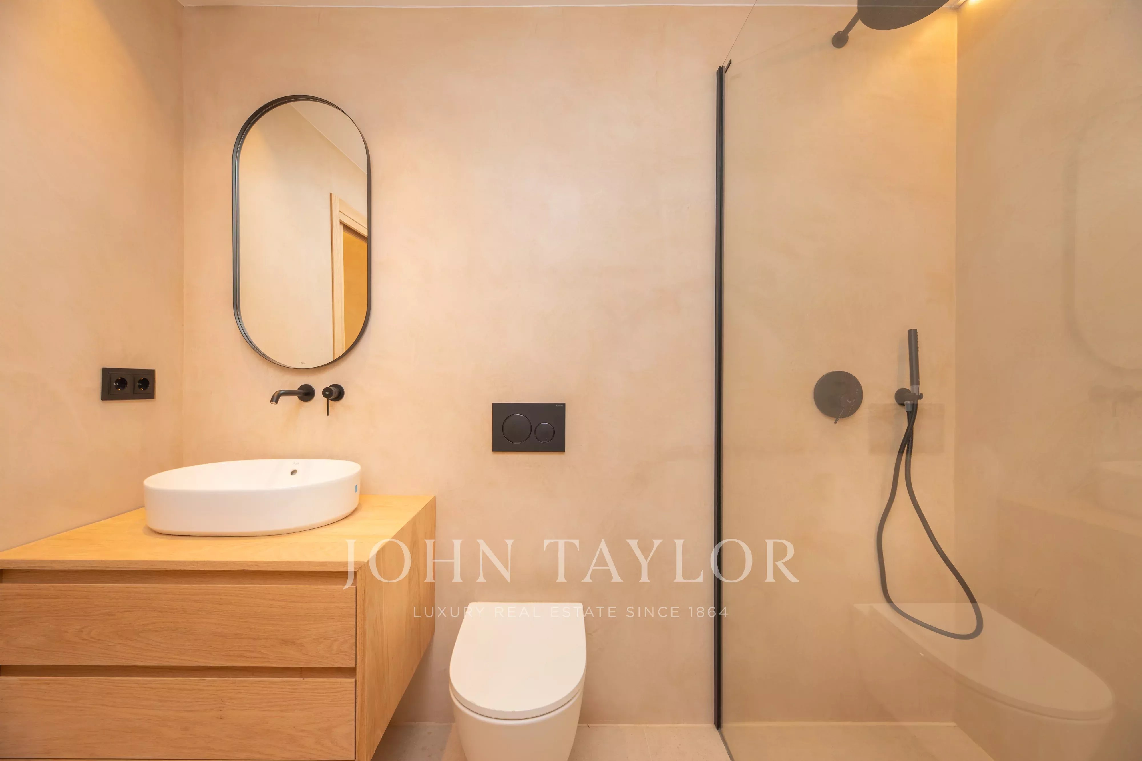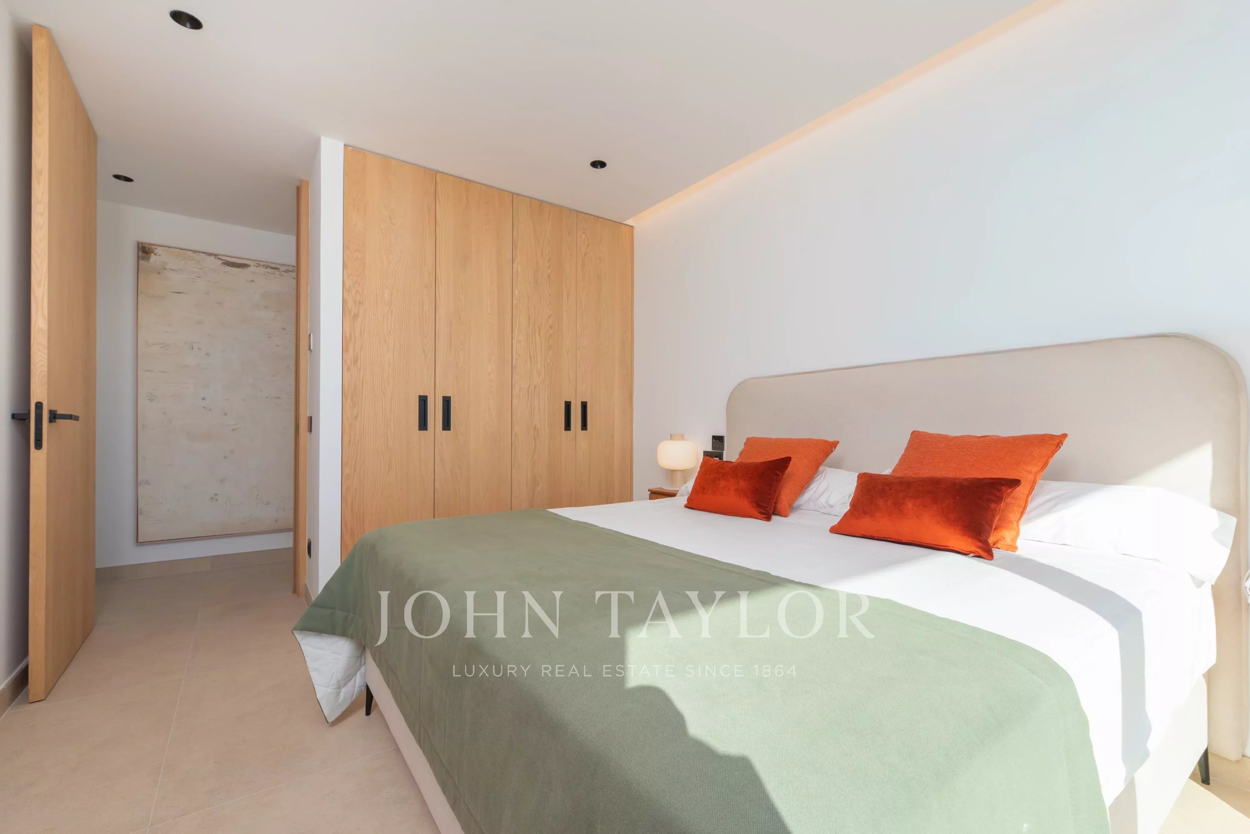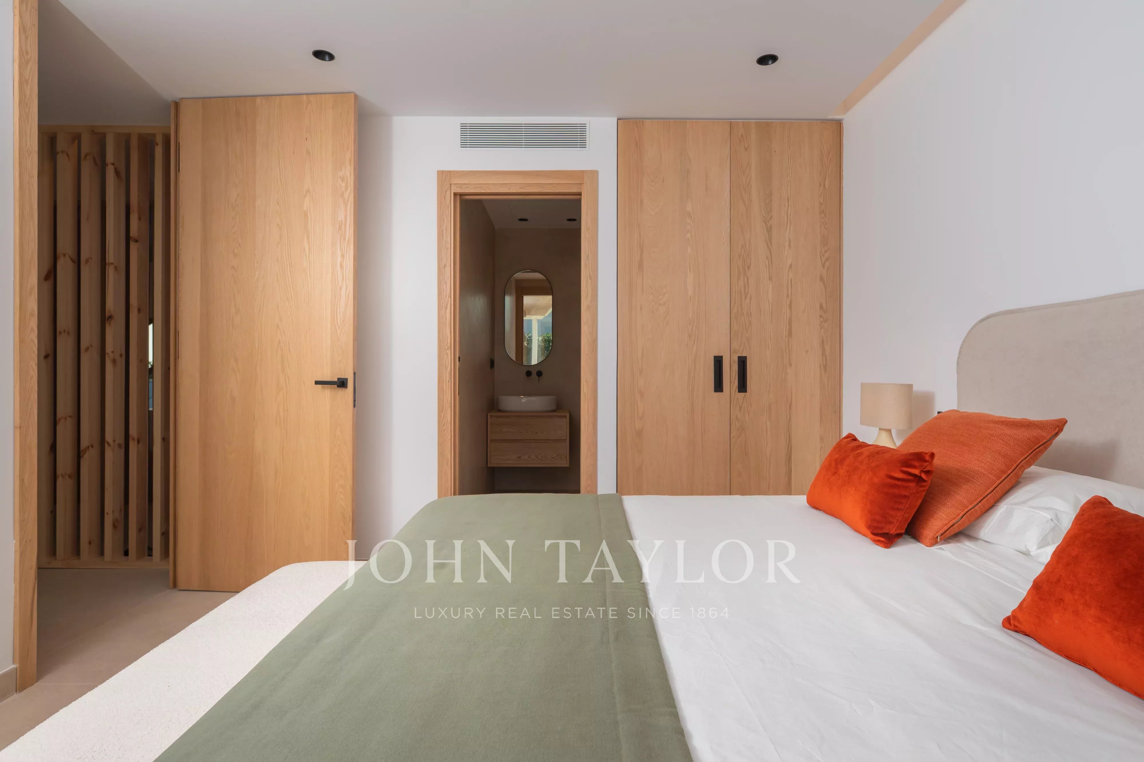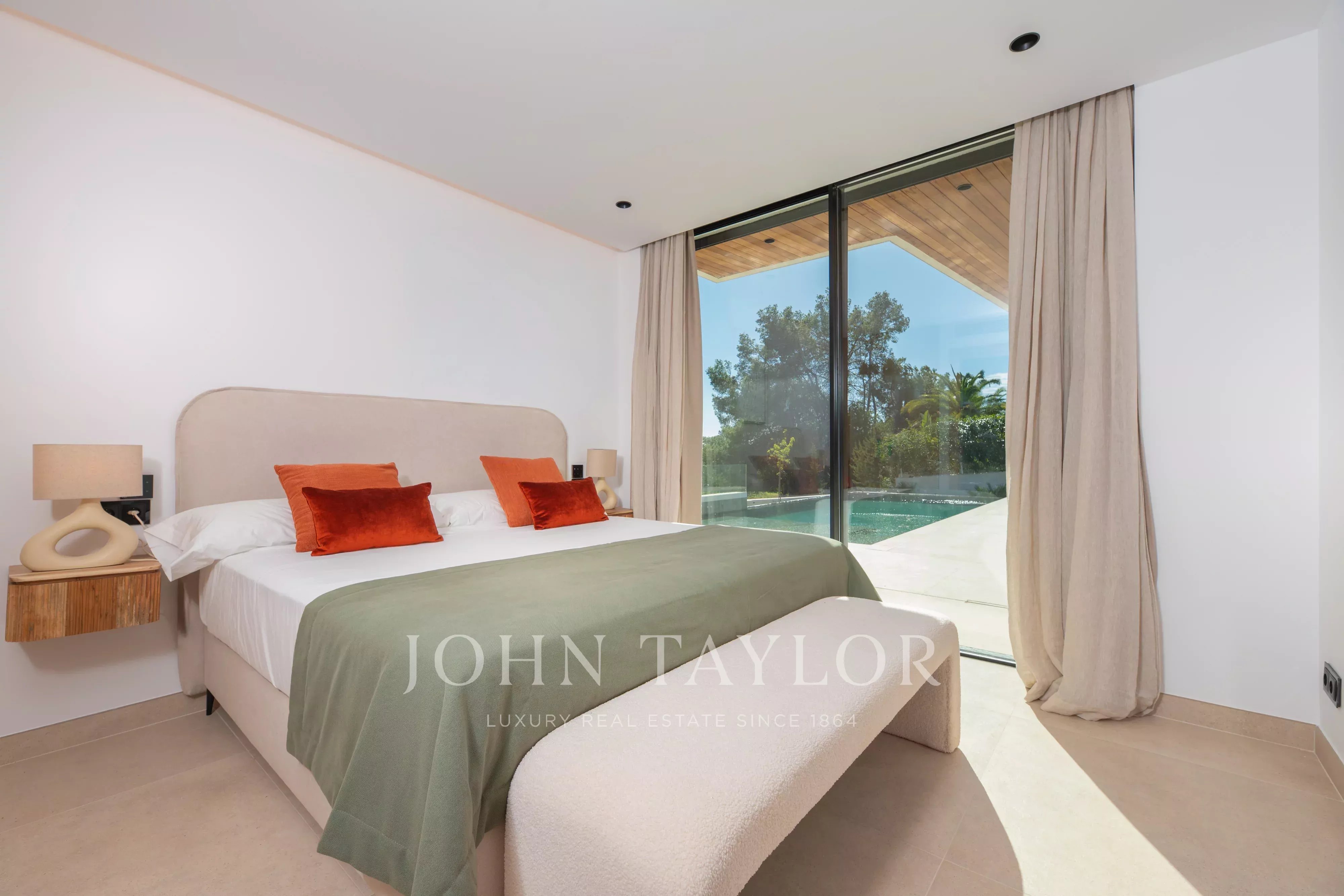 Im Obergeschoss befinden sich drei Schlafzimmer, alle mit Bad en suite, die Privatsphäre und Komfort garantieren. Das Hauptschlafzimmer verfügt zusätzlich über eine Ankleide. Alle drei Schlafzimmer haben direkten Zugang zu einer großzügigen Terrasse mit freiem Blick auf die Landschaft, den Pool und mit leichtem Meerblick.