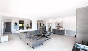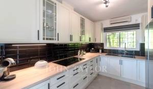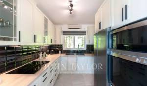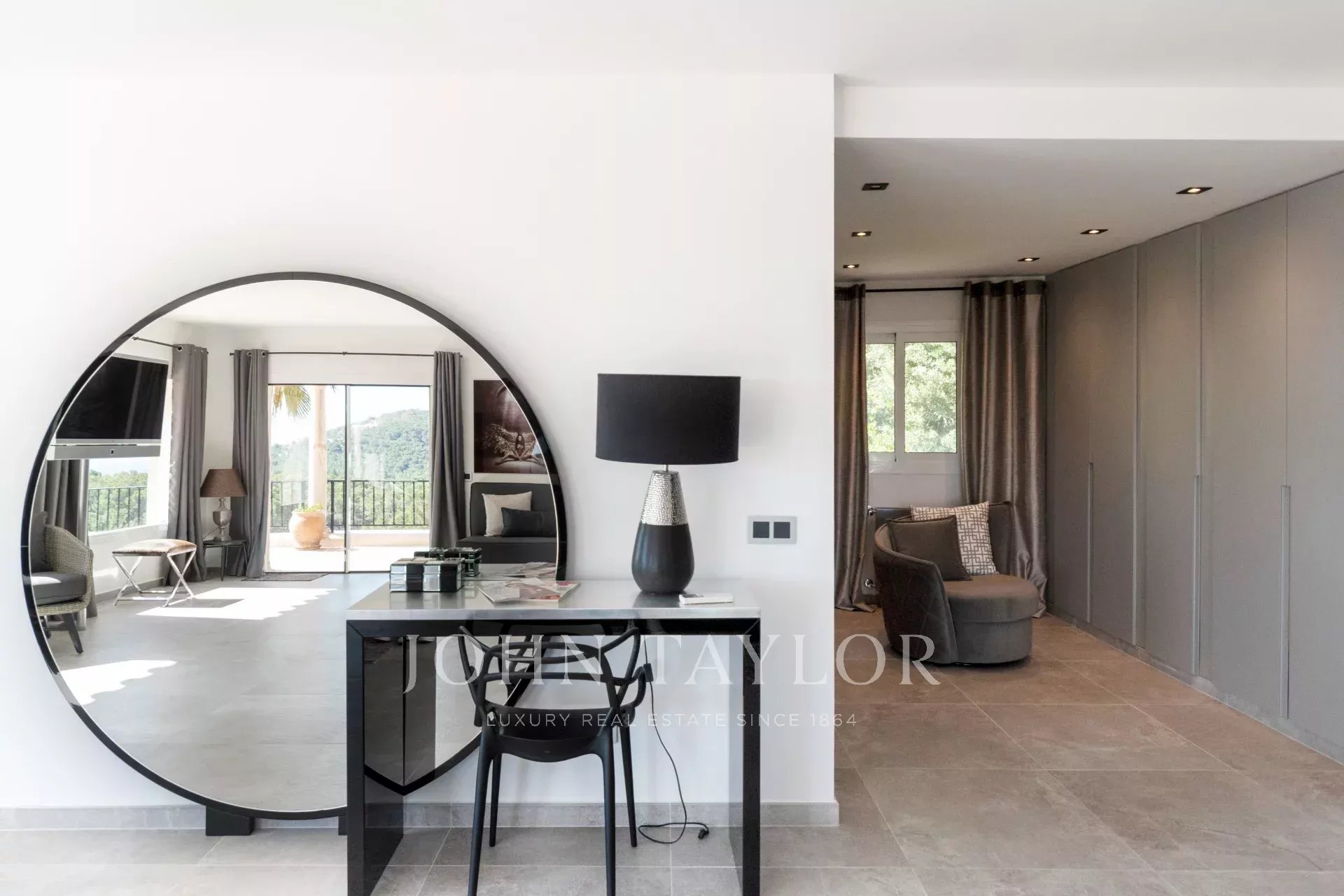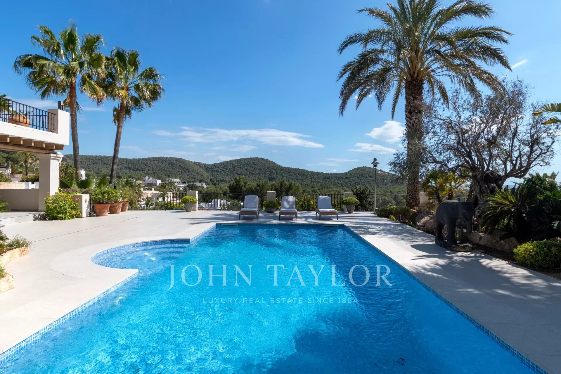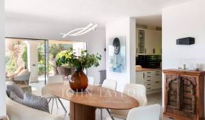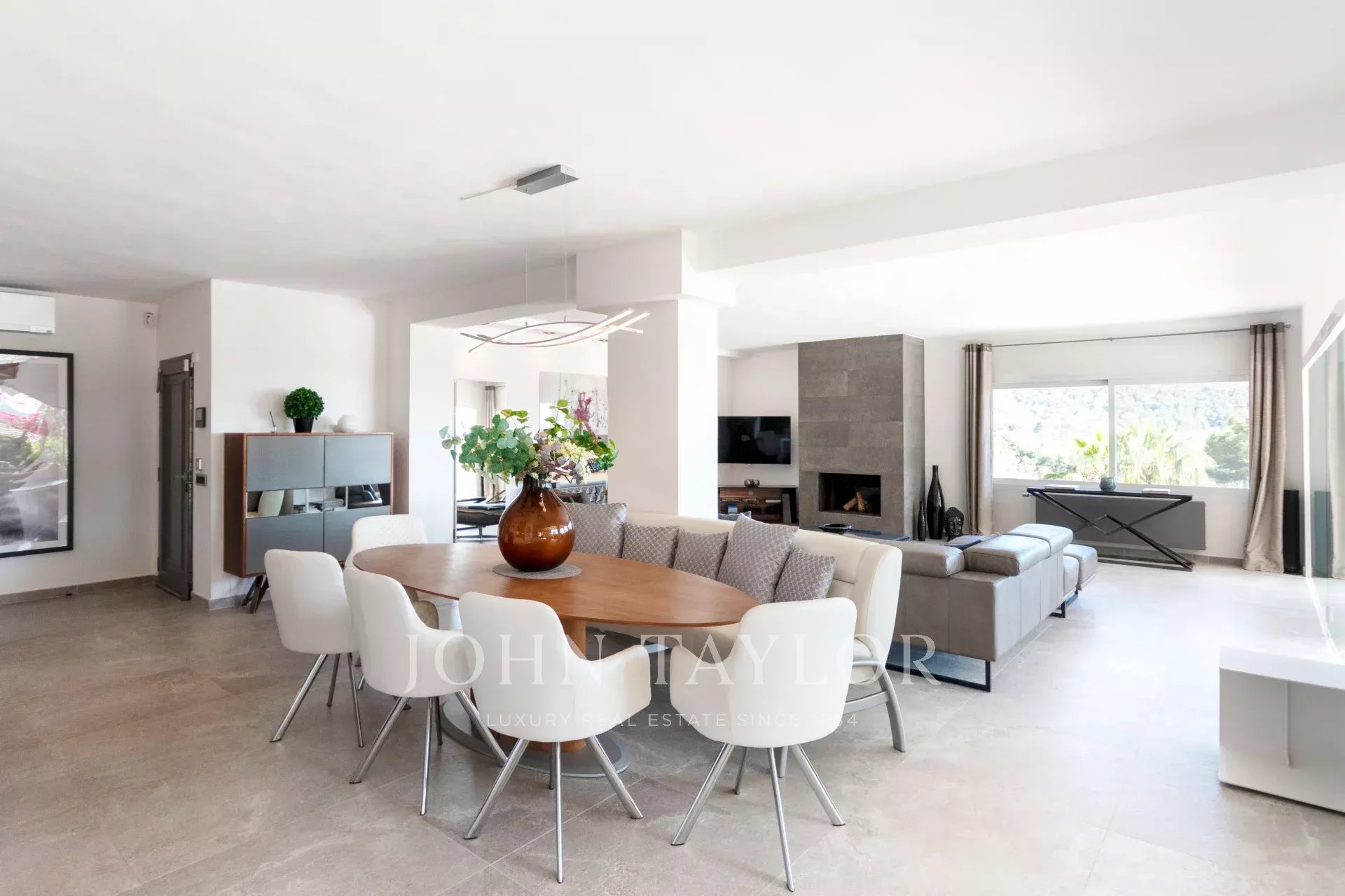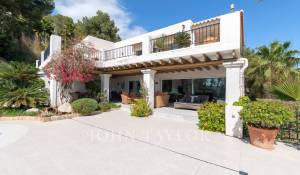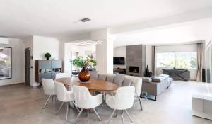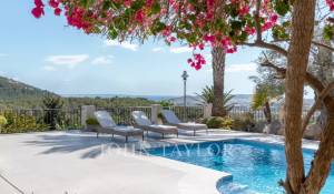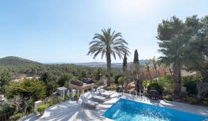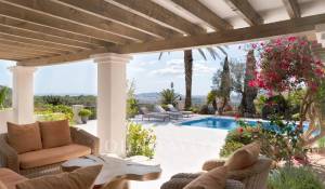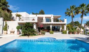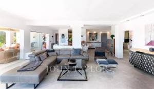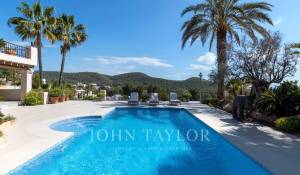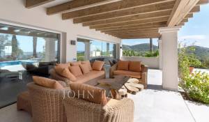 Das geräumige Wohn-Esszimmer bietet Zugang zu einer großen Terrasse mit Swimmingpool und einem atemberaubenden Blick auf die Berge und Ibiza. Die offene, aber diskret gelegene Küche verleiht dem Raum einen modernen und funktionalen Touch.
